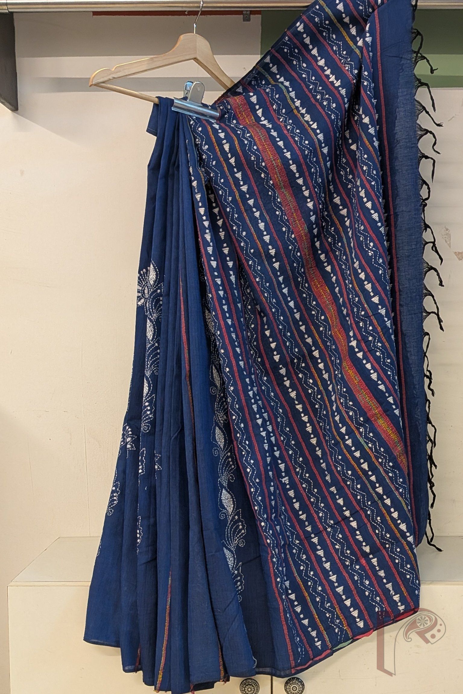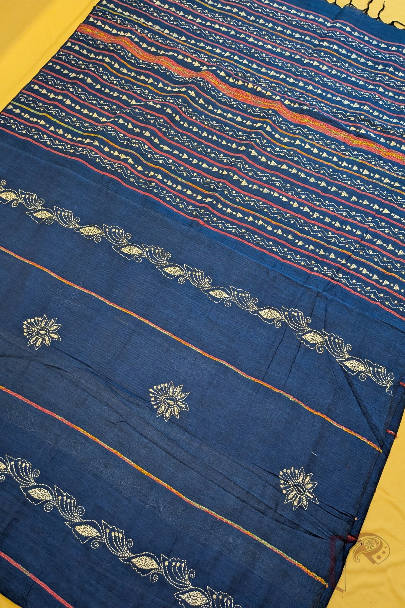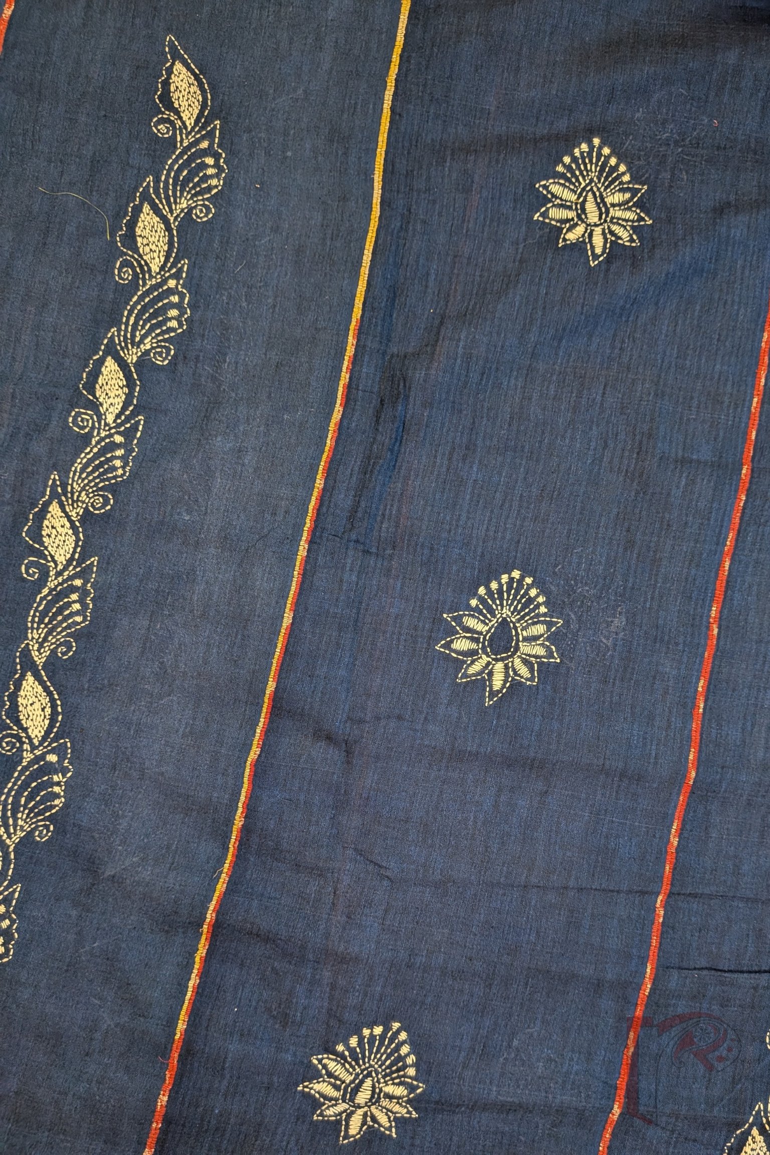 What makes these sarees even more enchanting is the age-old Kantha embroidery—an artistic expression passed down generations, typically crafted by rural women of Bengal. This collection showcases hand-done Kantha work that ranges from minimal to intricate detailing, rendered in floral, geometric, and symbolic motifs. Each saree takes hours—if not days—of meticulous hand embroidery, turning every piece into a canvas of cultural storytelling. The dense stitches and harmonious color palettes add layers of depth and grace, making them suitable for both everyday elegance and festive charm.
