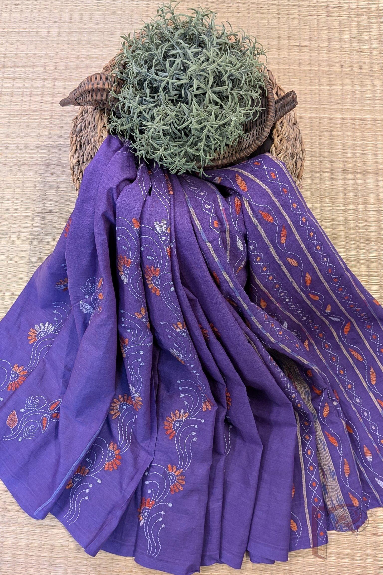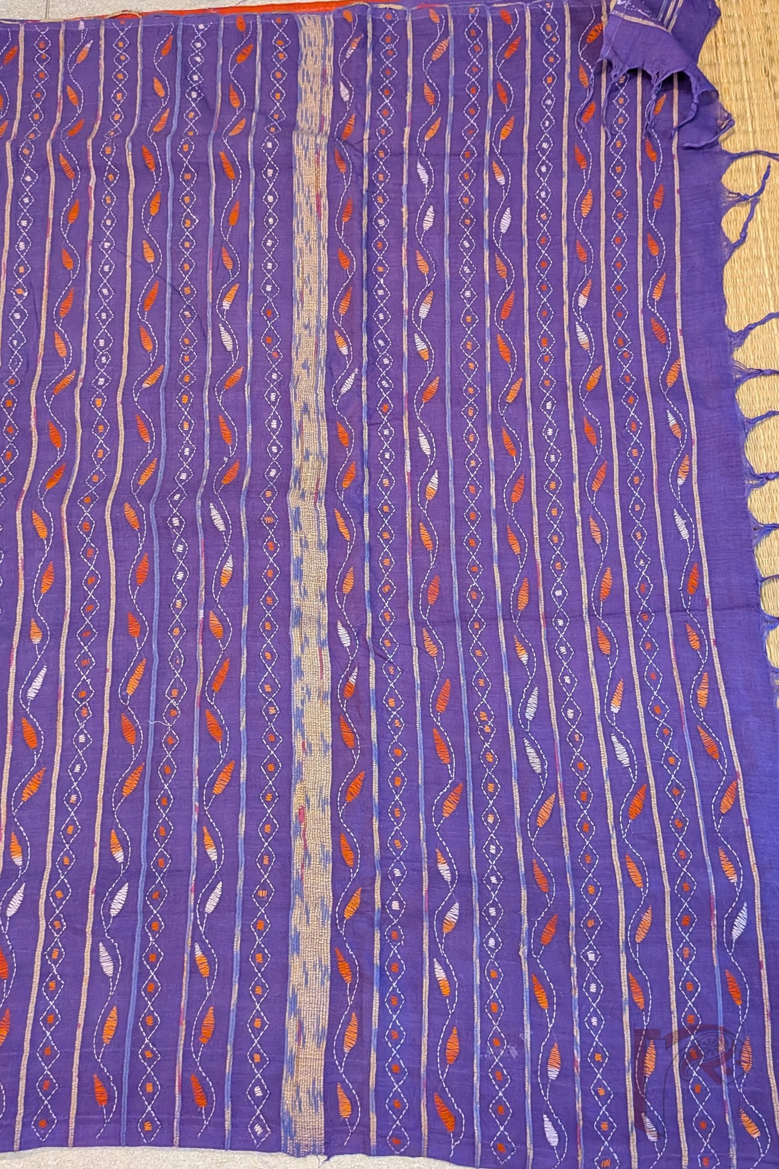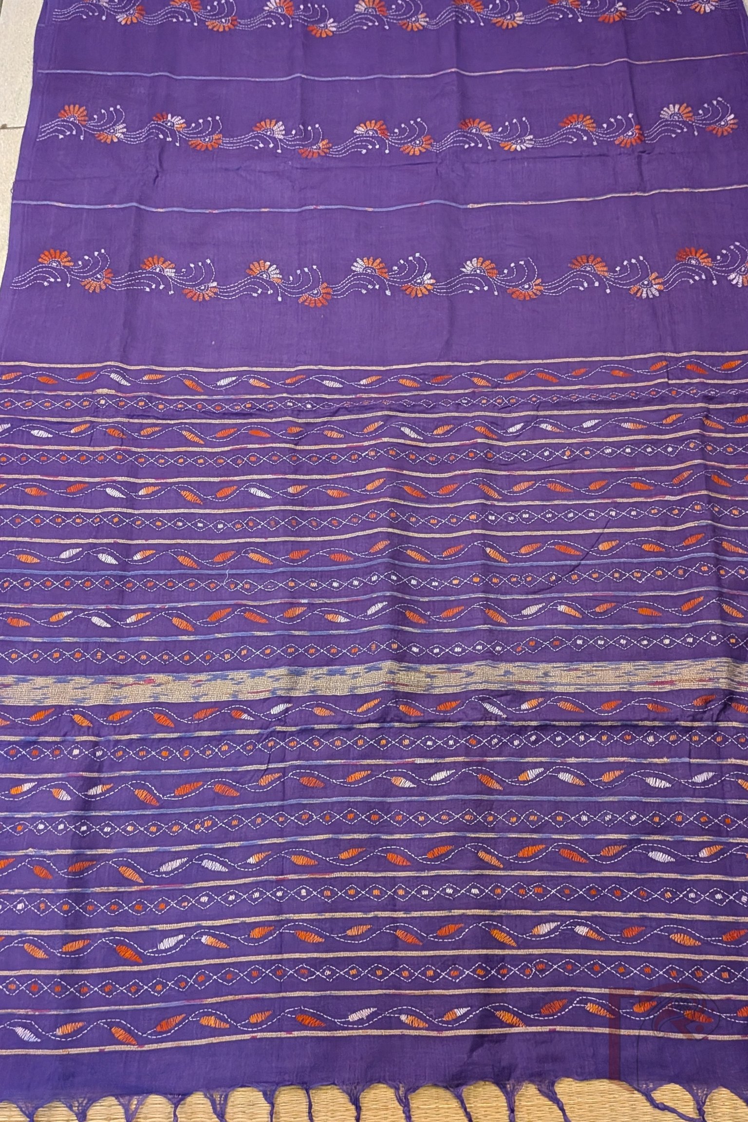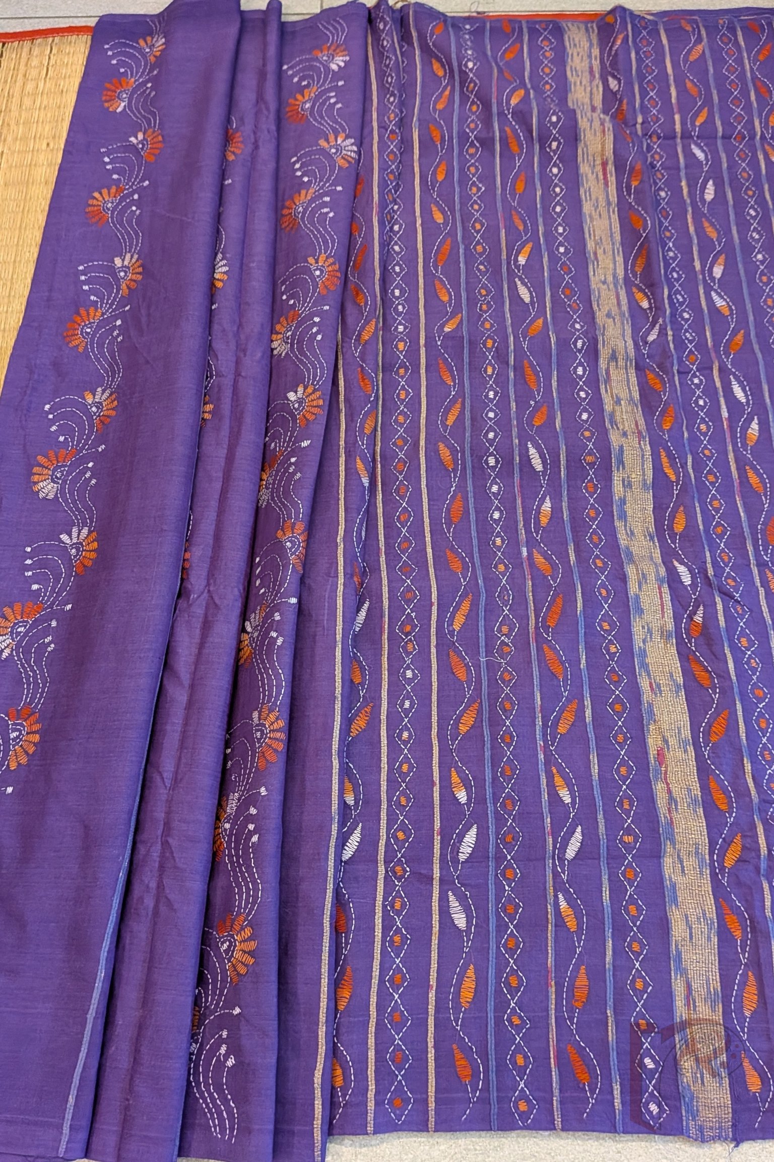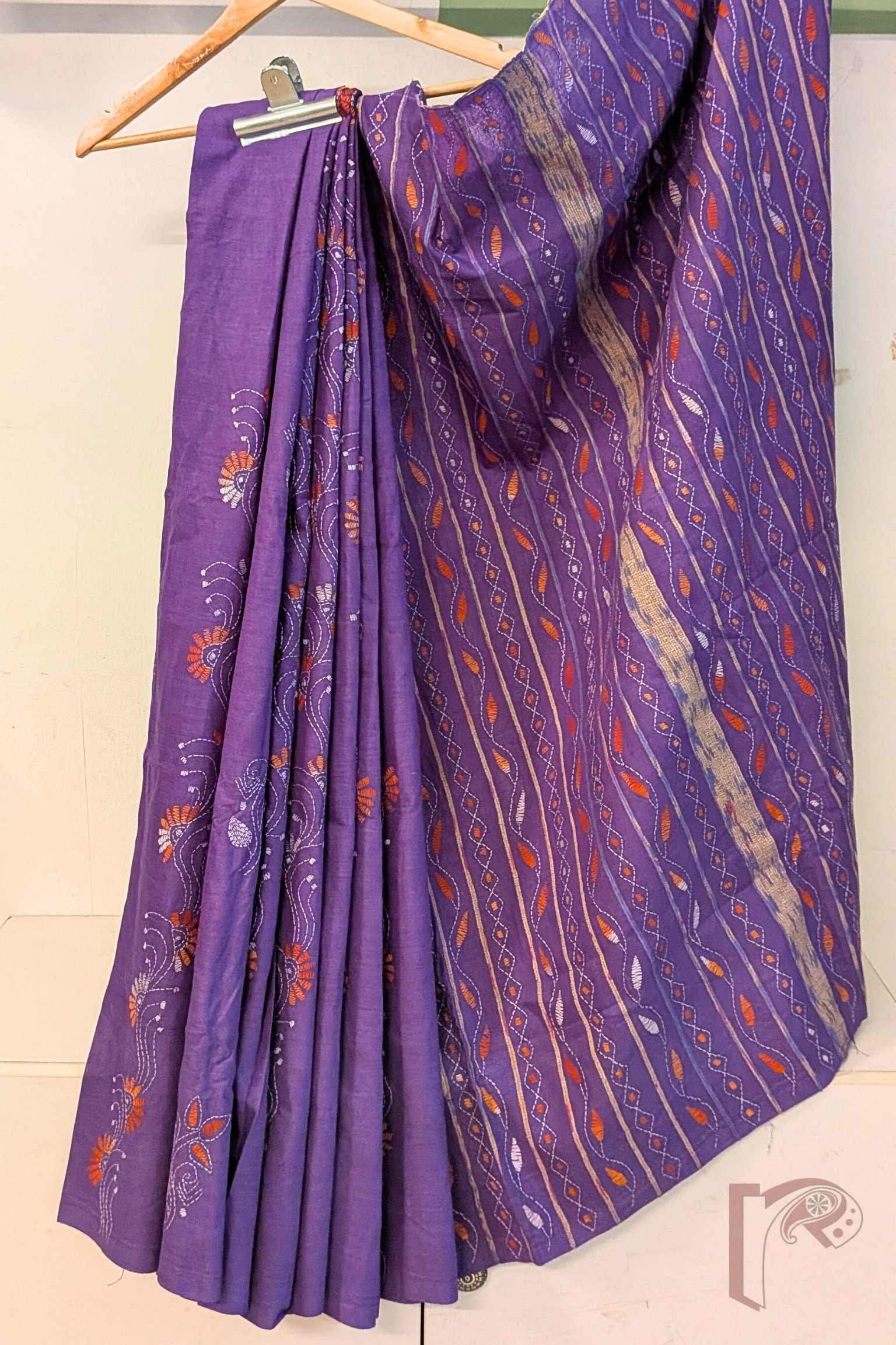What makes these sarees even more enchanting is the age-old Kantha embroidery—an artistic expression passed down generations, typically crafted by rural women of Bengal. This collection showcases hand-done Kantha work that ranges from minimal to intricate detailing, rendered in floral, geometric, and symbolic motifs. Each saree takes hours—if not days—of meticulous hand embroidery, turning every piece into a canvas of cultural storytelling. The dense stitches and harmonious color palettes add layers of depth and grace, making them suitable for both everyday elegance and festive charm.