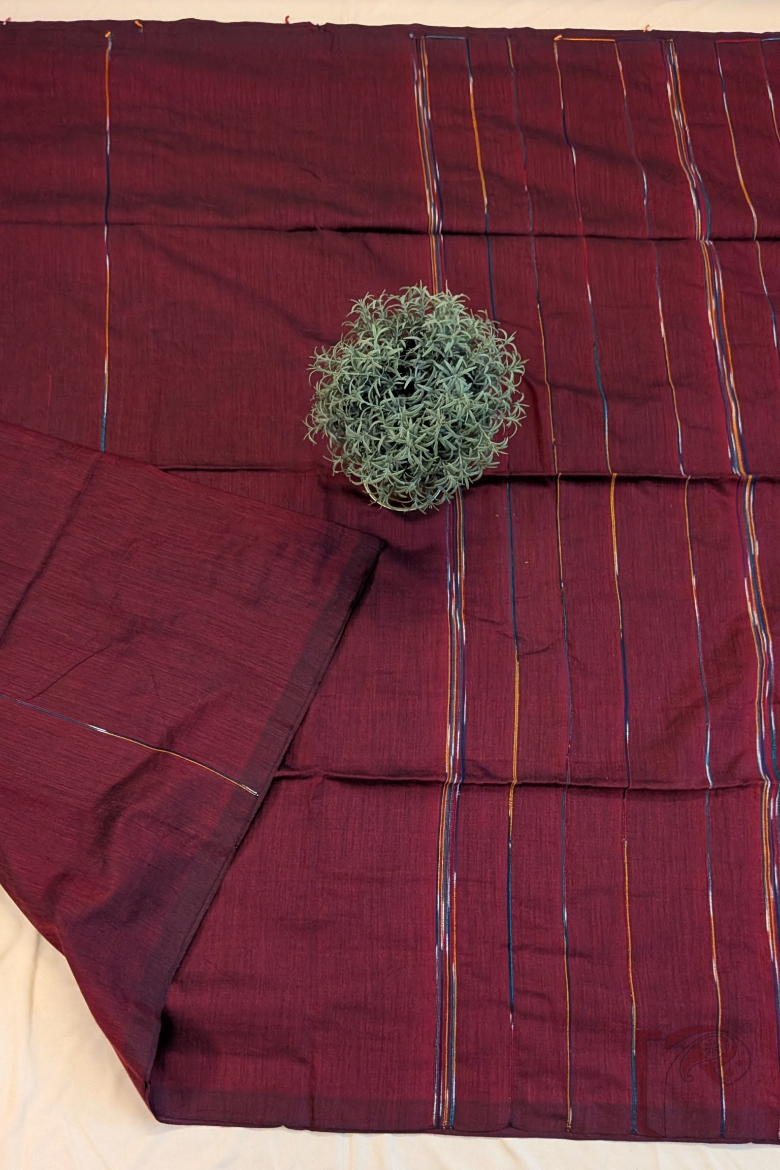 This smart maroon Khesh cotton saree is a beautiful reflection of refined simplicity and handloom artistry. The saree features a plain maroon base enhanced with spaced multicolour woven thread lines that lend a gentle rhythm to the fabric. On the pallu, the same lines appear closely arranged, creating a bold handcrafted highlight that complements the rich tone of the saree. Woven using the traditional Khesh technique, the fabric carries a rustic texture and a unique artisanal story, making each piece distinctive. The saree pairs wonderfully with printed or Kantha embroidered blouses, offering a stylish yet timeless ensemble.