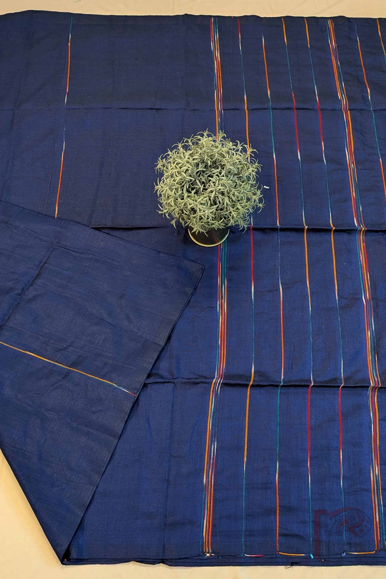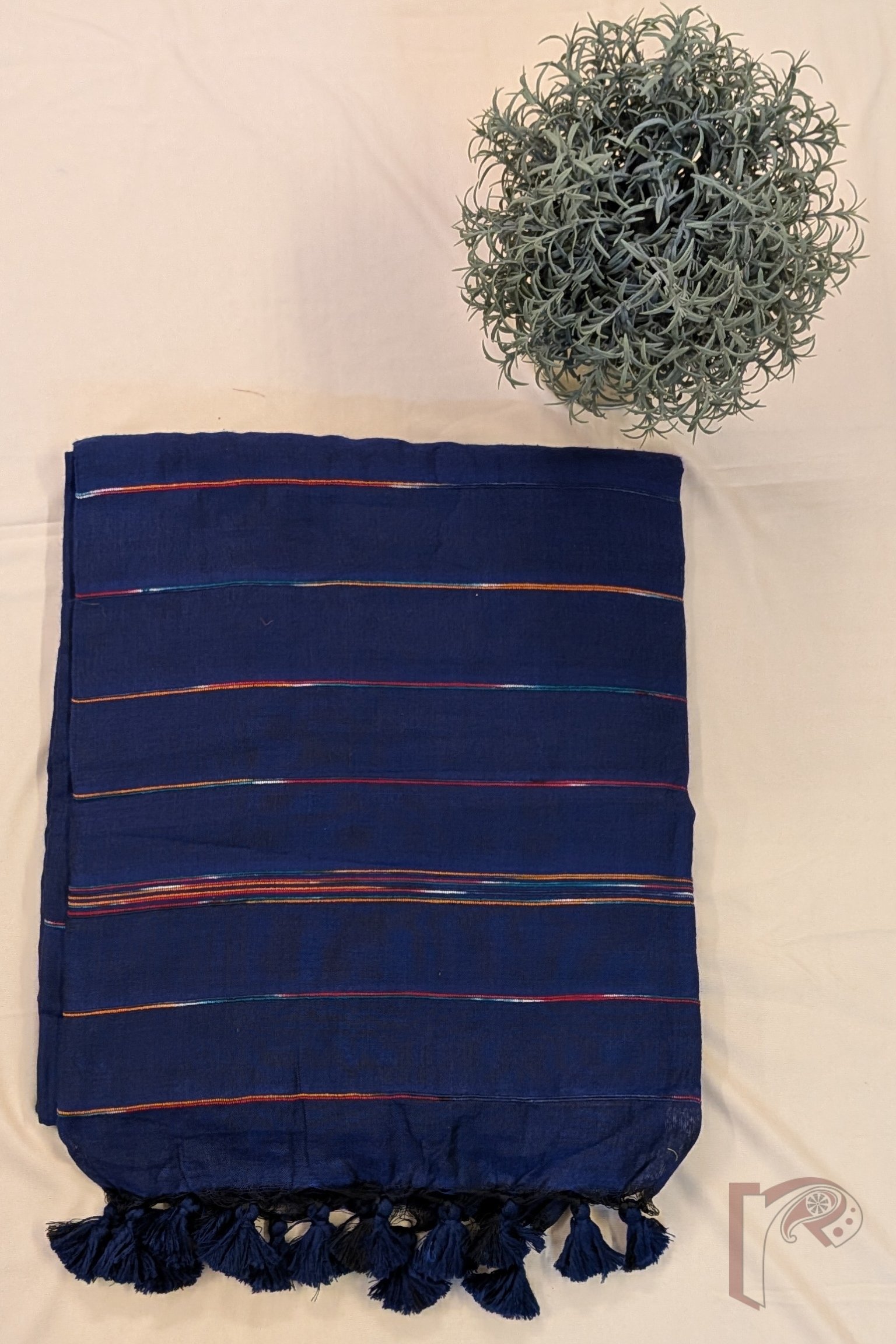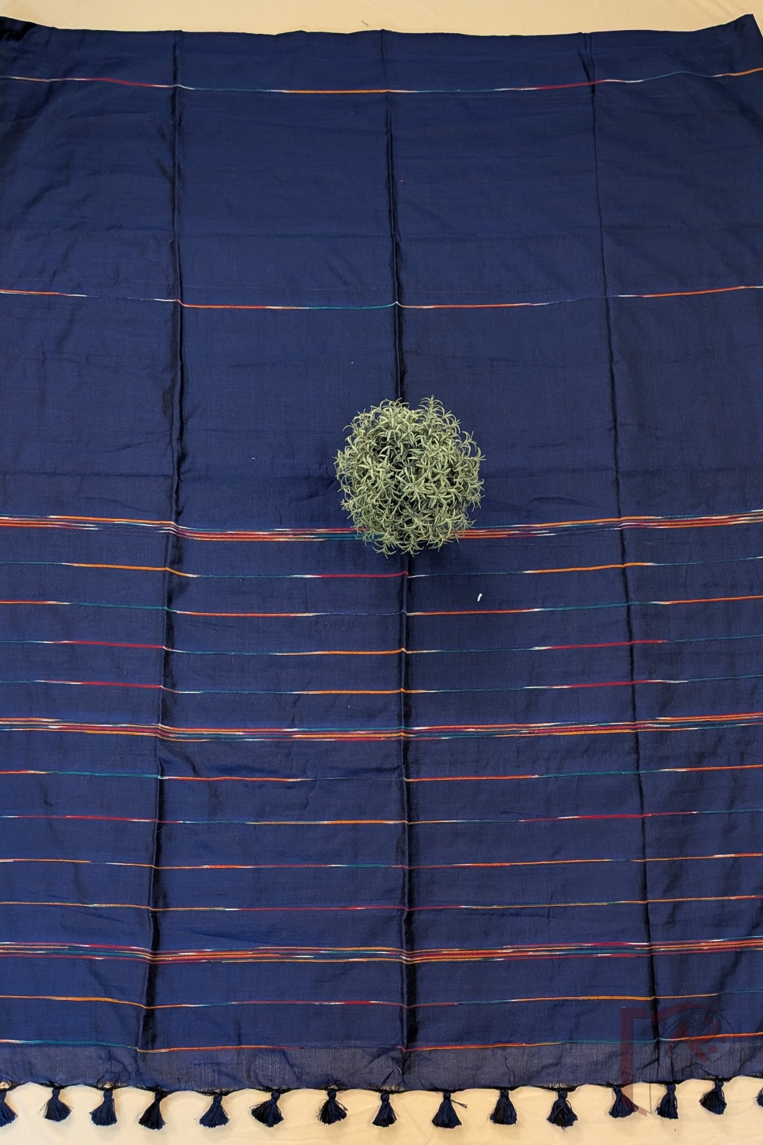 This smart navy blue Khesh cotton saree is a classic expression of understated elegance. The deep blue base is accentuated with subtle multicolour woven thread lines that appear across the body at regular intervals, giving the saree a refined handcrafted character. The pallu showcases closely spaced woven lines, adding depth and contrast to the overall design. Handwoven using the Khesh technique, the saree carries a distinct rustic texture and sustainable craft heritage that makes it truly special. Pair it with vibrant printed or Kantha embroidered blouses to create a stylish yet timeless look.