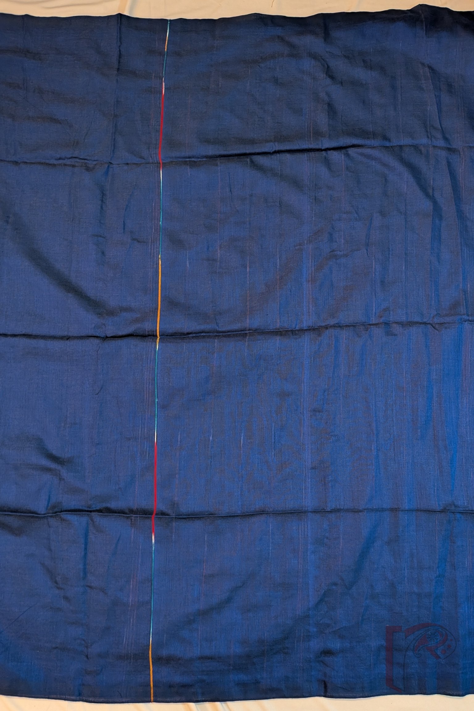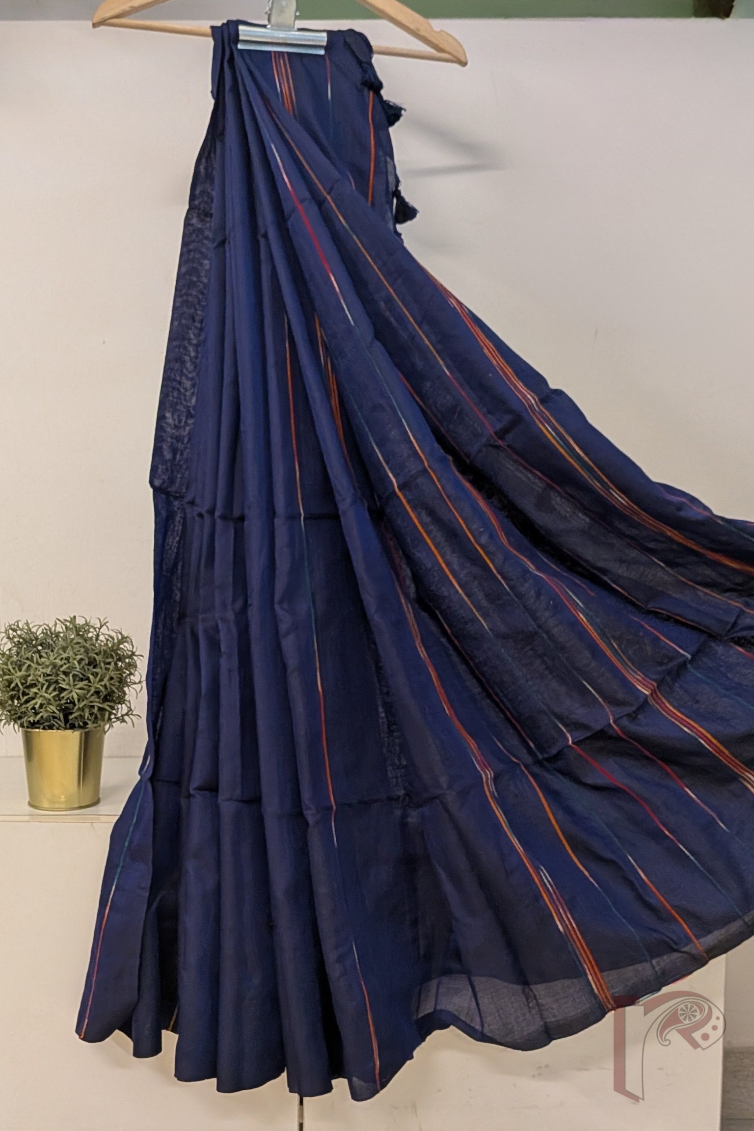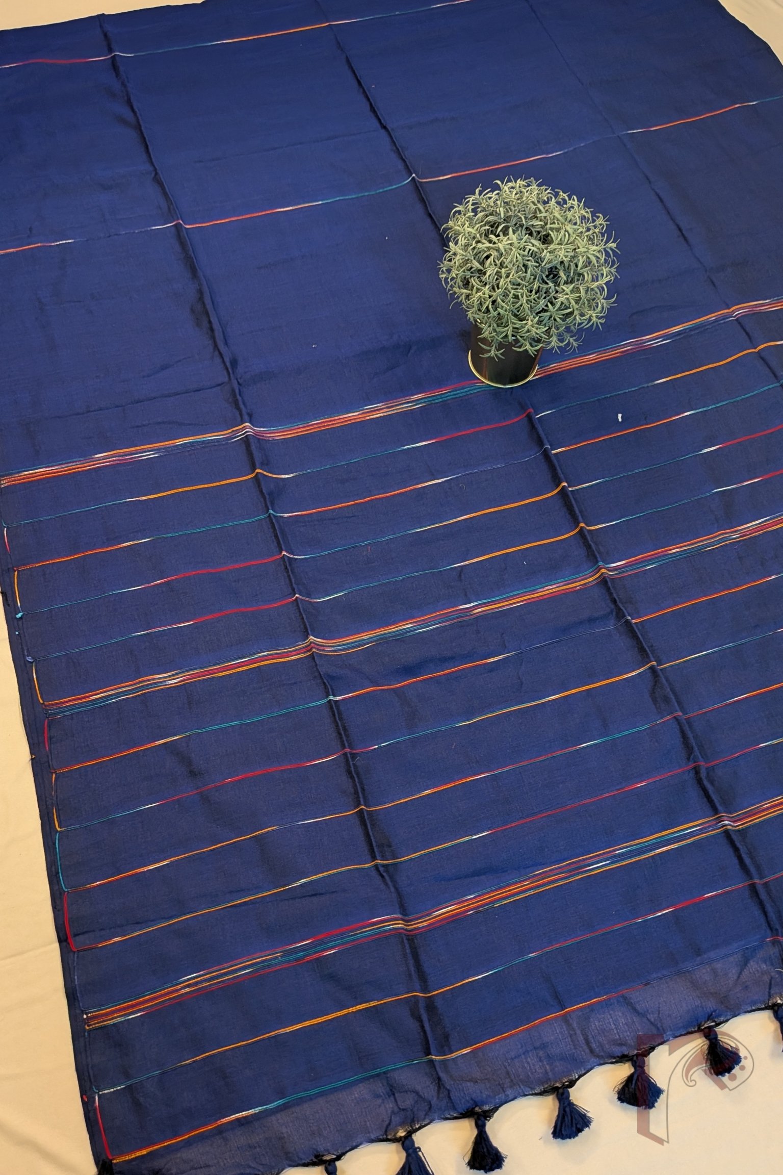 This smart navy blue Khesh cotton saree is a classic expression of understated elegance. The deep blue base is accentuated with subtle multicolour woven thread lines that appear across the body at regular intervals, giving the saree a refined handcrafted character. The pallu showcases closely spaced woven lines, adding depth and contrast to the overall design. Handwoven using the Khesh technique, the saree carries a distinct rustic texture and sustainable craft heritage that makes it truly special. Pair it with vibrant printed or Kantha embroidered blouses to create a stylish yet timeless look.