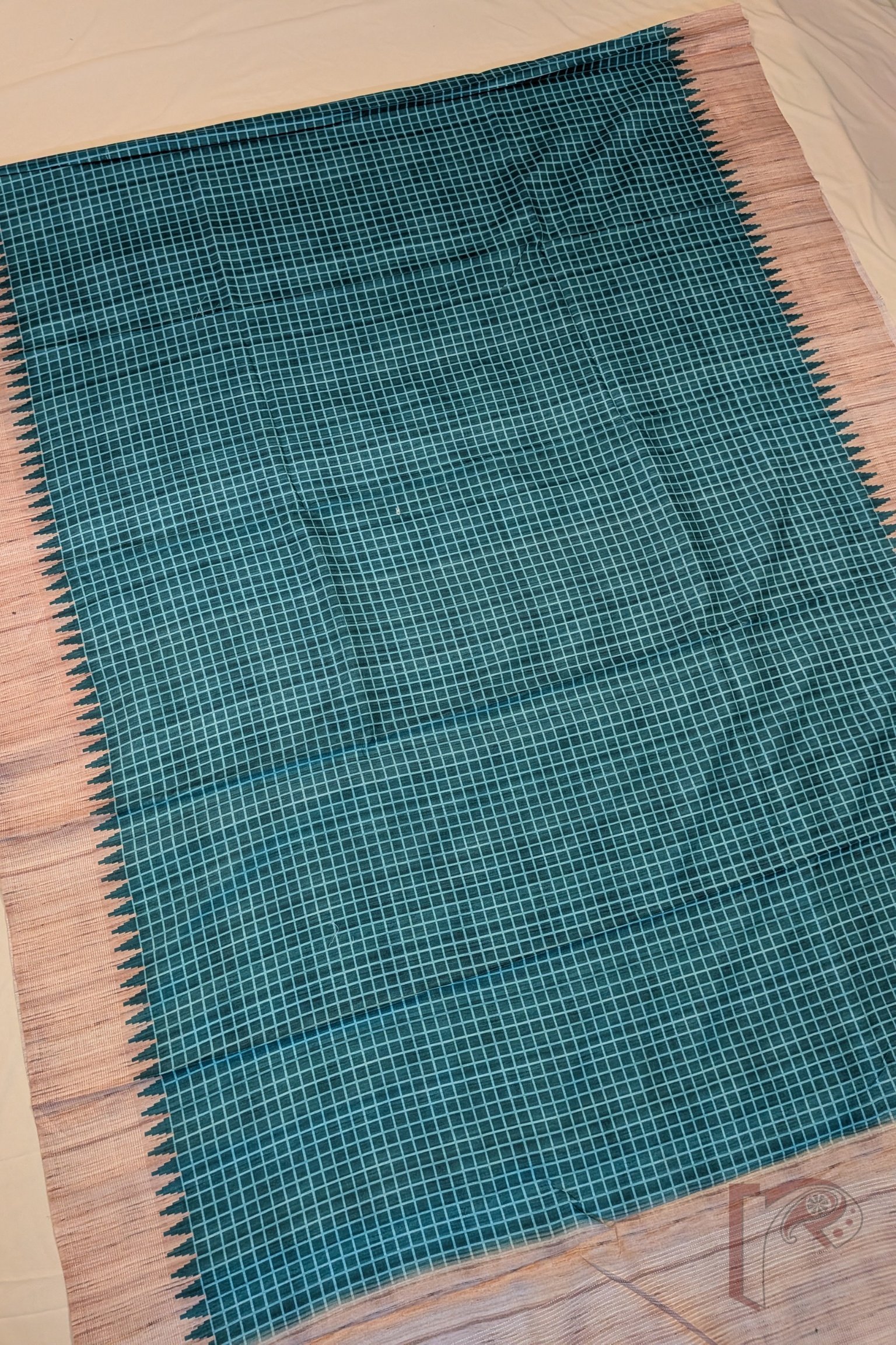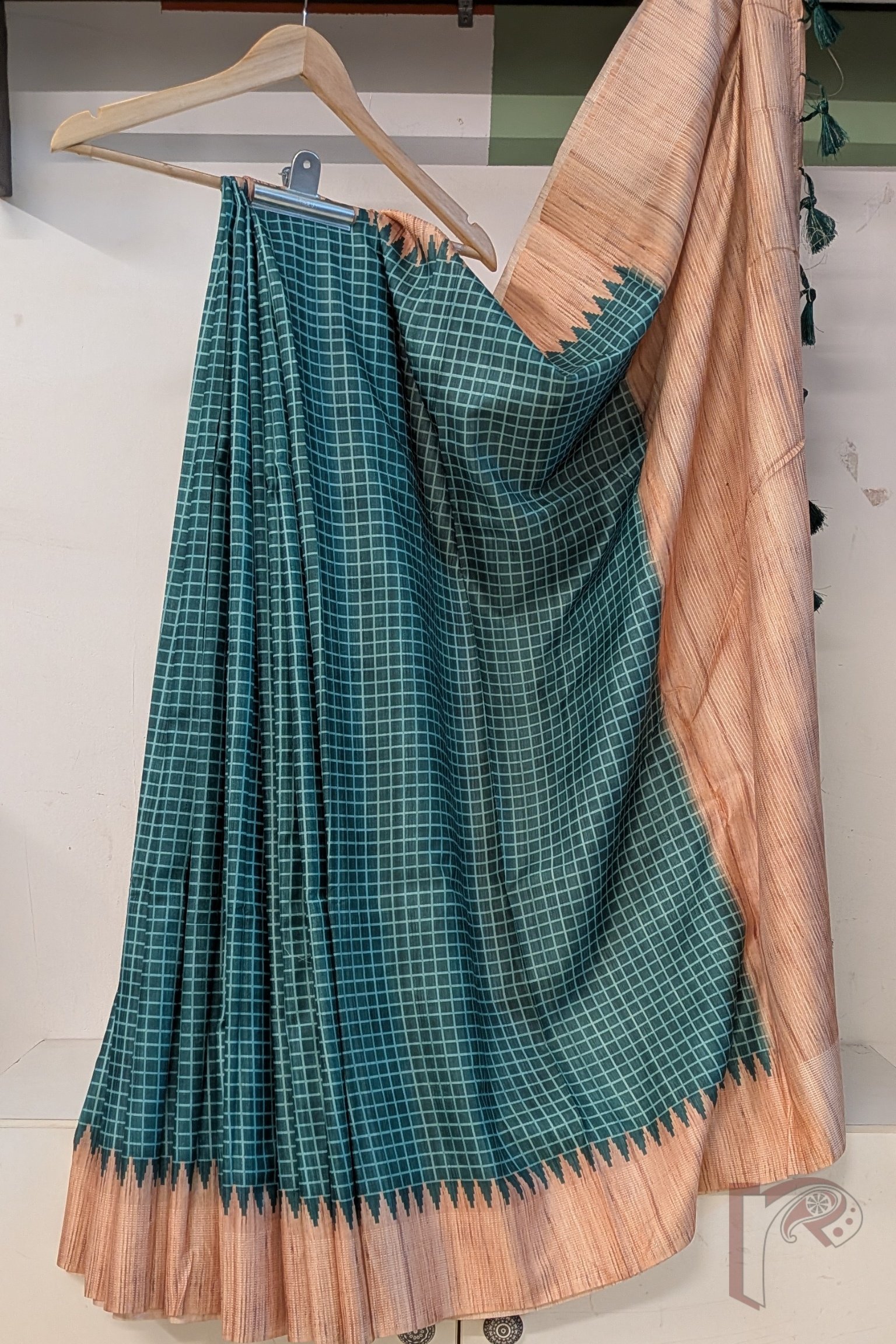 This emerald green and fawn natural Kosa silk saree is a graceful expression of nature-inspired elegance and timeless craftsmanship, designed to highlight the subtle beauty of traditional Indian weaving. The rich emerald green body is delicately patterned with fine pista green check lines, creating a soft grid that adds texture and visual interest while maintaining an understated, refined appeal. Enhancing the saree is a beautifully woven textured fawn pallu paired with broad 4-inch borders on both sides, lending depth and artisanal richness to the drape. The borders are further elevated with a classic temple motif, adding a sacred architectural rhythm that reflects cultural heritage. Completing the ensemble is a plain textured fawn blouse, thoughtfully coordinated to harmonise with the pallu and borders while allowing the emerald-toned body to stand out. With its natural Kosa silk sheen, balanced colour palette, and intricate detailing, this saree is ideal for festive gatherings, traditional ceremonies, and elegant daytime celebrations, embodying heritage artistry, natural luxury, and timeless sophistication in every fold.