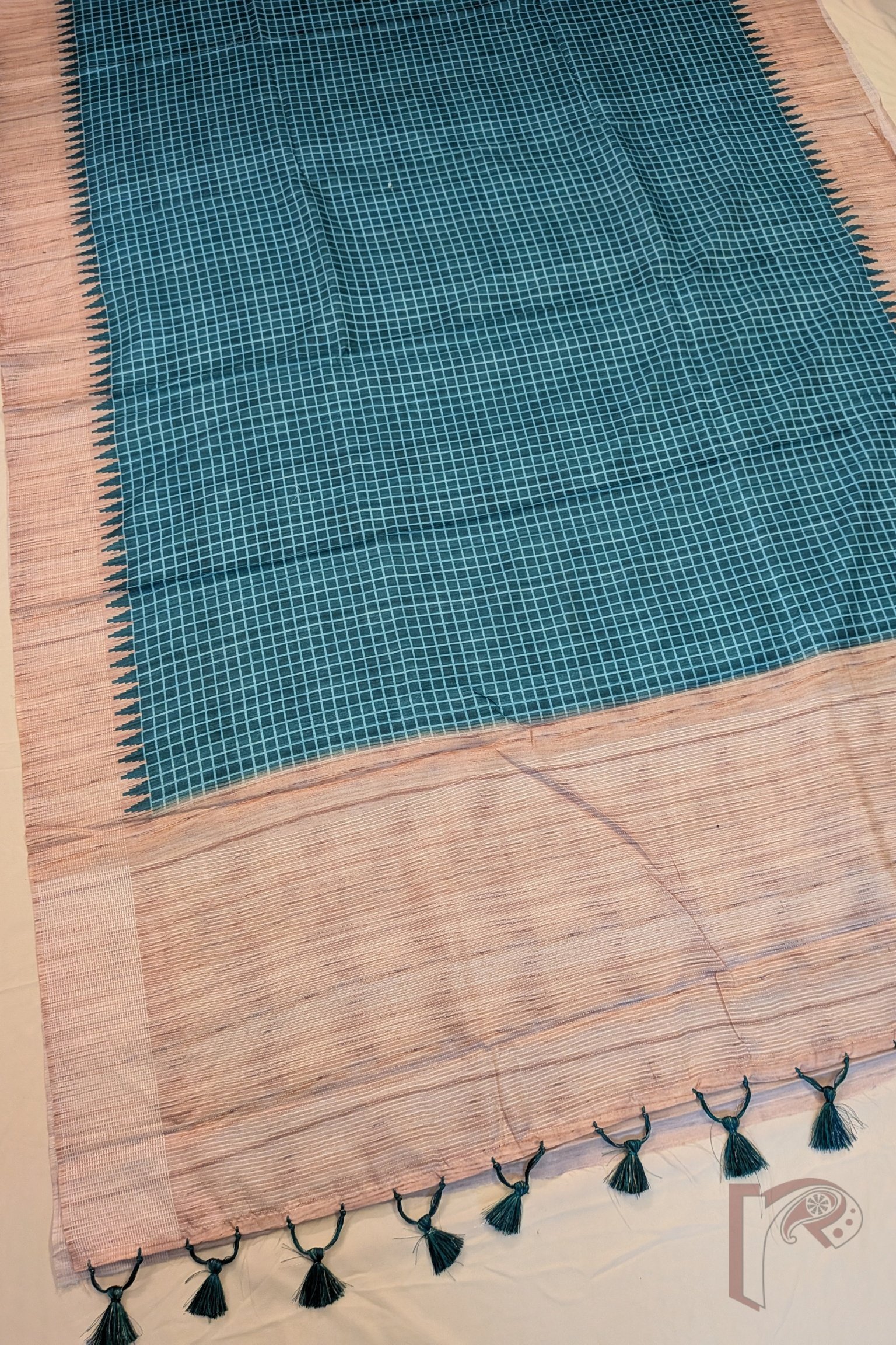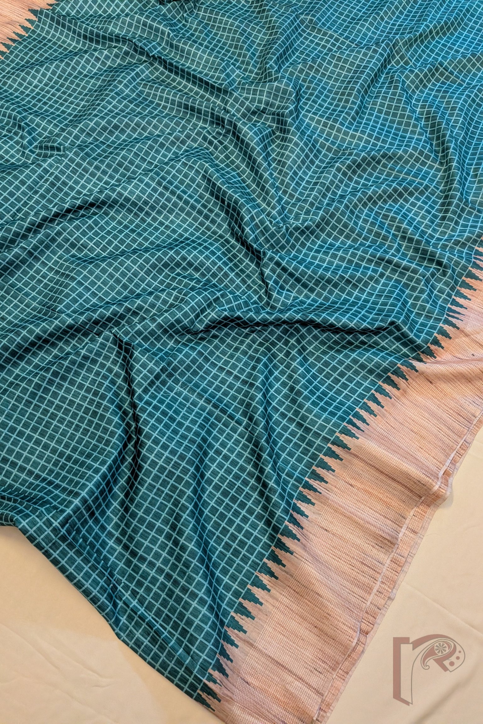 Kosa Kiran – Emerald Green and Fawn Natural Kosa Silk Saree with Pista Green Check Lines, Temple Border and Textured Pallu