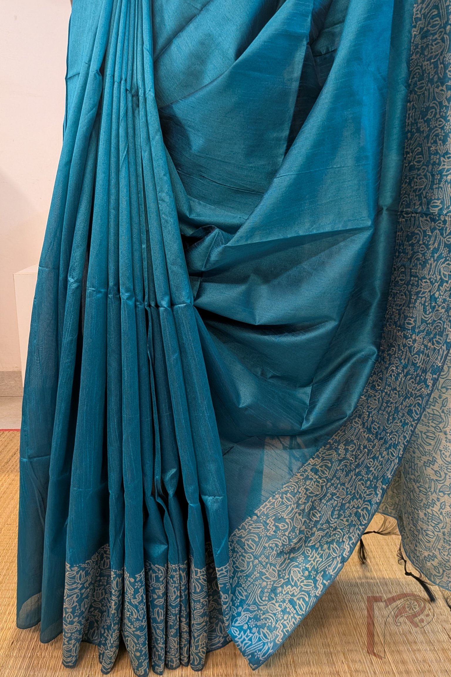 Kosa Kiran – Teal Blue Kosa Cotton Silk Saree with Cream Weave of Birds, Fish, and Folklore Motifs