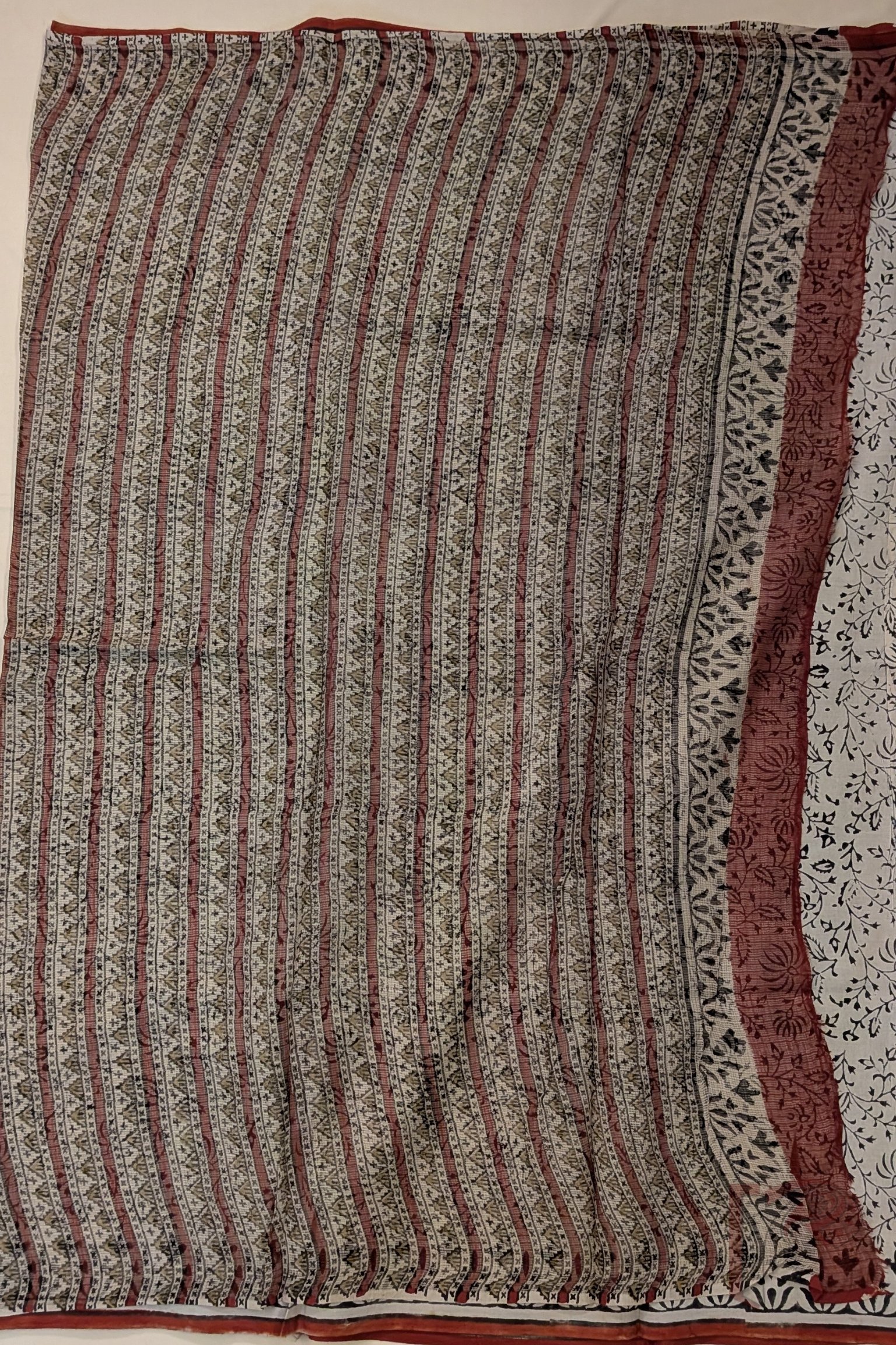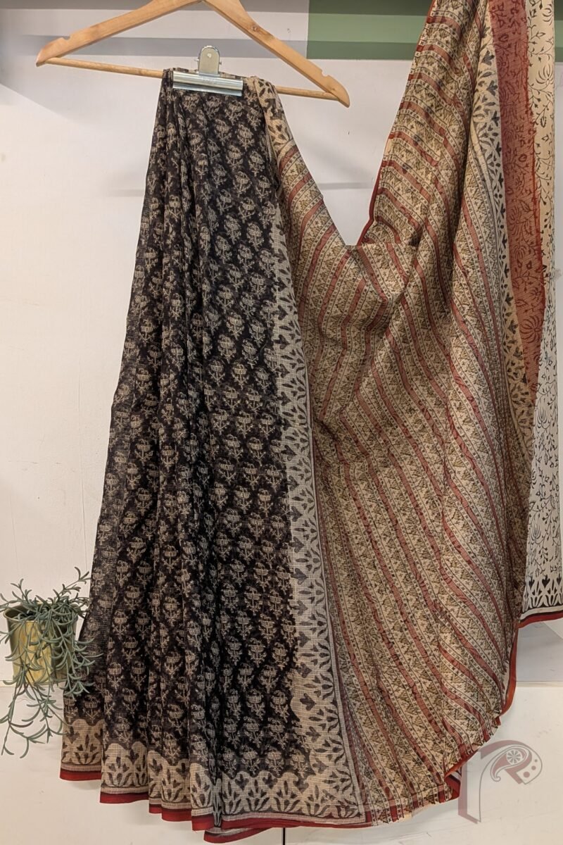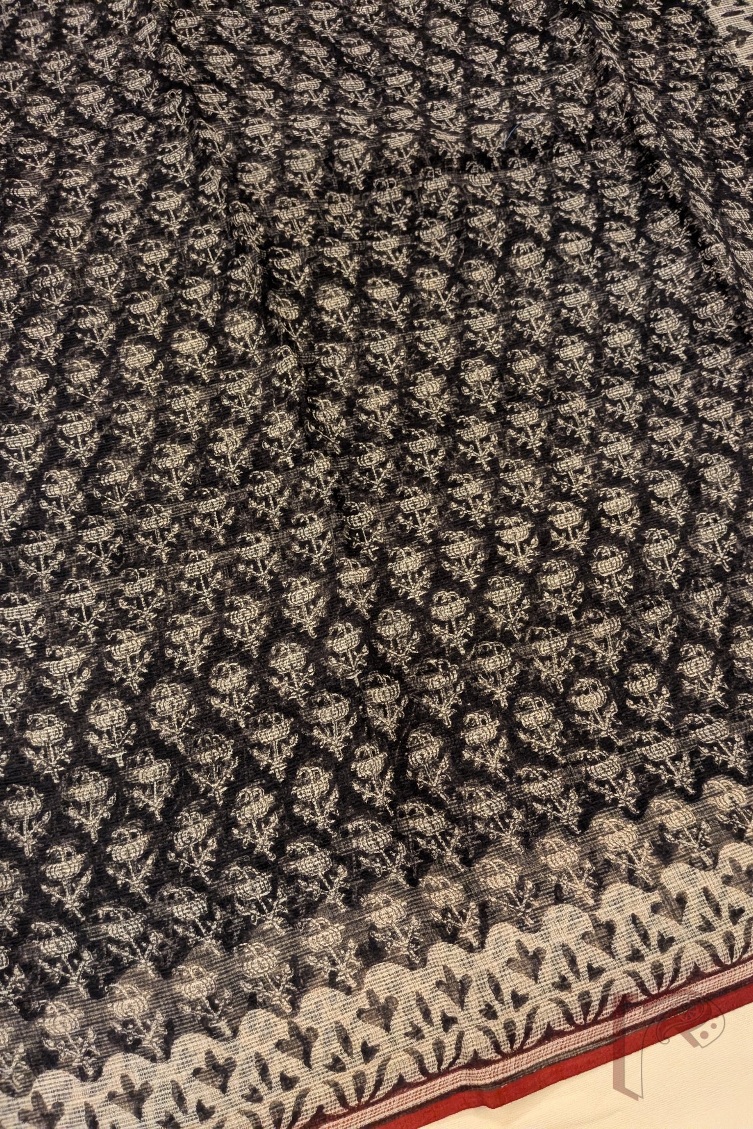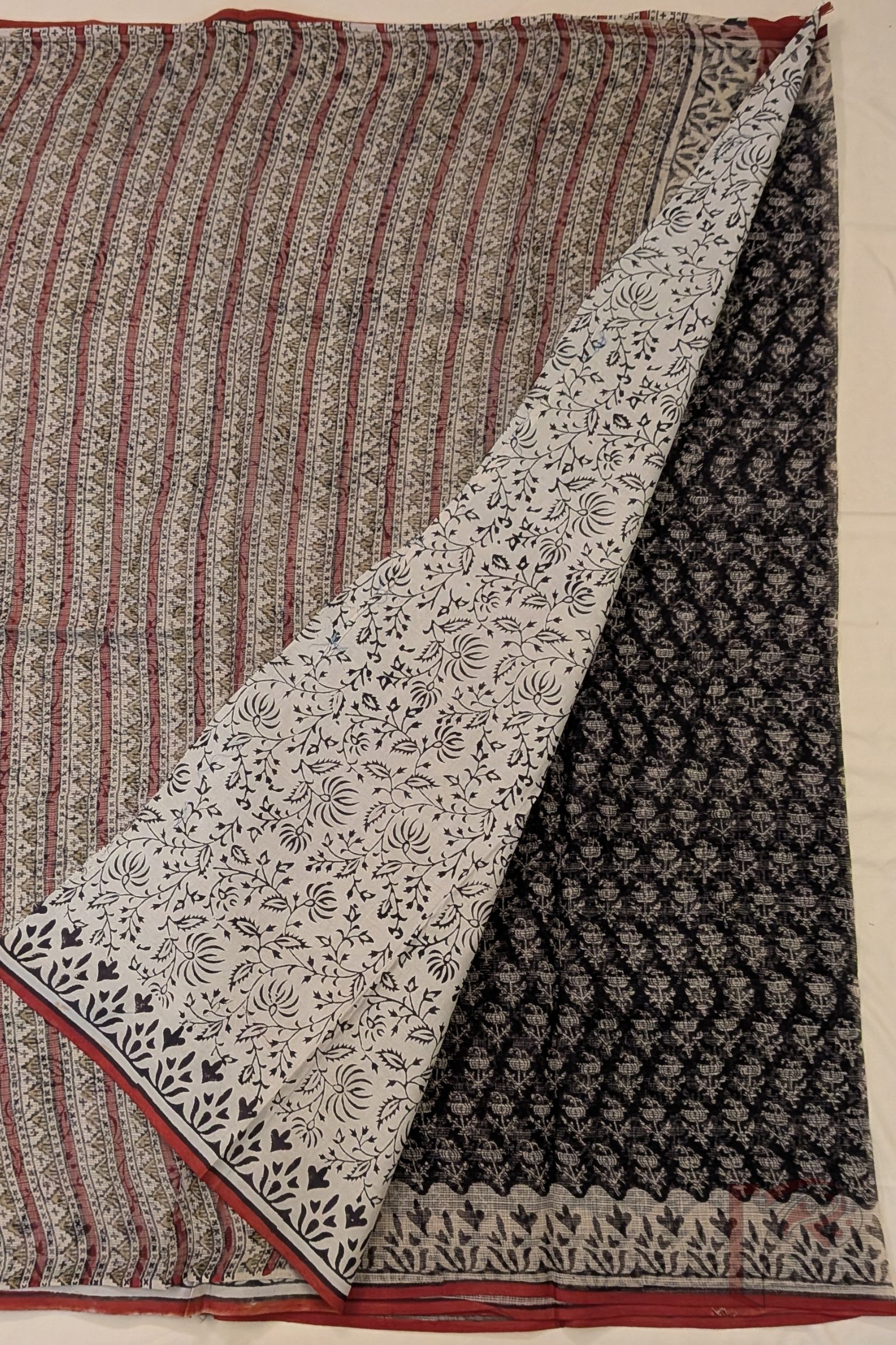 Kota Katha – Black and Cream Kota Cotton Saree with Lotus Motifs and Striped Pallu