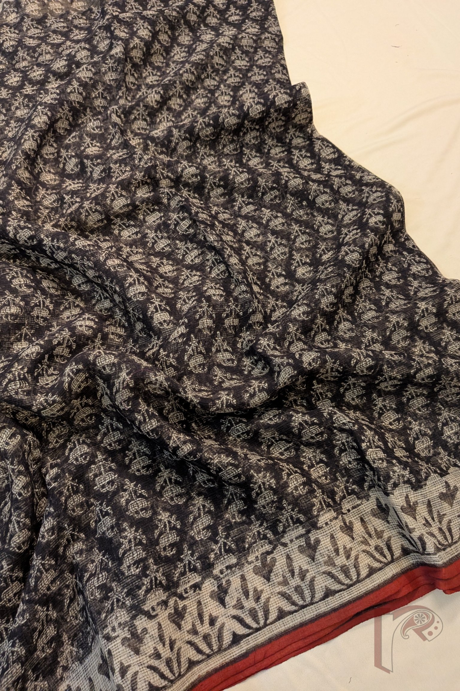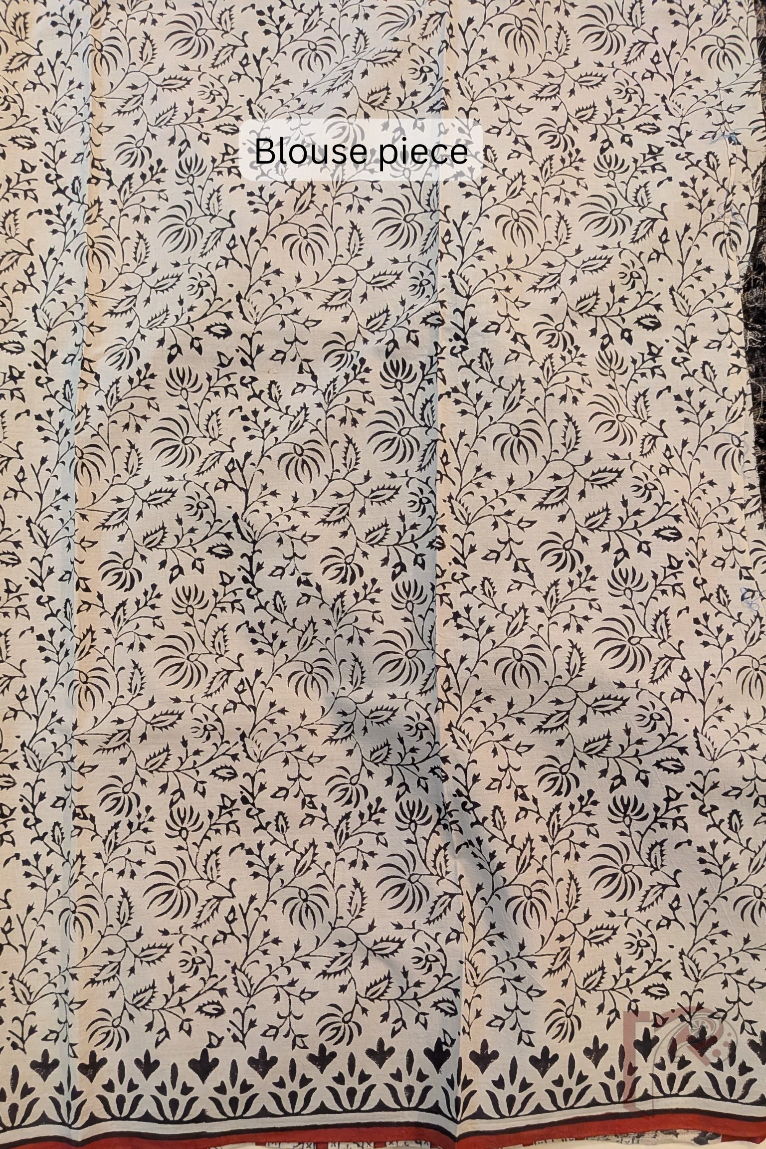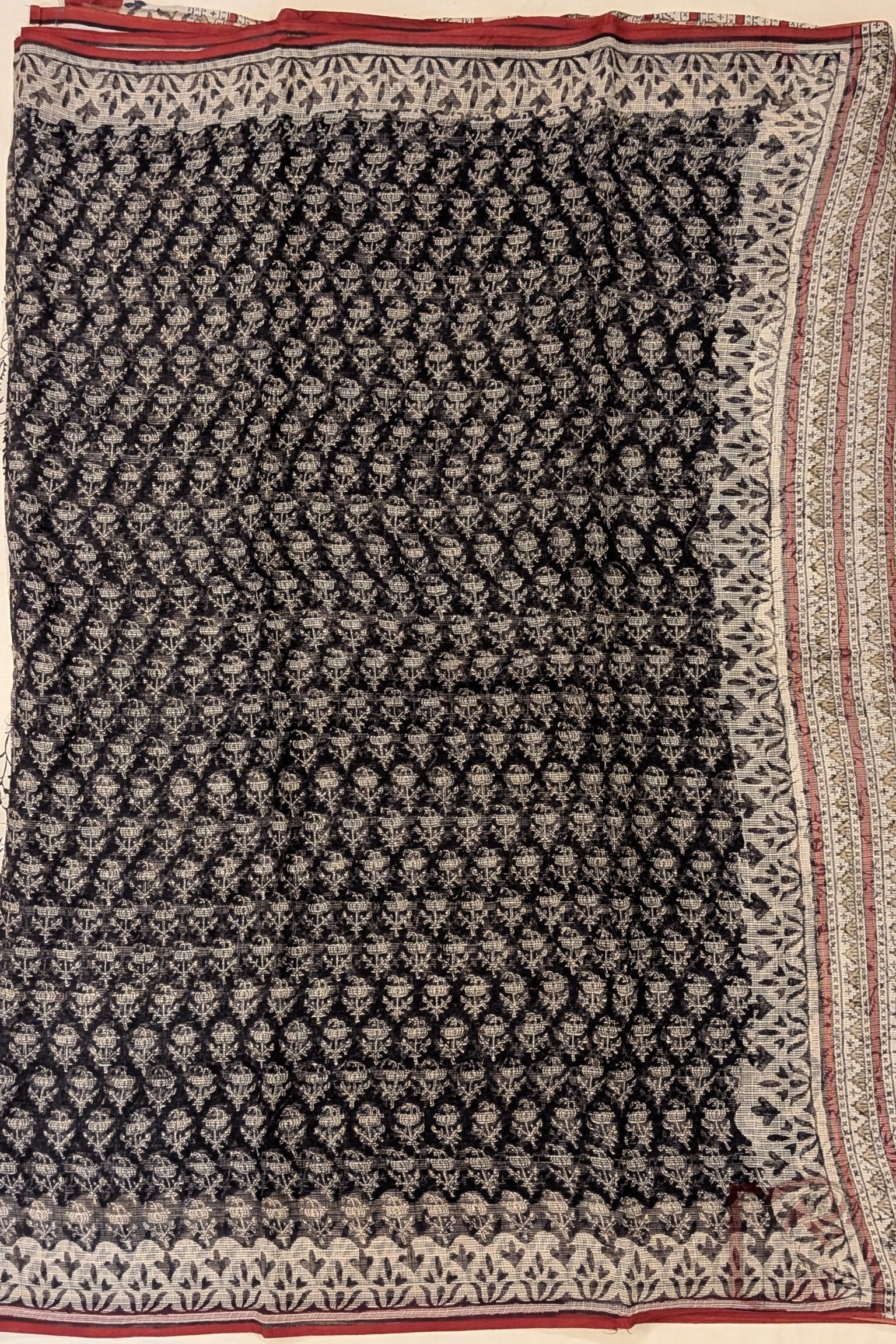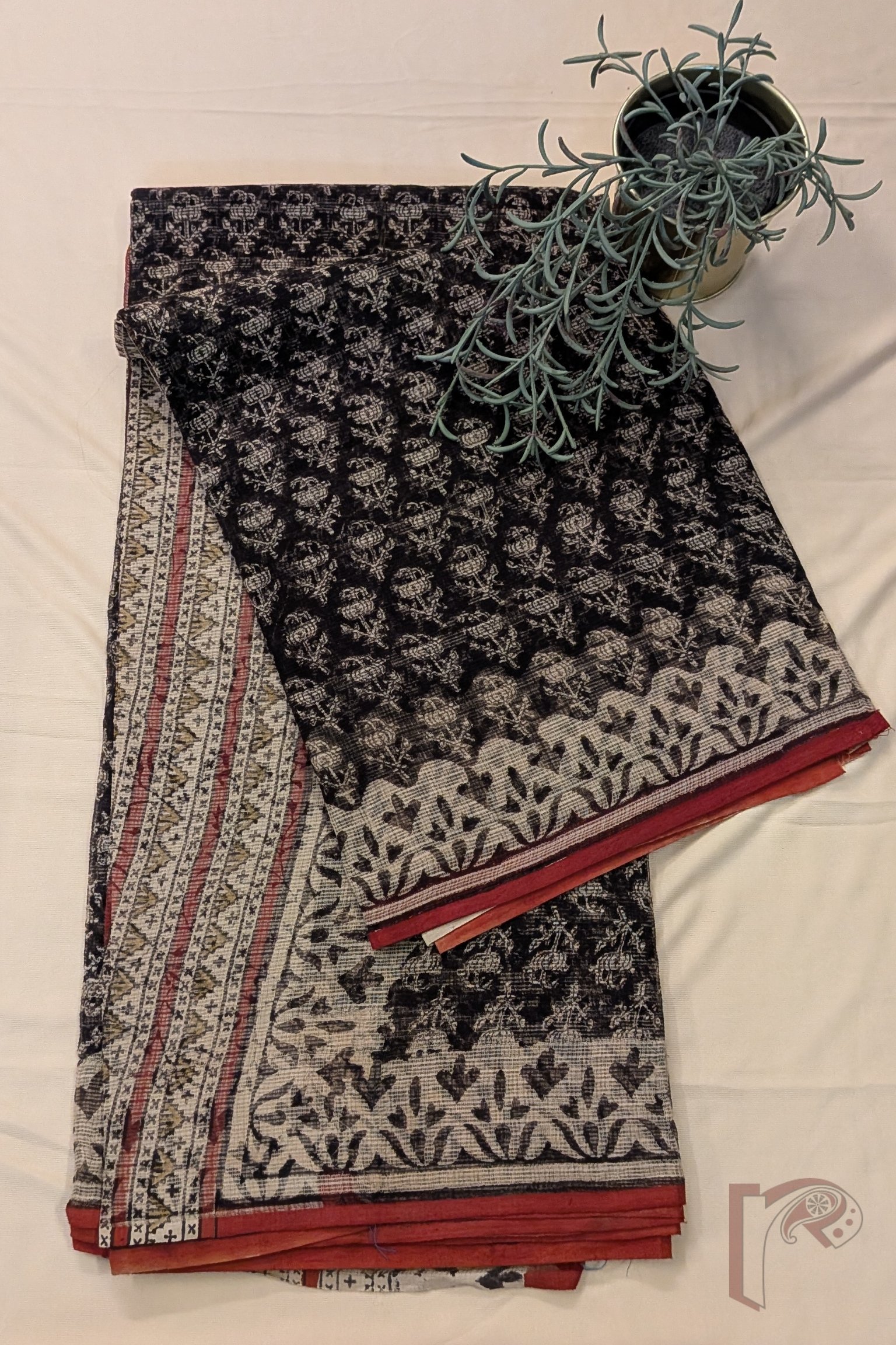 Striking and contemporary, this black and cream Kota cotton saree showcases closely placed lotus-shaped motifs across the body, balanced with patterned borders and a thin red selvage. The pallu features horizontal stripes with triangles, crosses, and red pin lines, creating a bold visual contrast. Paired with a cream blouse with black floral jaal and red edging, this saree is a perfect fusion of graphic design and traditional weave.