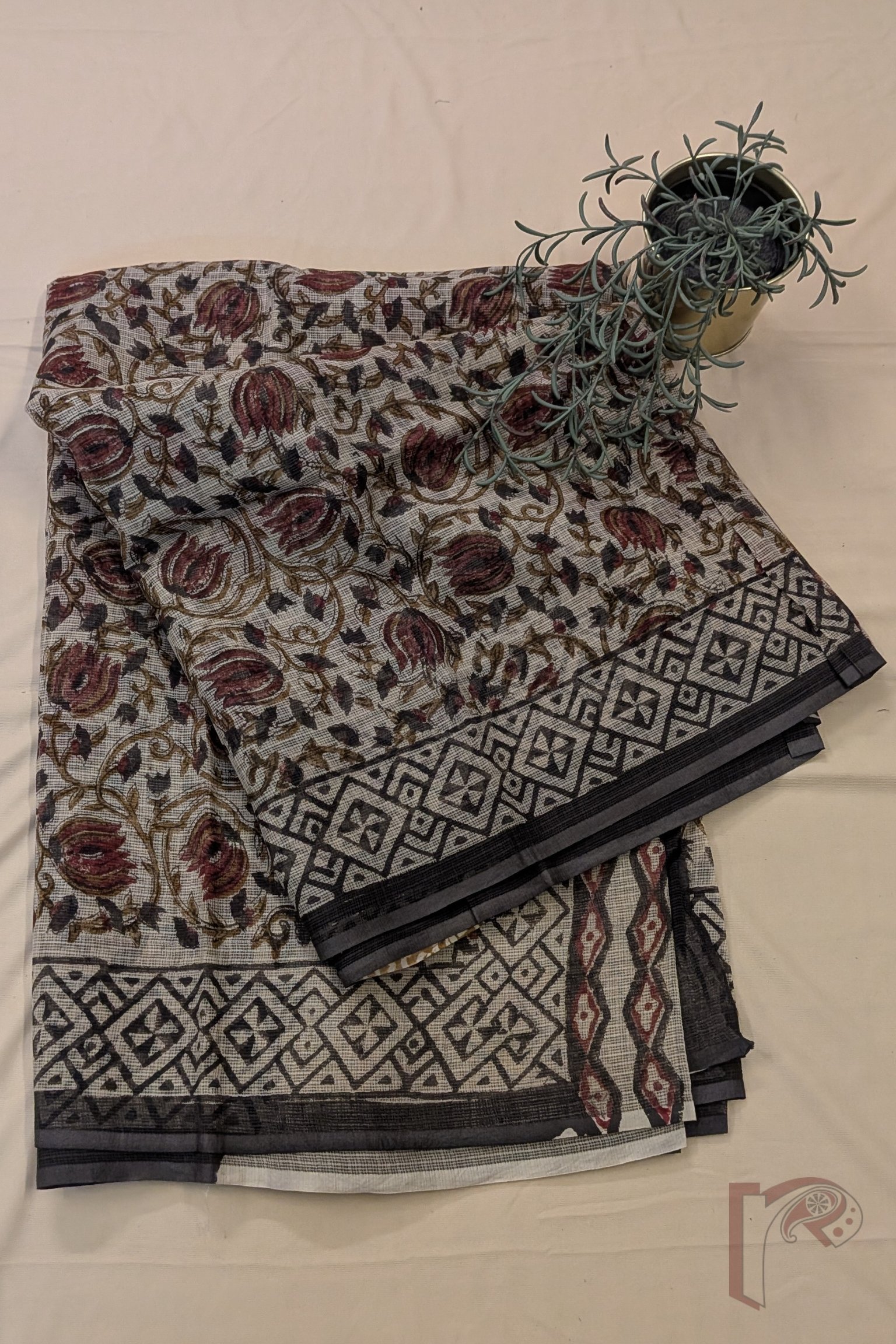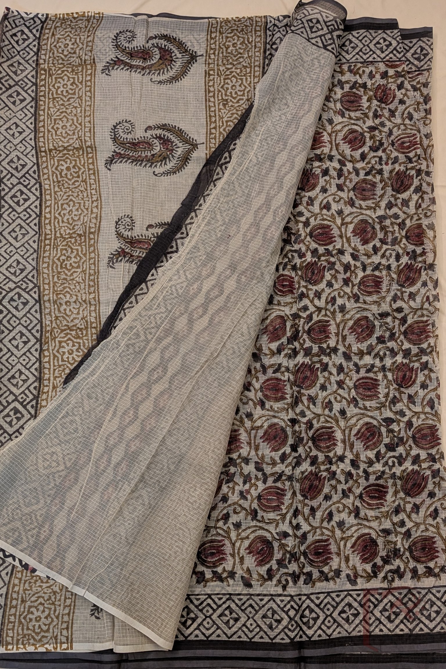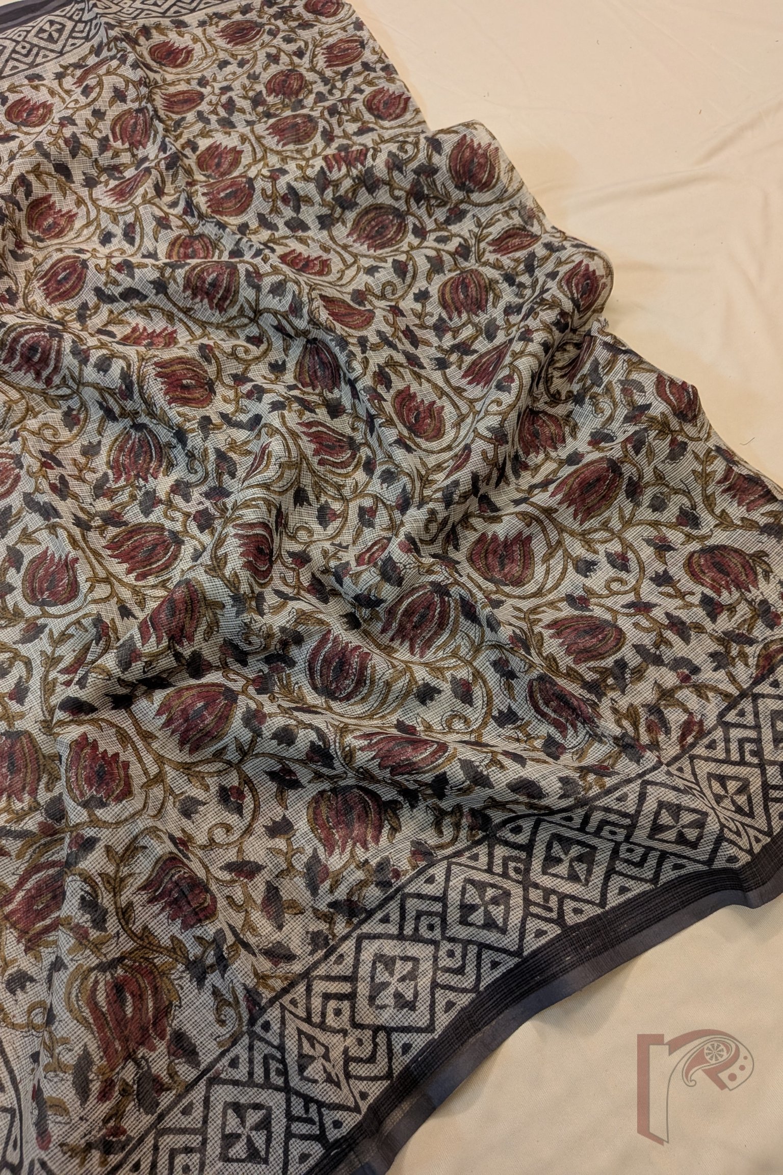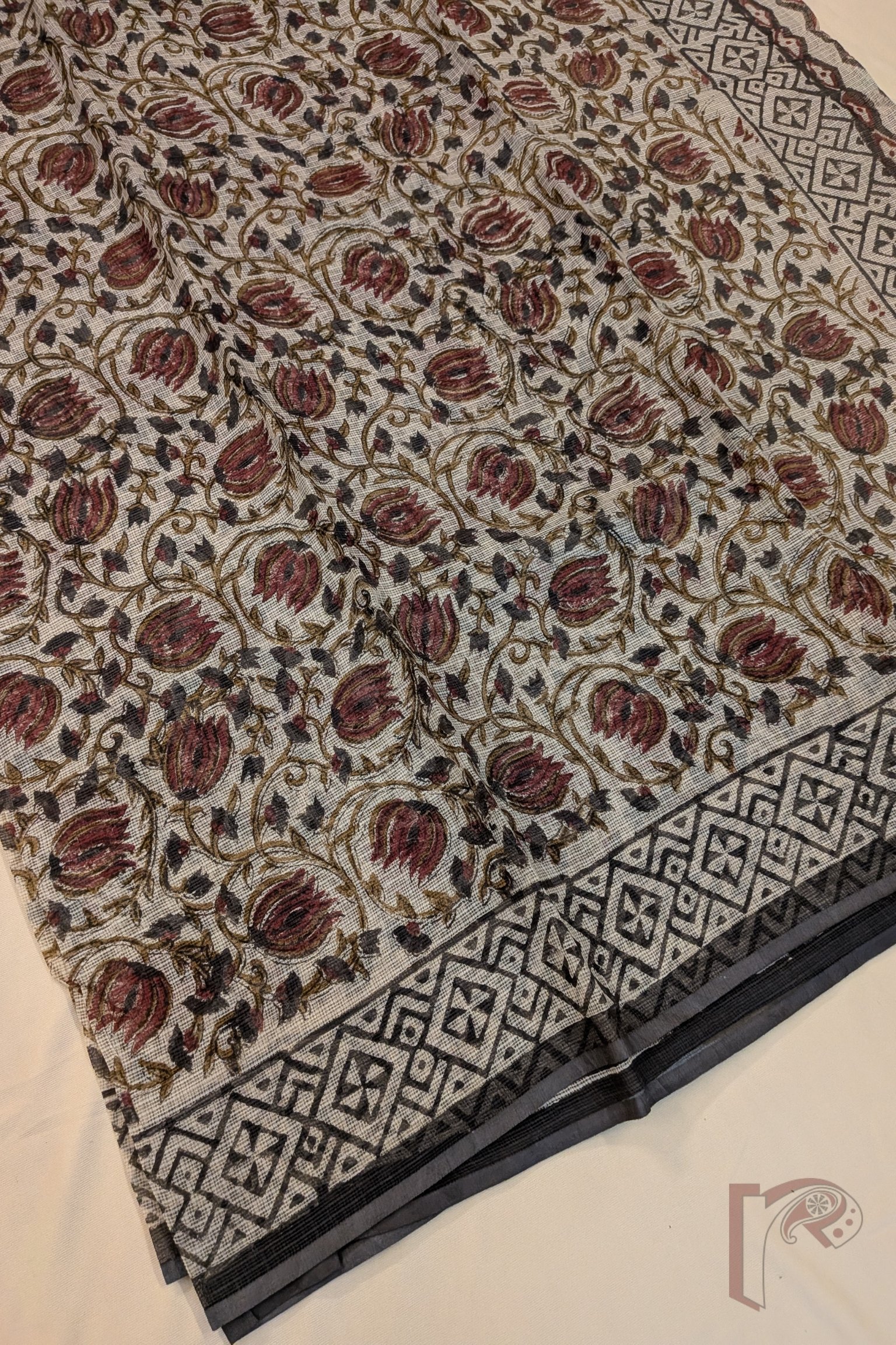 Kota Katha – Cream Kota Cotton Saree with Ajrakh Floral Swirl Motifs and Geometric Border