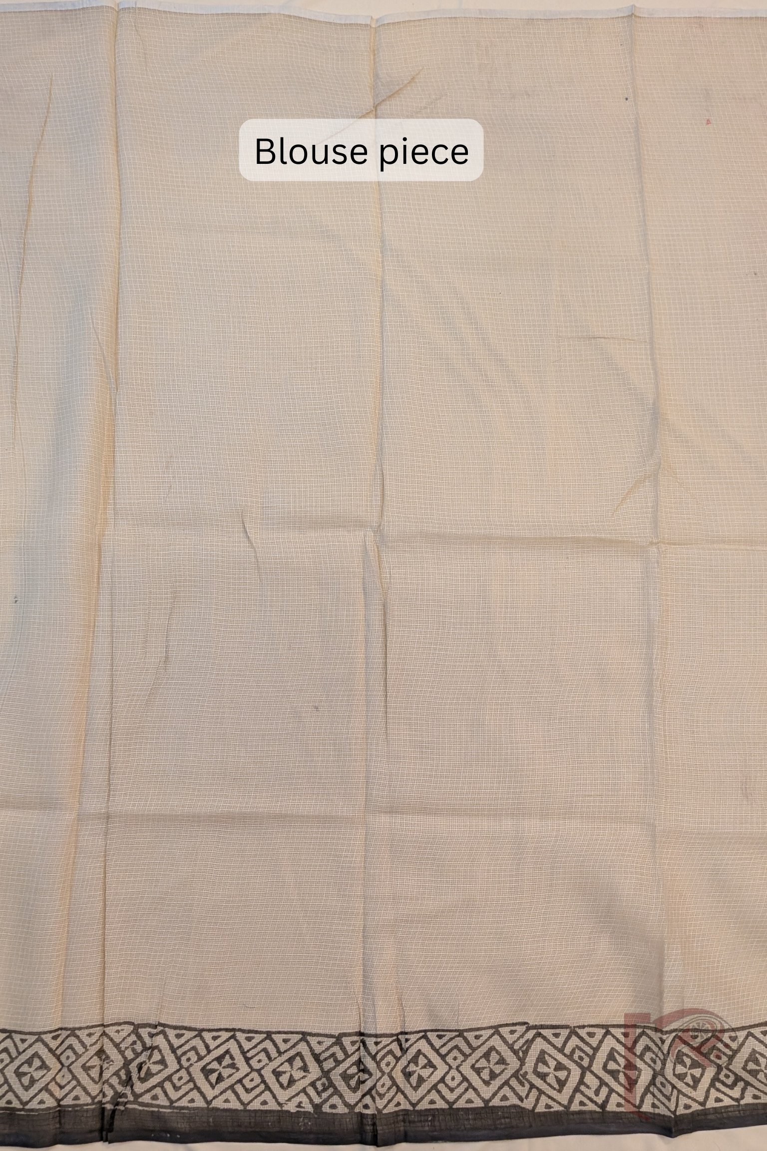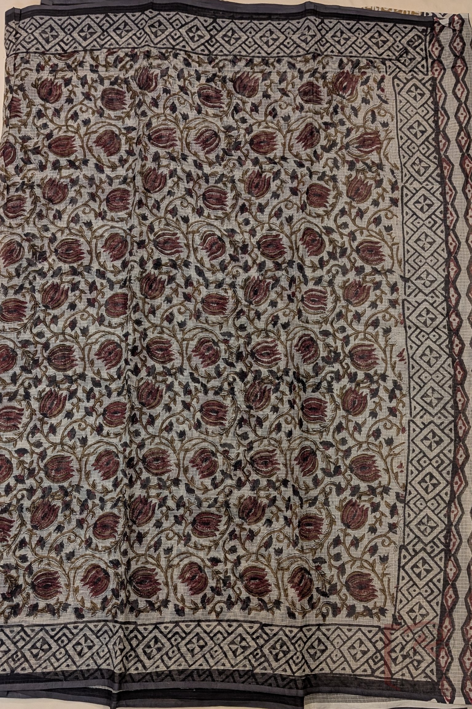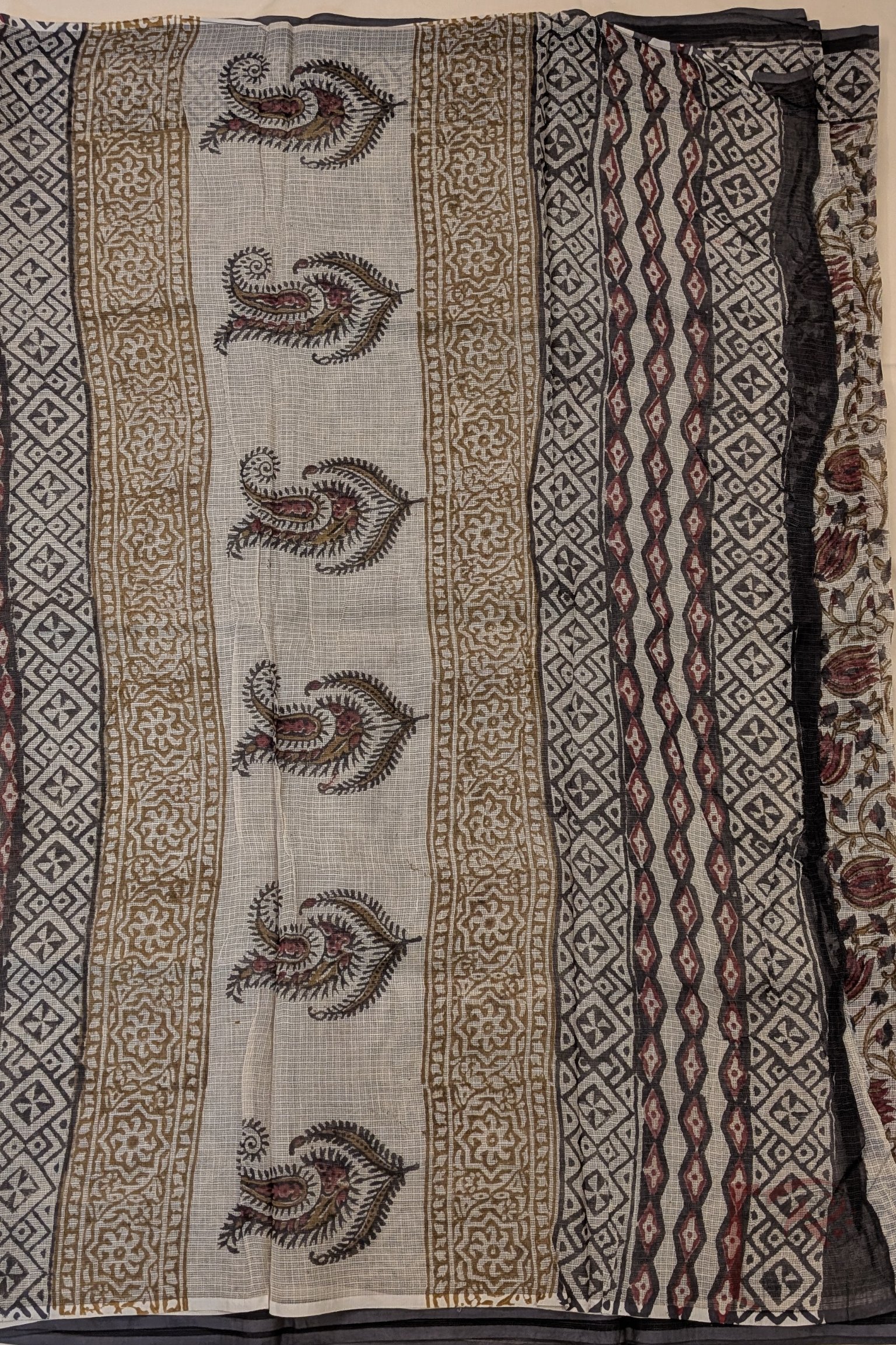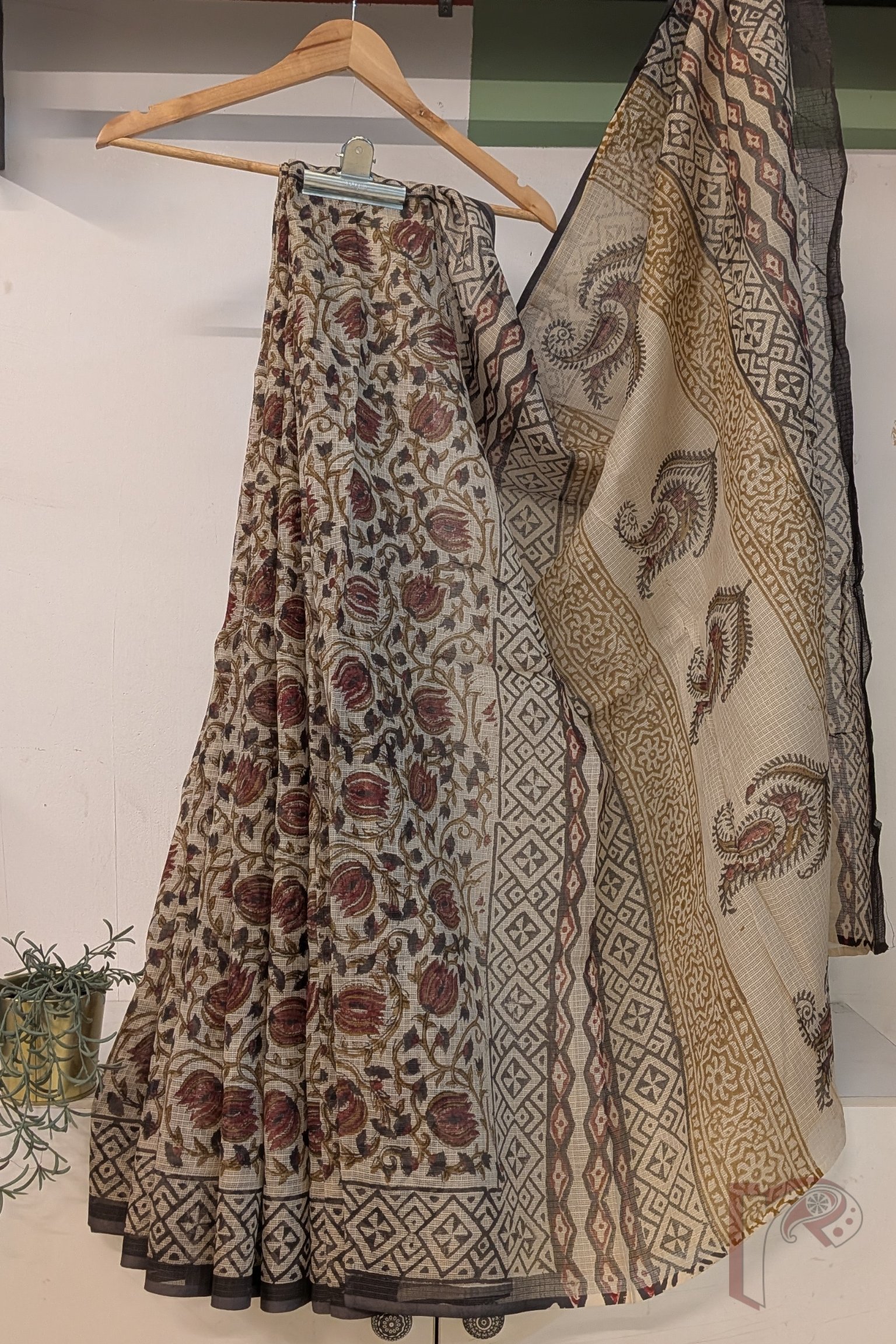 Kota Katha – Cream Kota Cotton Saree with Ajrakh Floral Swirl Motifs and Geometric Border