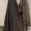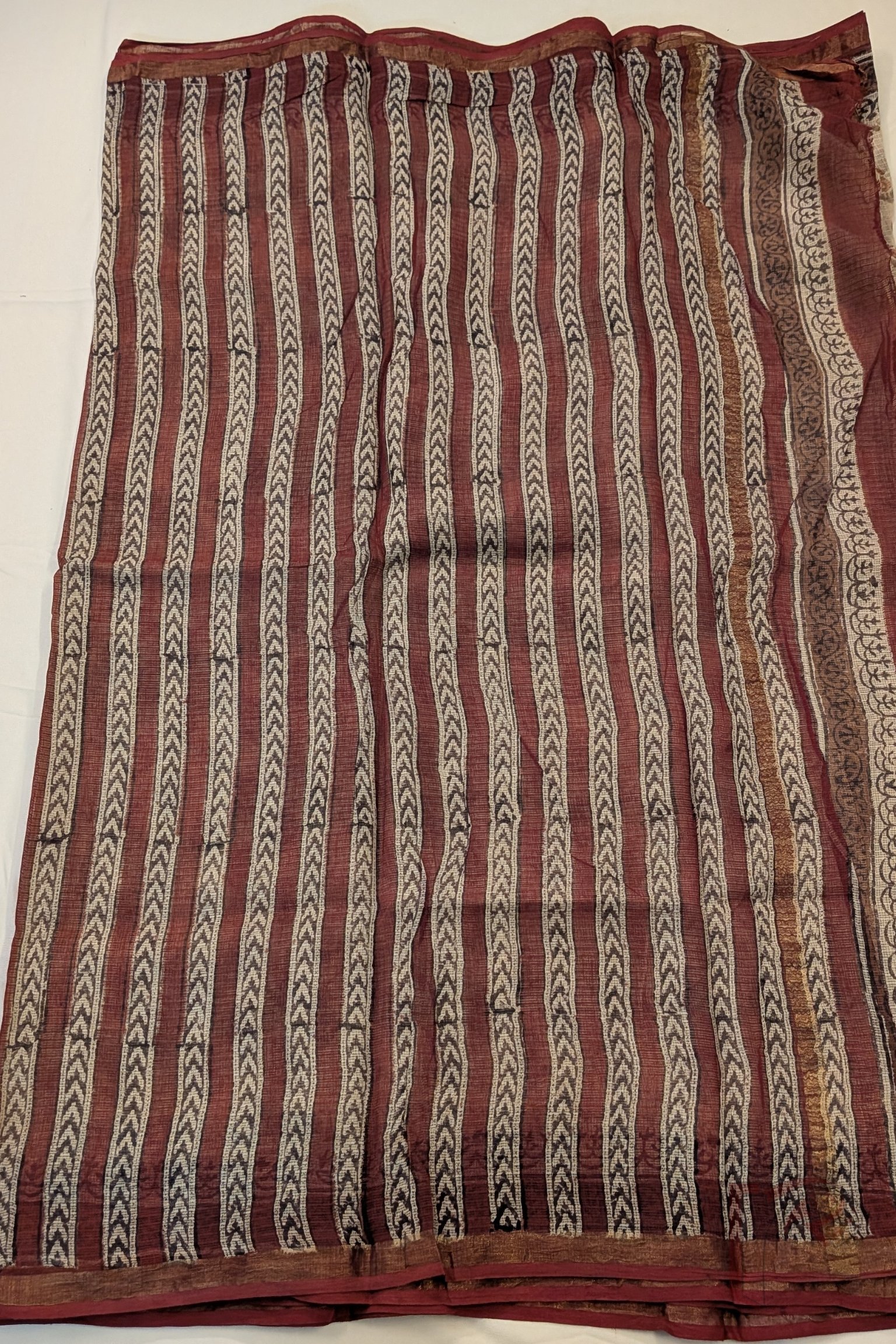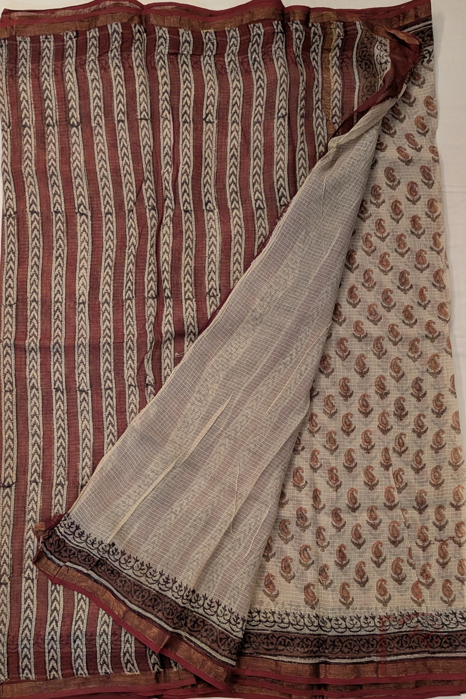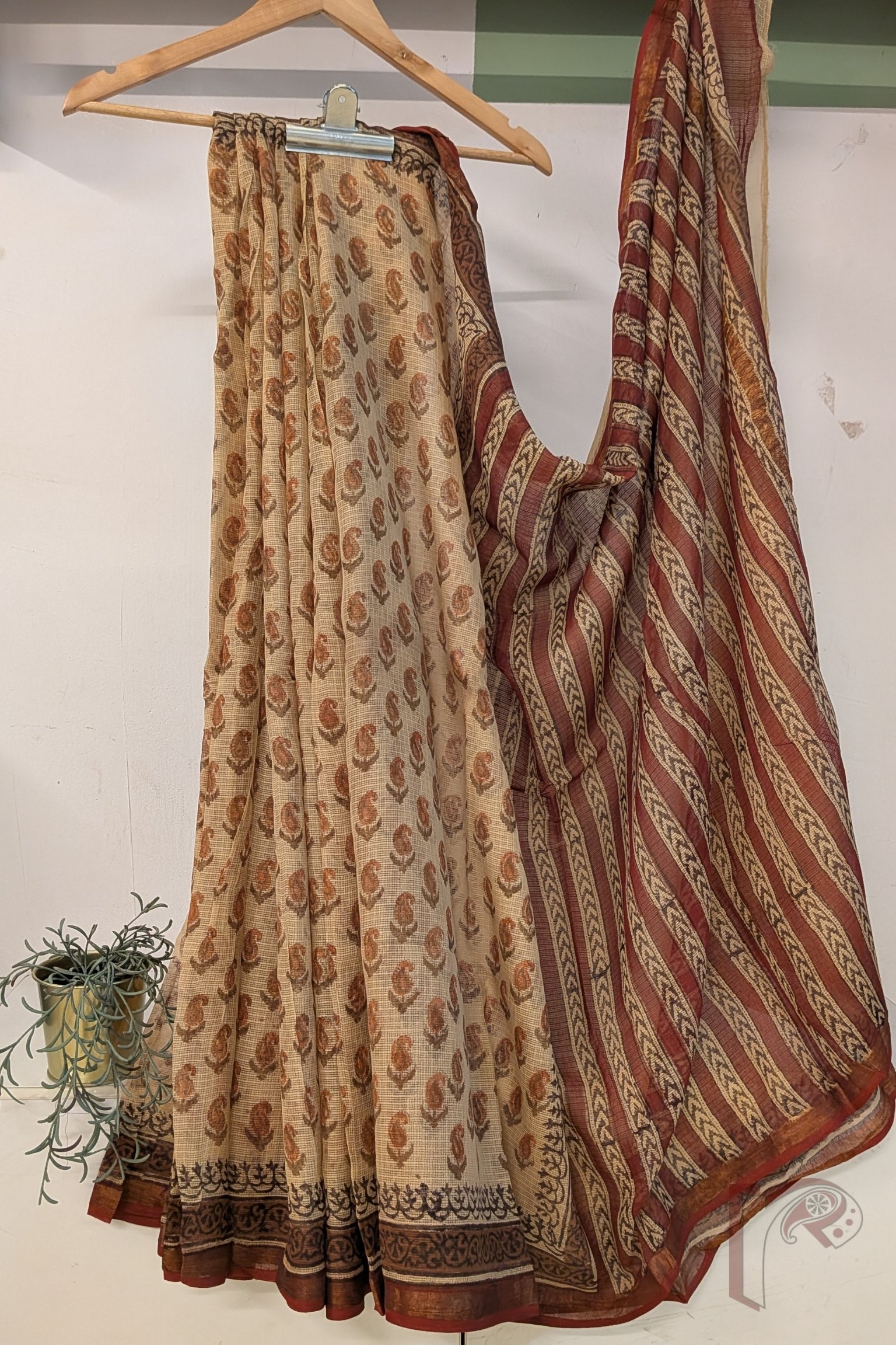 Earthy and elegant, this fawn beige Kota cotton saree features kairi-shaped mango buds on short stems in brown and rust hues. The pallu alternates between plain rust stripes and brown-fawn herringbone patterns, adding texture and depth. Accented with a 1-inch dull gold zari border and rust selvage, and paired with a plain blouse with block-printed border, this saree embodies subtle richness and everyday sophistication.