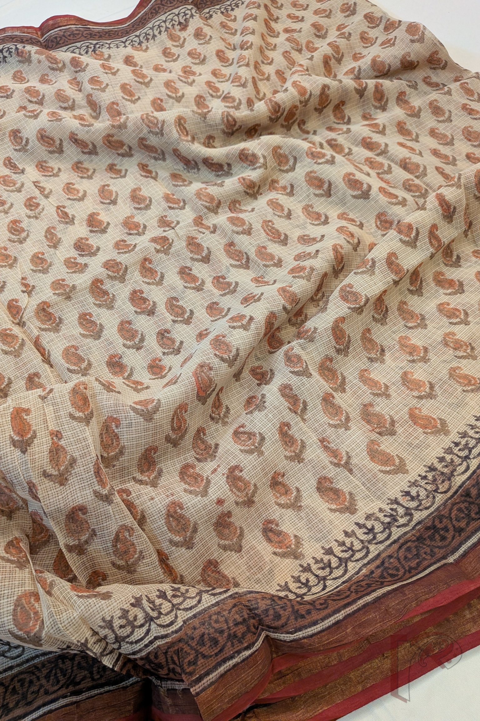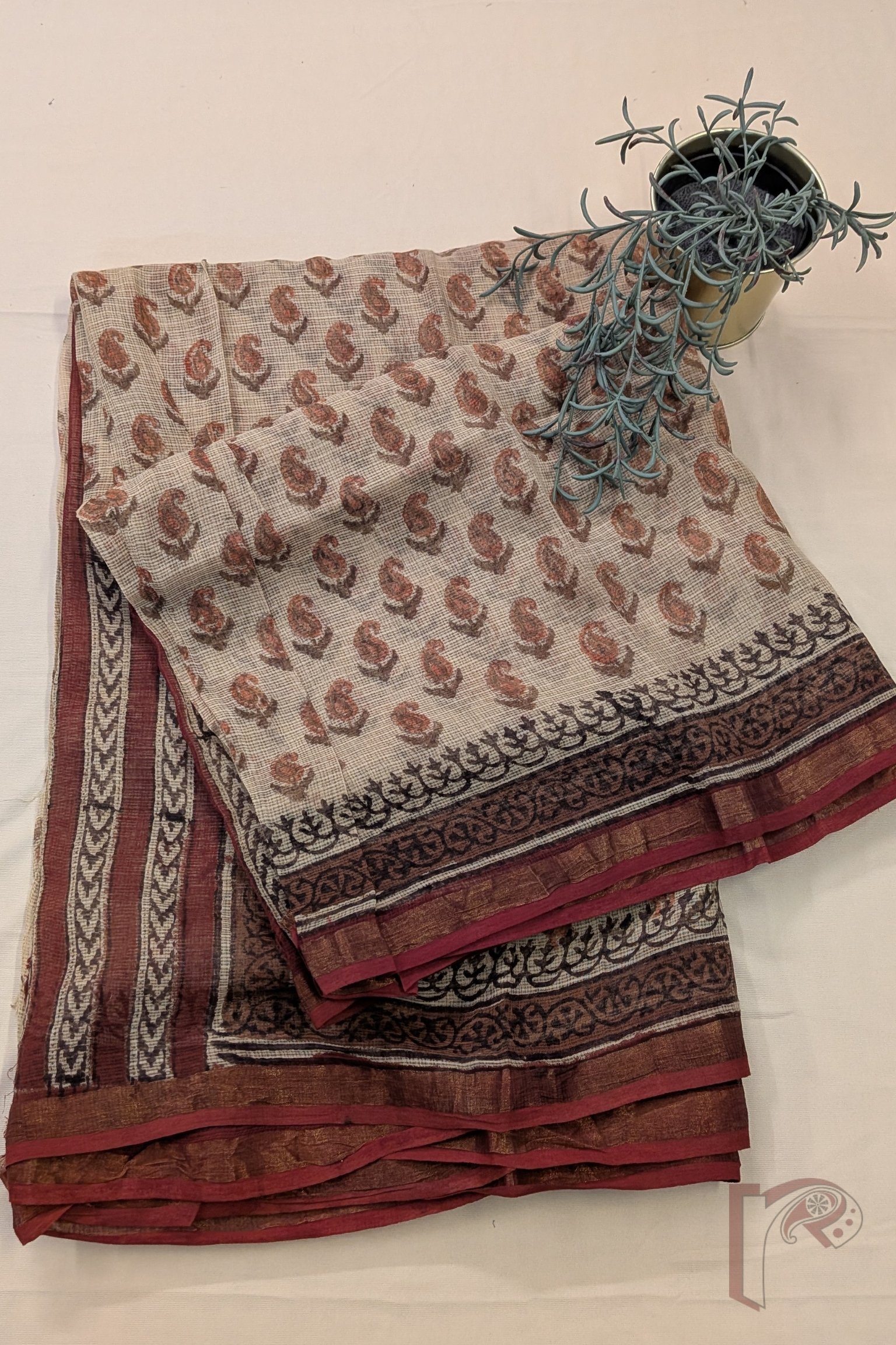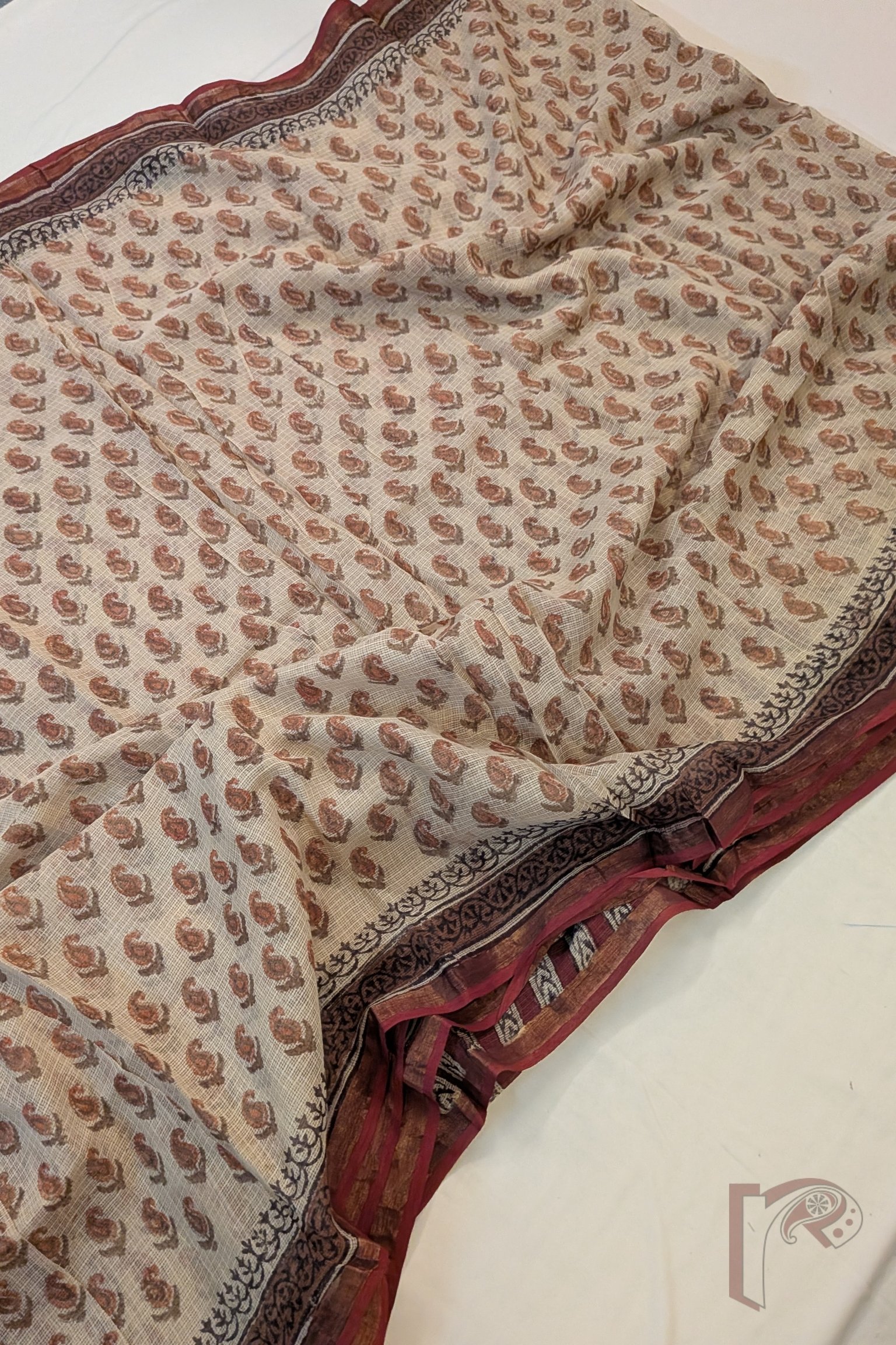 Kota Katha – Fawn Beige Kota Cotton Saree with Kairi Bud Motifs and Herringbone Pallu