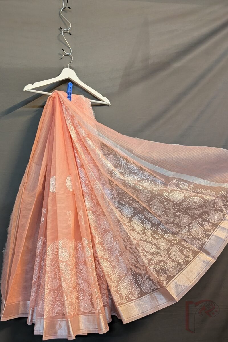 Kota Katha – Light Peach Pink Kota Cotton Saree with White Creeper Mango and Floral Embroidery and Silver Border