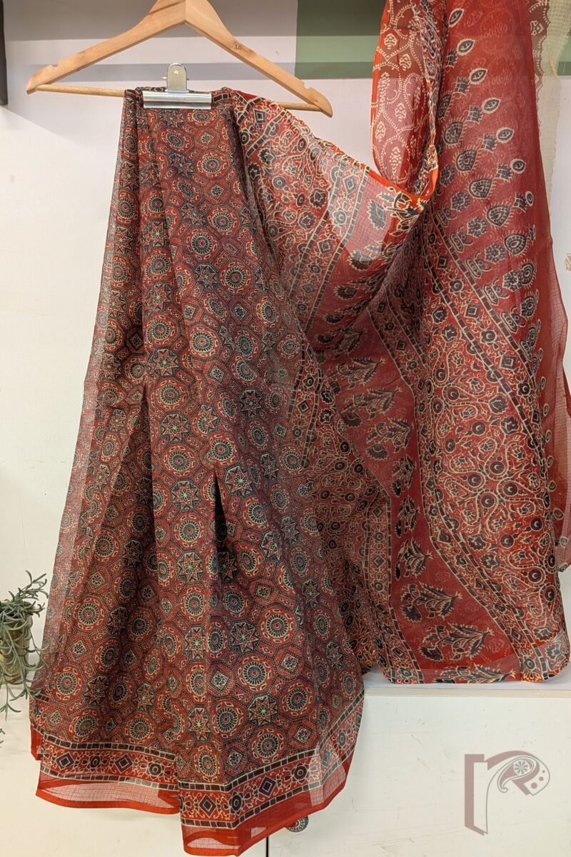Kota Katha – Red Kota Cotton Saree with Traditional Ajrakh Motifs and Jaal Pallu