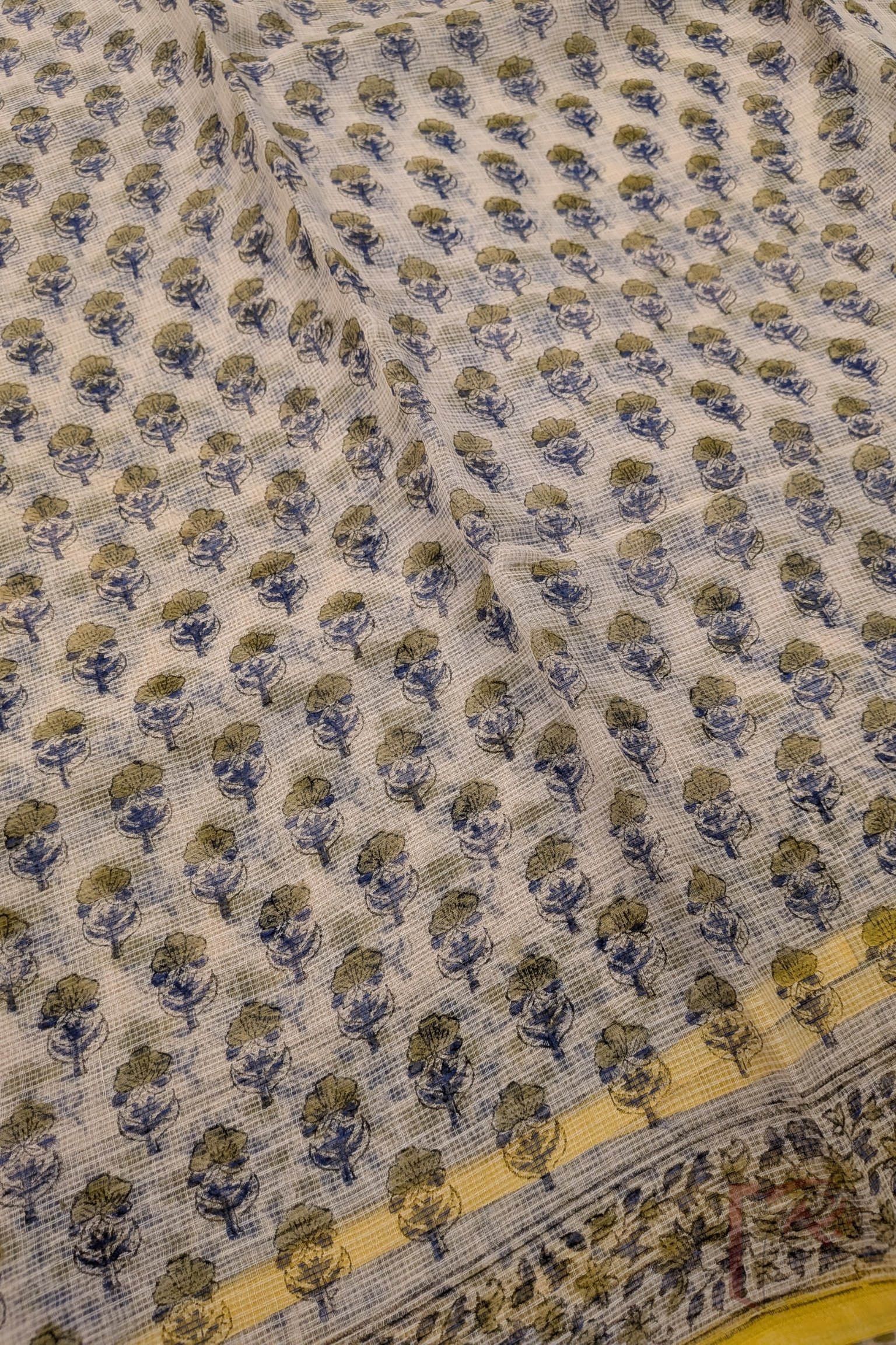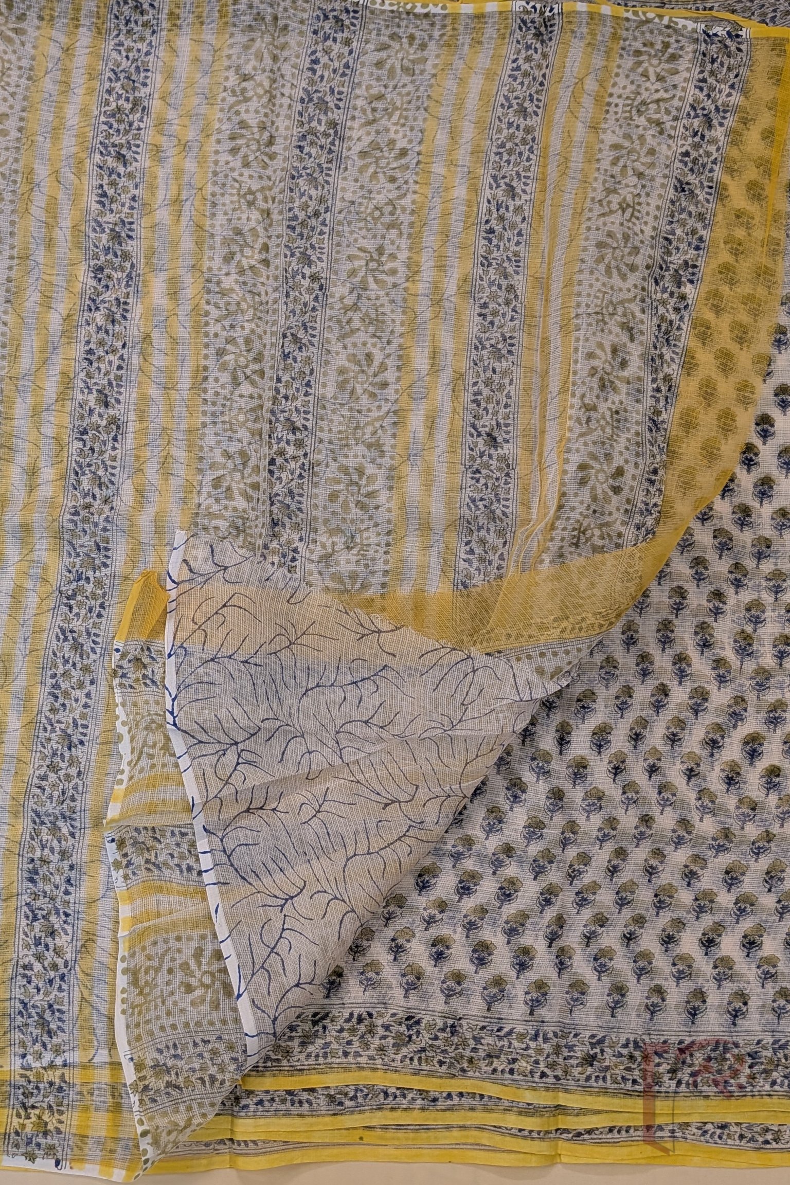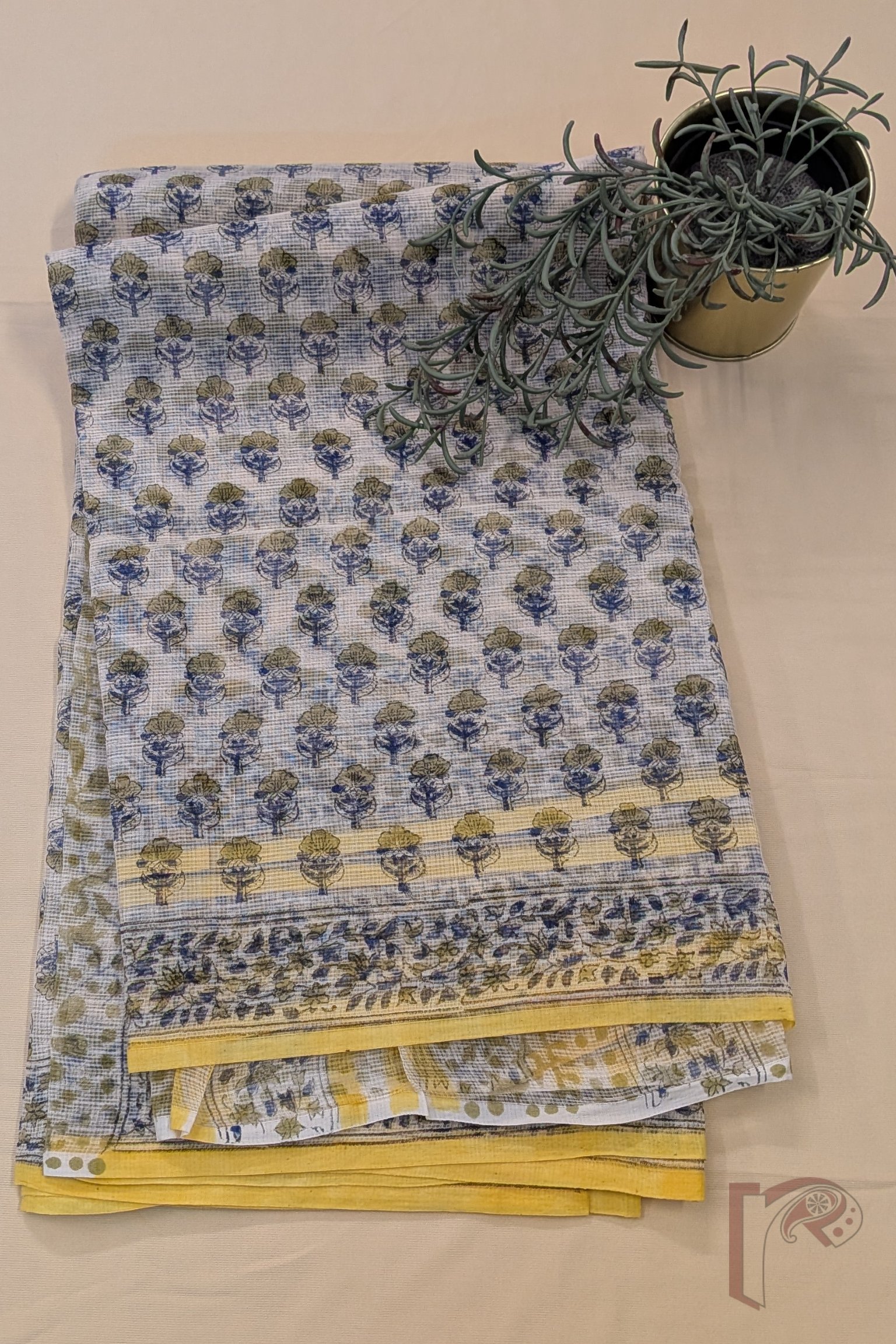 Kota Katha – White Kota Cotton Saree with Blue Green Floral Motifs and Yellow Selvage