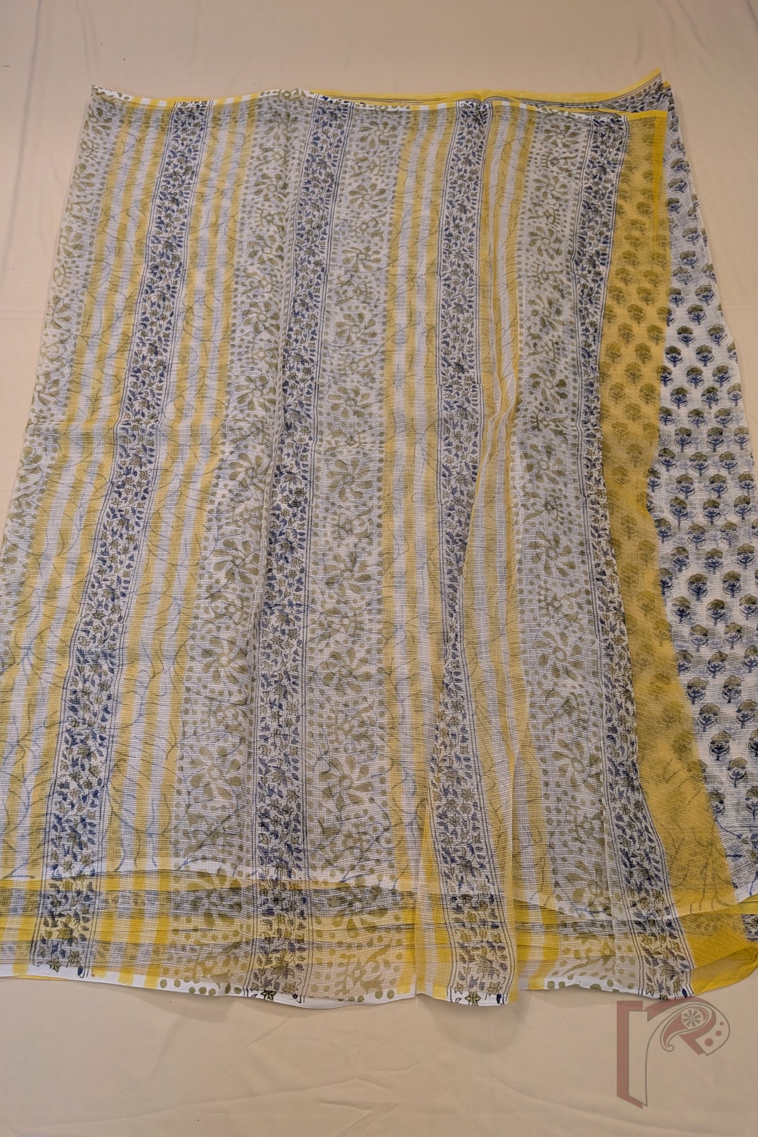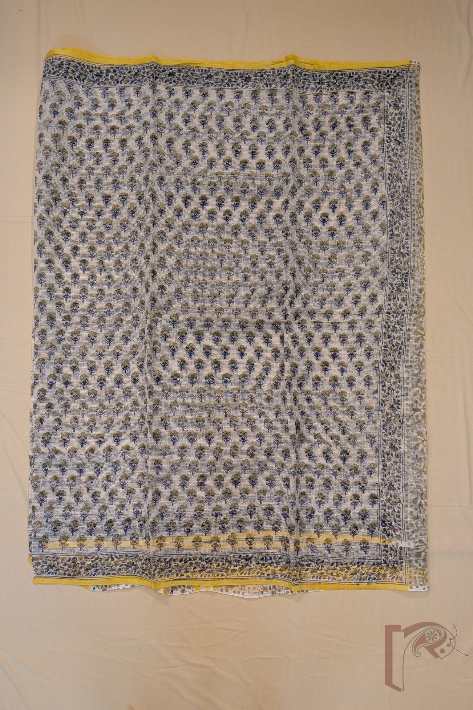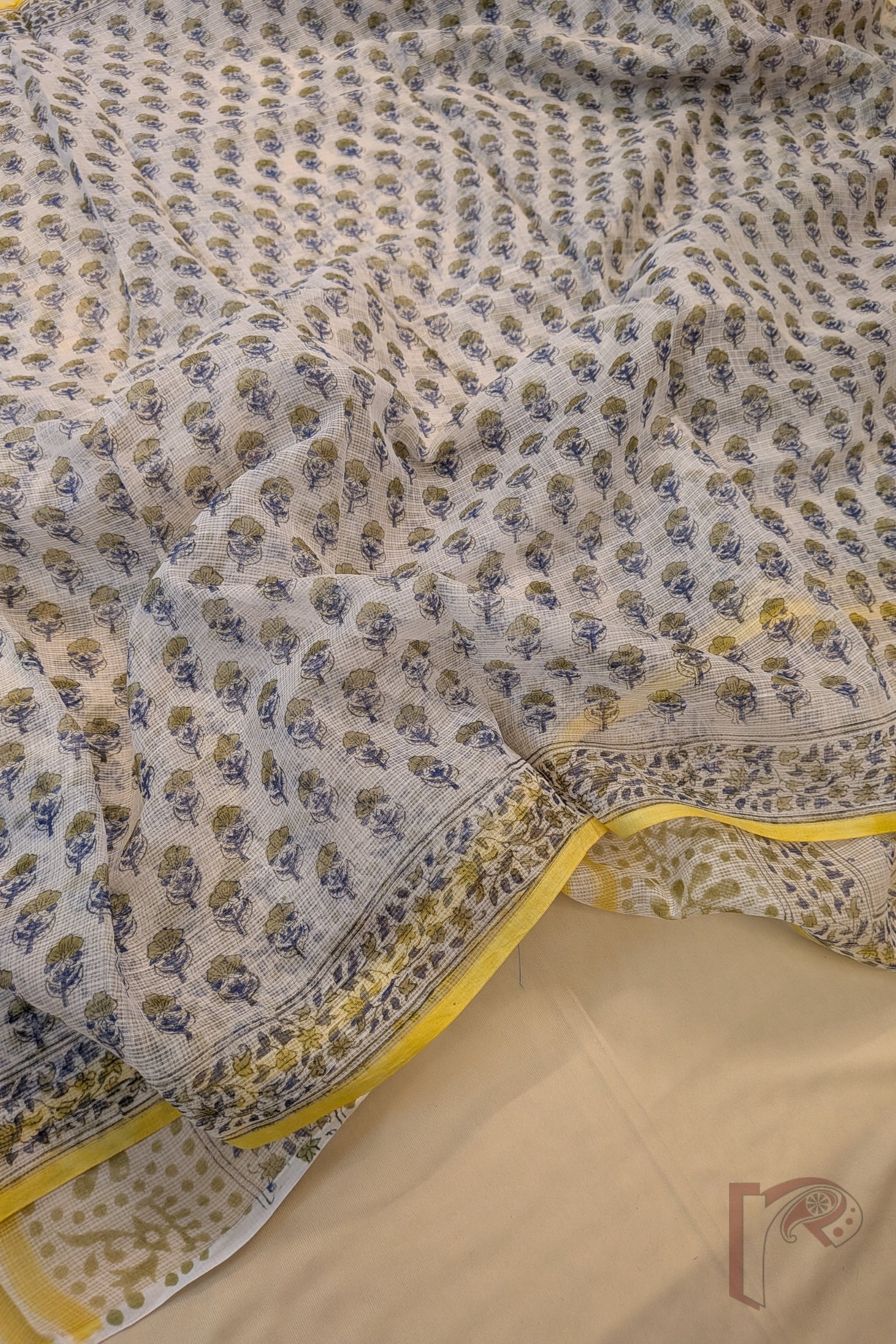 Kota Katha – White Kota Cotton Saree with Blue Green Floral Motifs and Yellow Selvage