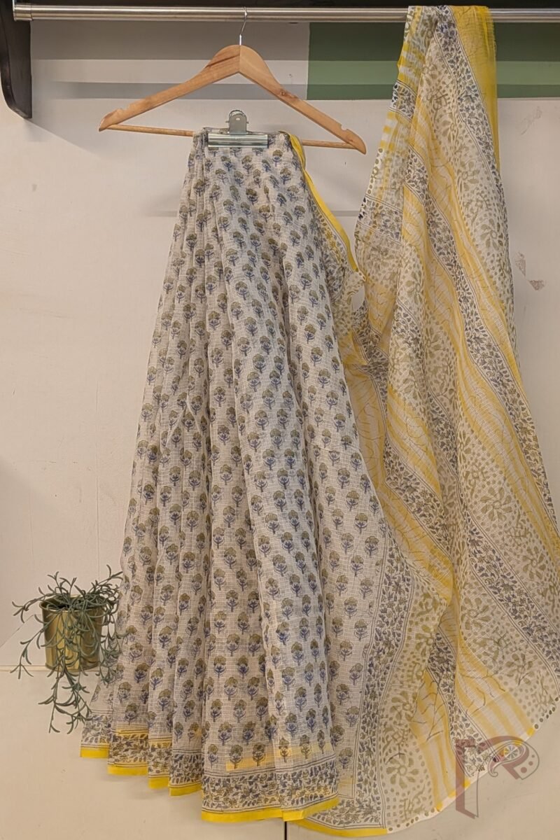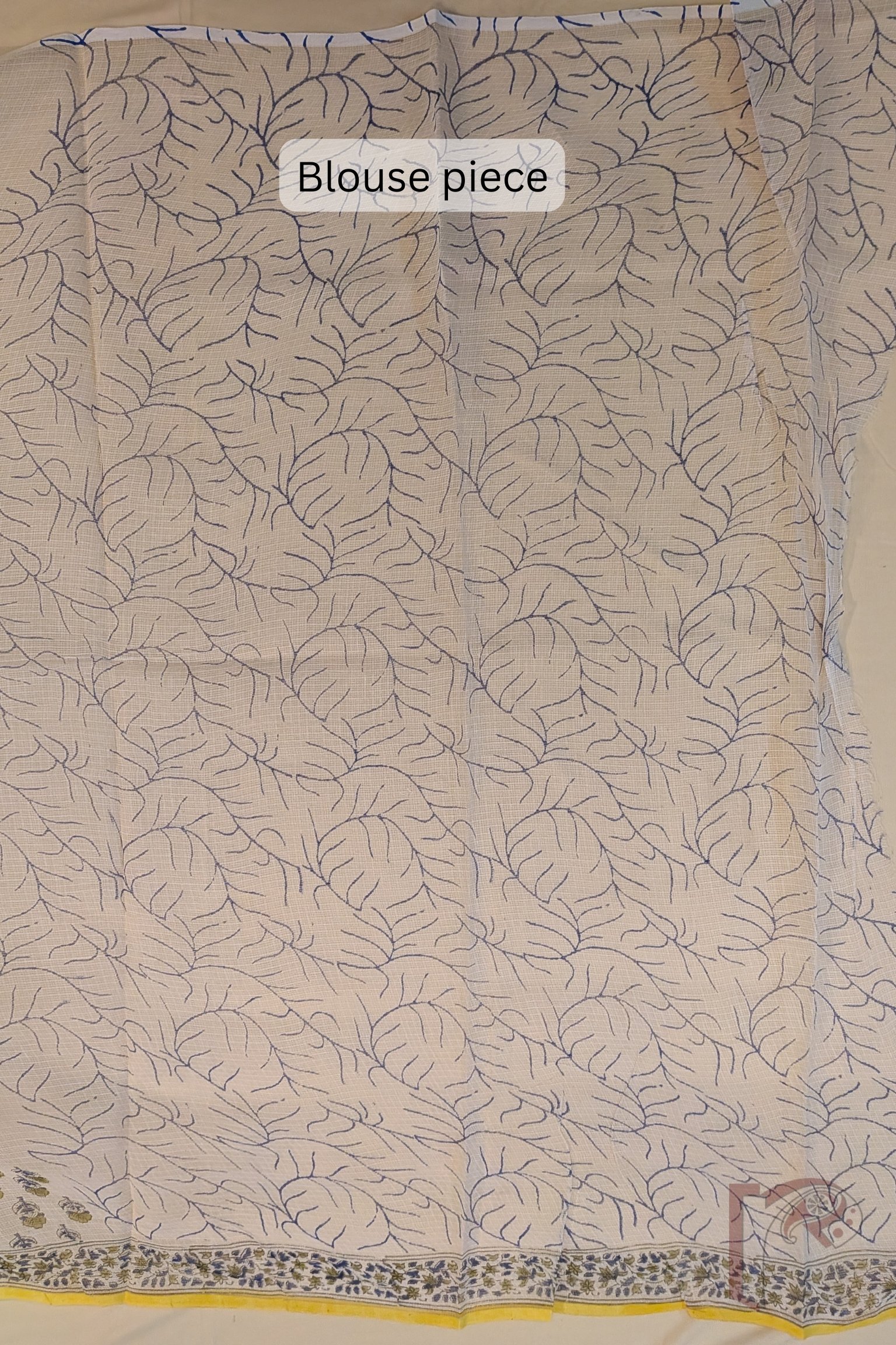 Fresh and luminous, this white Kota cotton saree is decorated with closely spaced floral motifs in blue and green, creating a gentle rhythm across the airy body. The border features tiny leaf and flower motifs, enhanced with a bright yellow selvage for a cheerful accent. The pallu blends yellow stripes with sage and blue florals, while the white blouse with blue leaf tendrils completes this breezy, summer-ready drape.