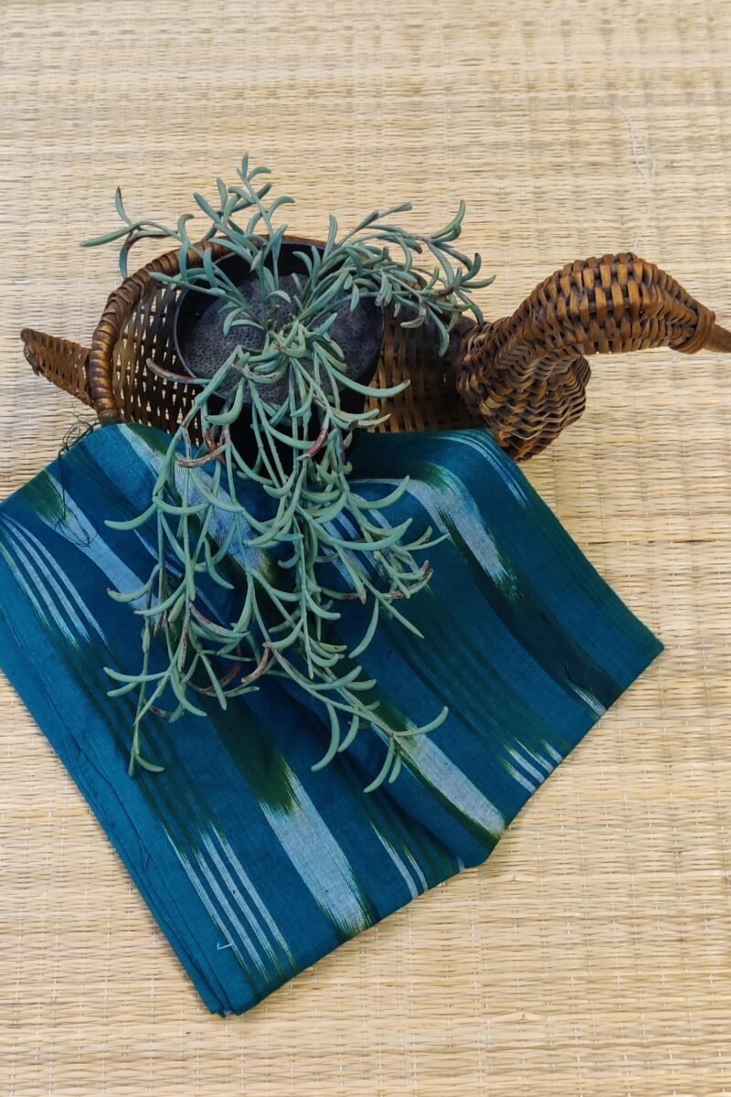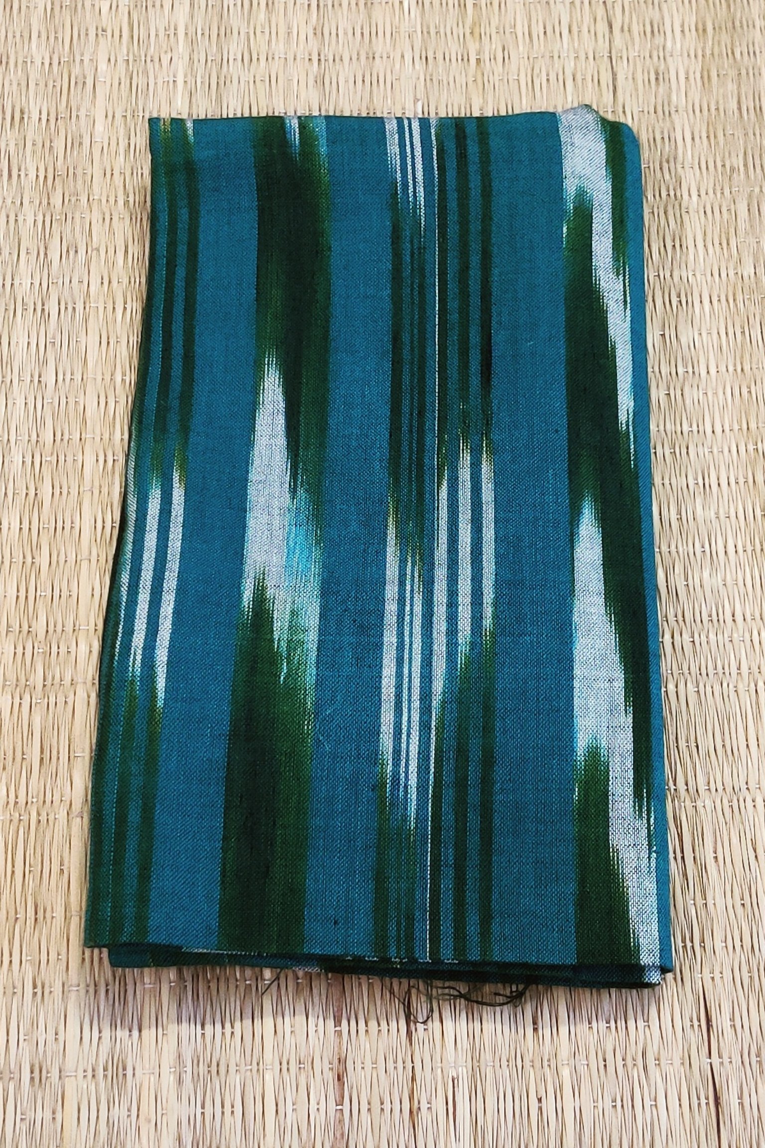This refreshing leaf green Sambalpuri cotton blouse piece showcases an ikkat inspired weave featuring bold 1.5 inch dark green and white stripes combined with fine clustered lines. The layered stripe detailing creates depth and movement, giving the fabric a distinctive handcrafted look. Perfect for pairing with earthy handloom sarees, this piece offers breathable cotton comfort and strong visual structure. The tonal green palette makes it both elegant and easy to style across seasons.