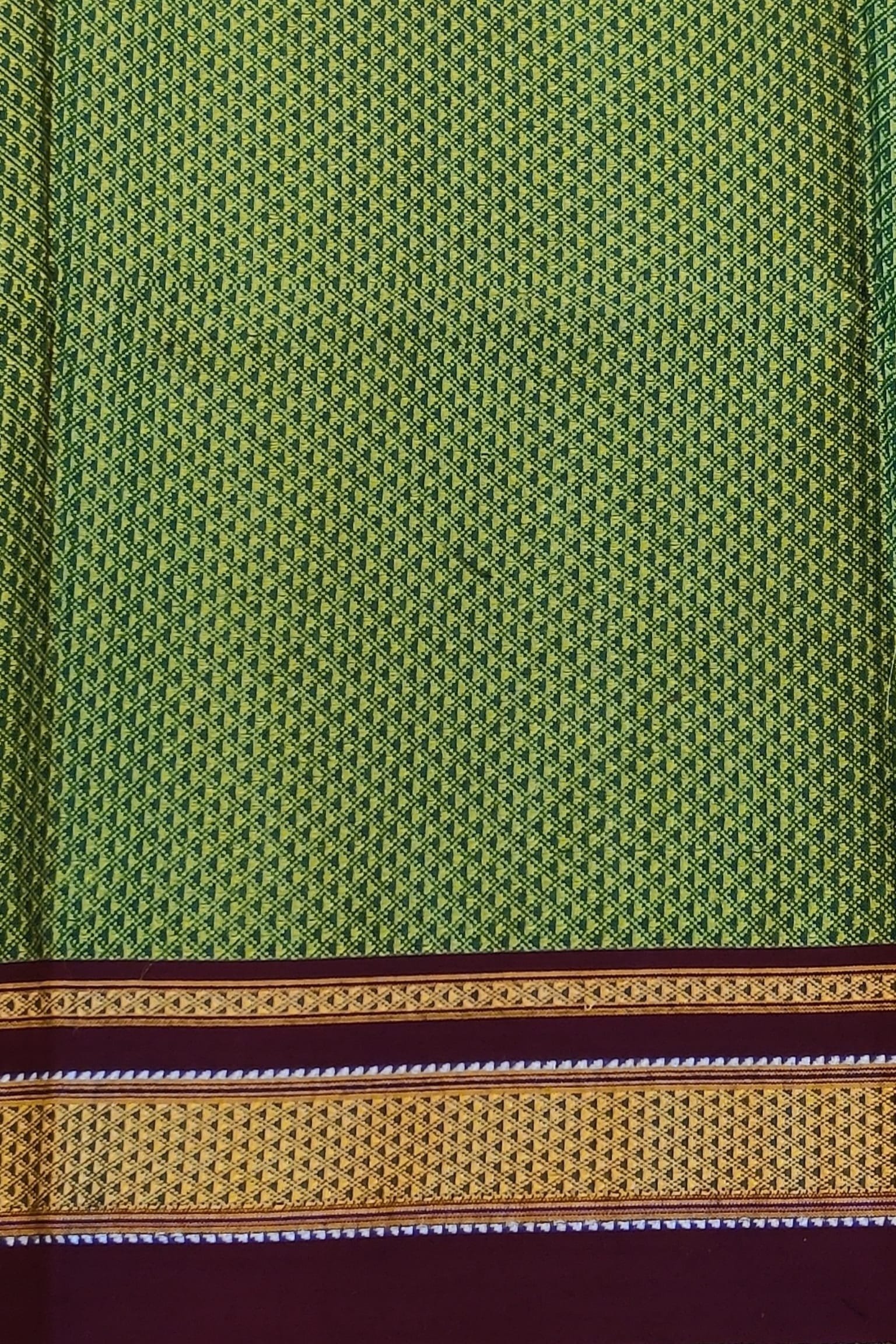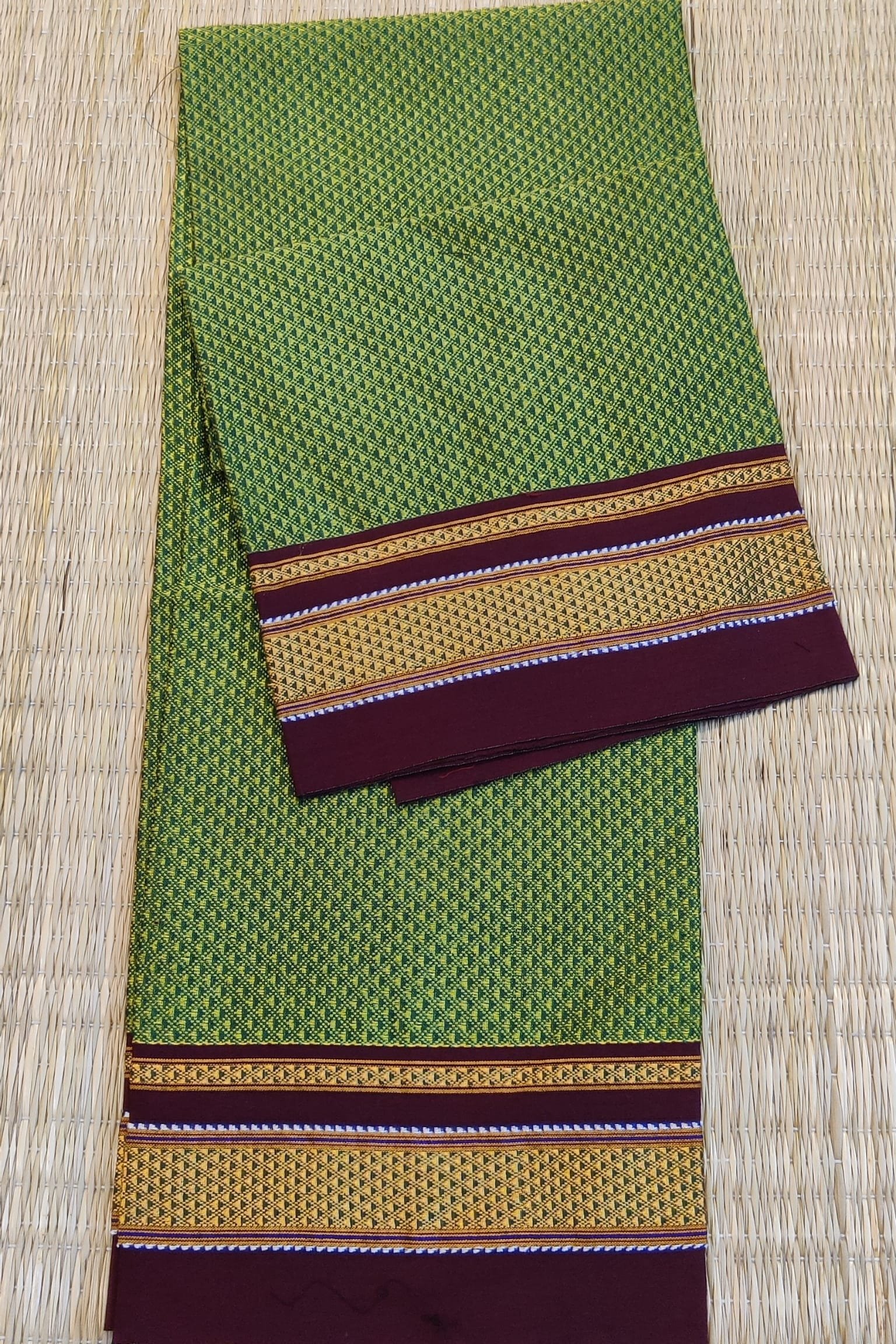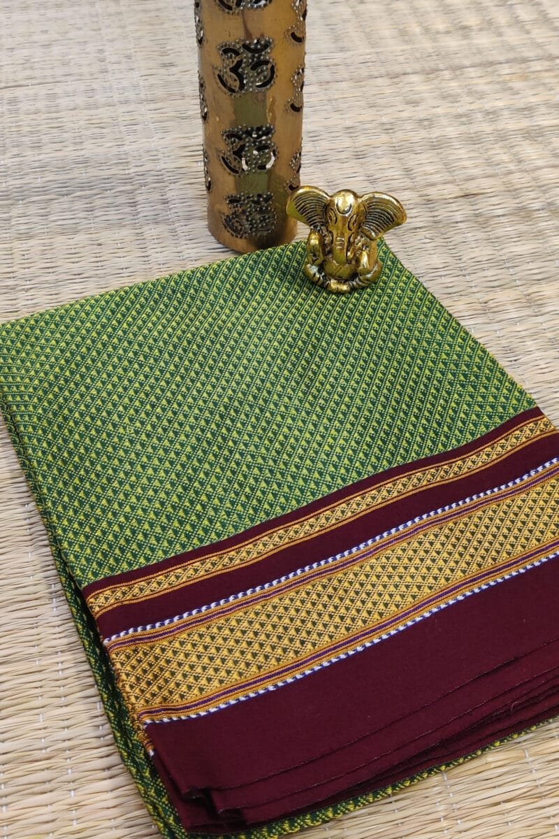 A soft light green cotton silk Ilkal blouse piece crafted in the traditional Khun weave, complemented by a rich maroon border featuring delicate golden thread lines. The gentle green tone brings freshness, while the maroon contrast adds traditional richness and balance. The lightweight cotton silk texture and subtle sheen make it perfect for everyday elegance and festive styling alike.