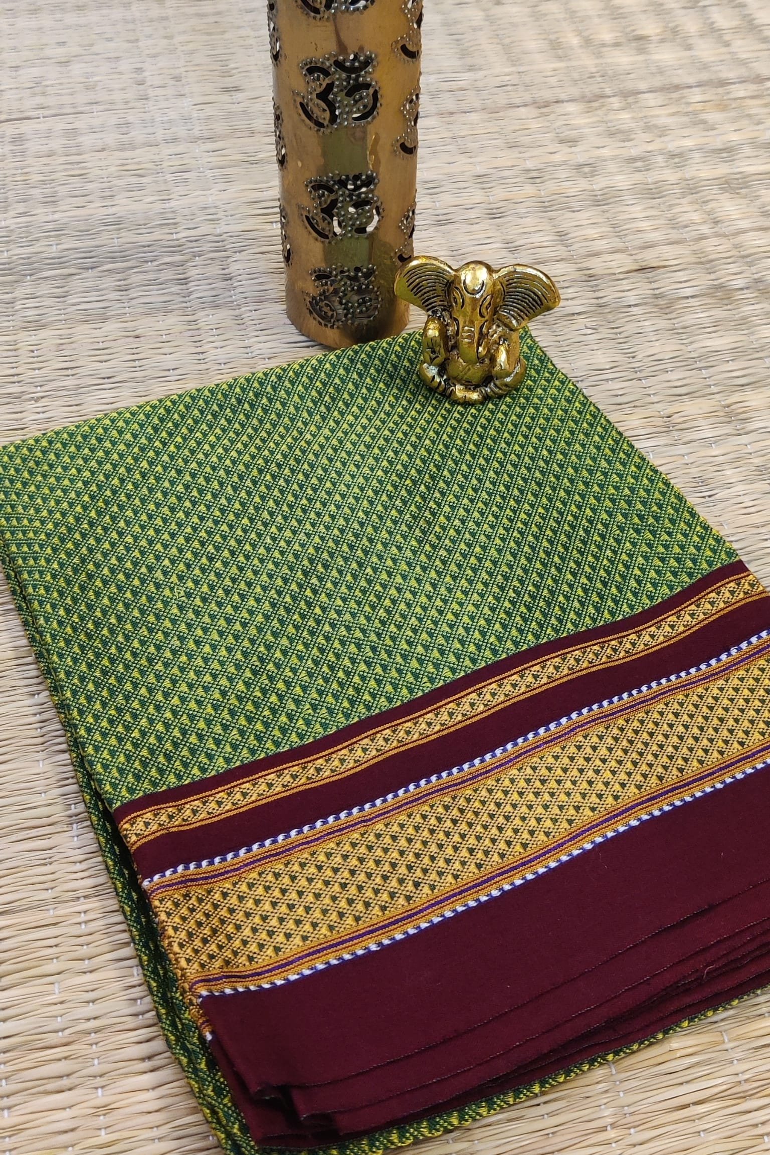 Light Green Khun Weave Ilkal Blouse Piece with Maroon Border and Golden Thread Lines