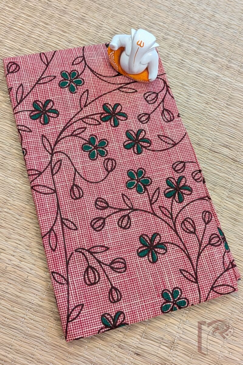 This stunning light maroon handloom south cotton blouse piece is decorated with elegant green and coffee brown flowers and buds on slender stems, printed thoughtfully across the fabric. The earthy color combination lends a rustic yet refined appeal. The cotton weave ensures comfort, breathability, and crisp finish, making it suitable for festive gatherings or cultural events. The harmonious blend of warm and earthy tones gives this blouse material a timeless charm.
