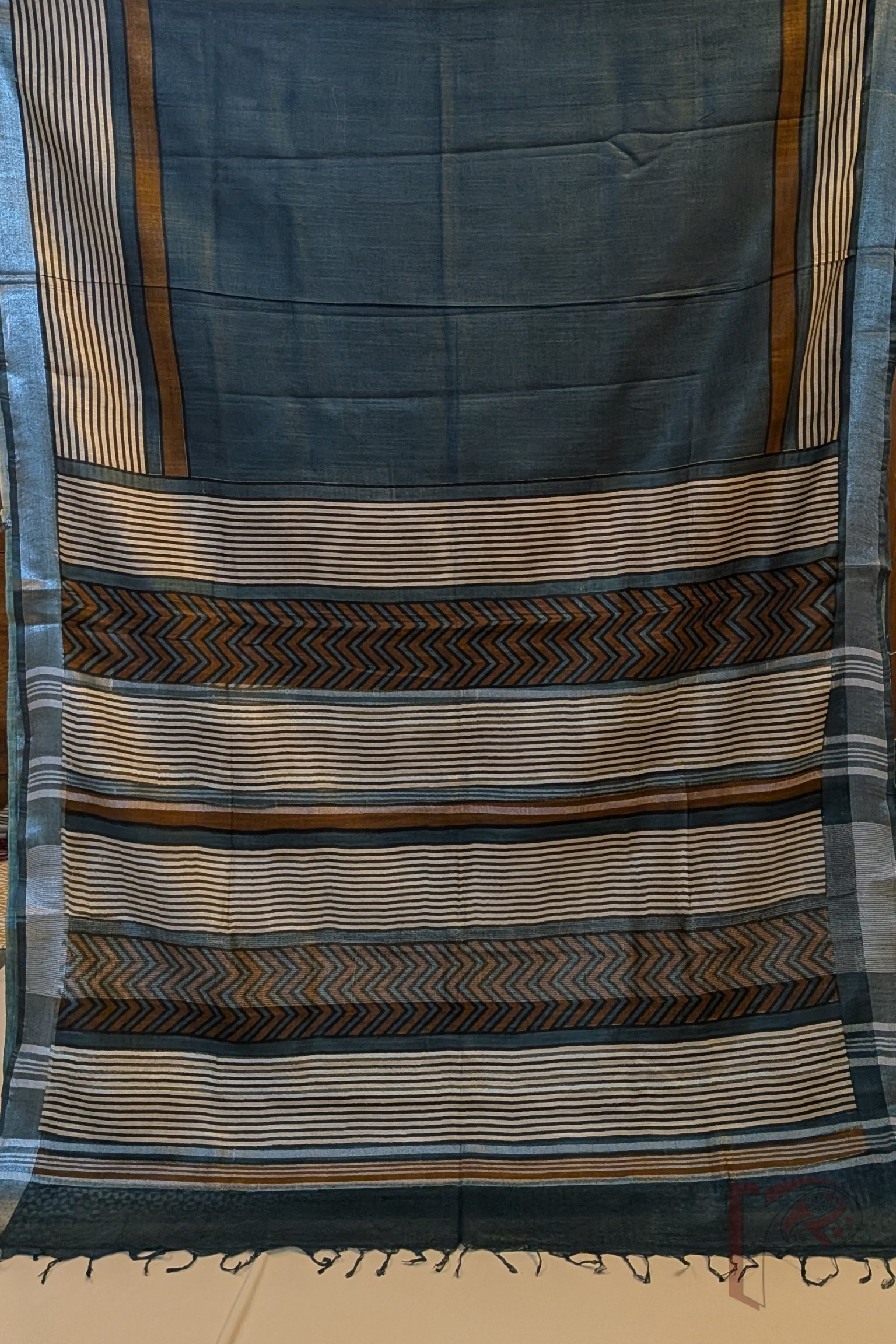 This blue grey Cotton Linen saree features a subtle plain body with a striking maroon and black striped border, offering a perfect balance of understated elegance and bold accents. The pallu showcases an abstract pattern combining pinstripes and zigzags in black, blue grey, and maroon on a cream base, providing a modern artistic appeal. Paired with a hand-printed blouse in matching blue grey, this saree is ideal for those who seek a blend of contemporary design with traditional fabric finesse. Its lightweight texture, flowing drape, and vibrant contrasts make it a versatile choice for festive or semi-formal occasions.