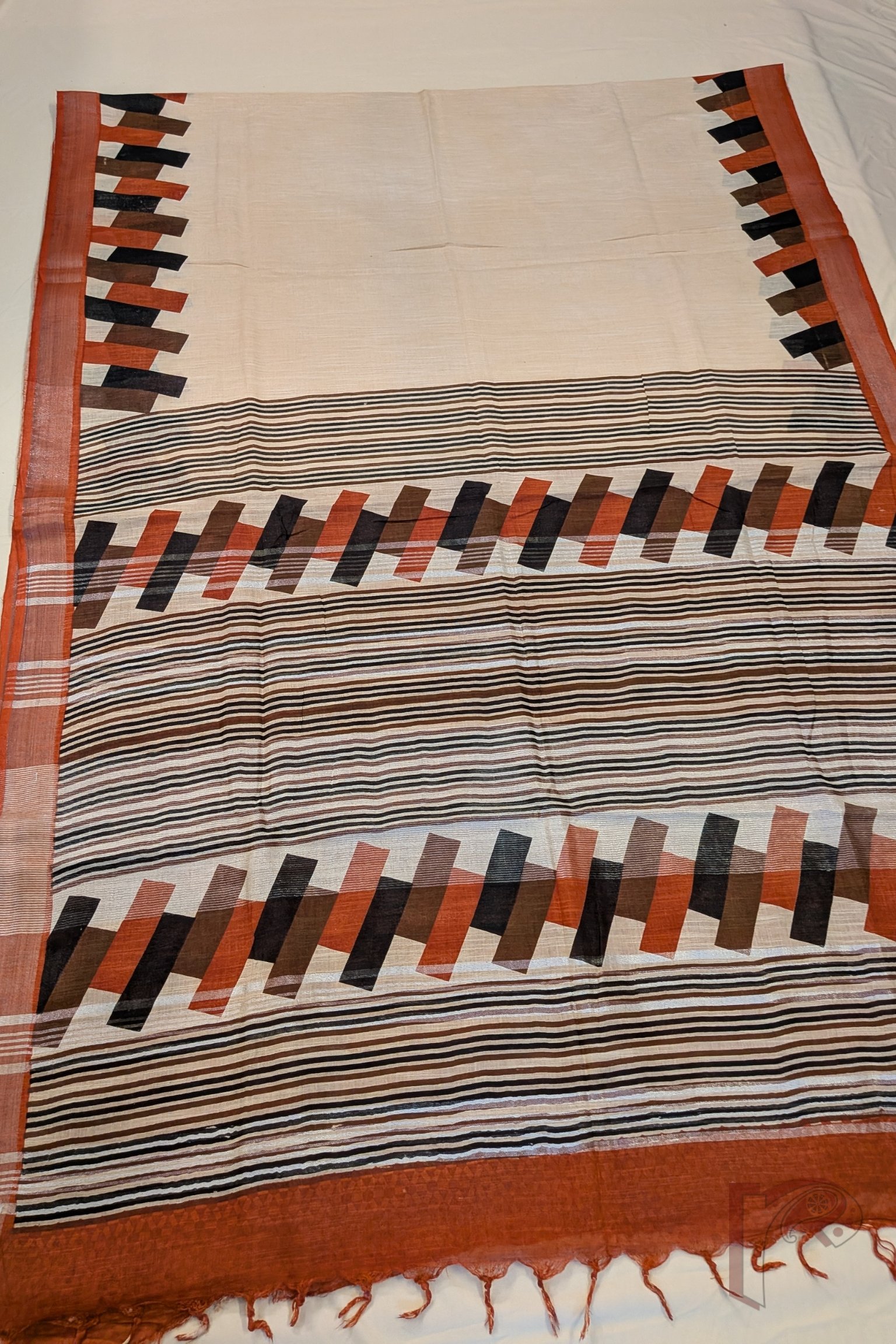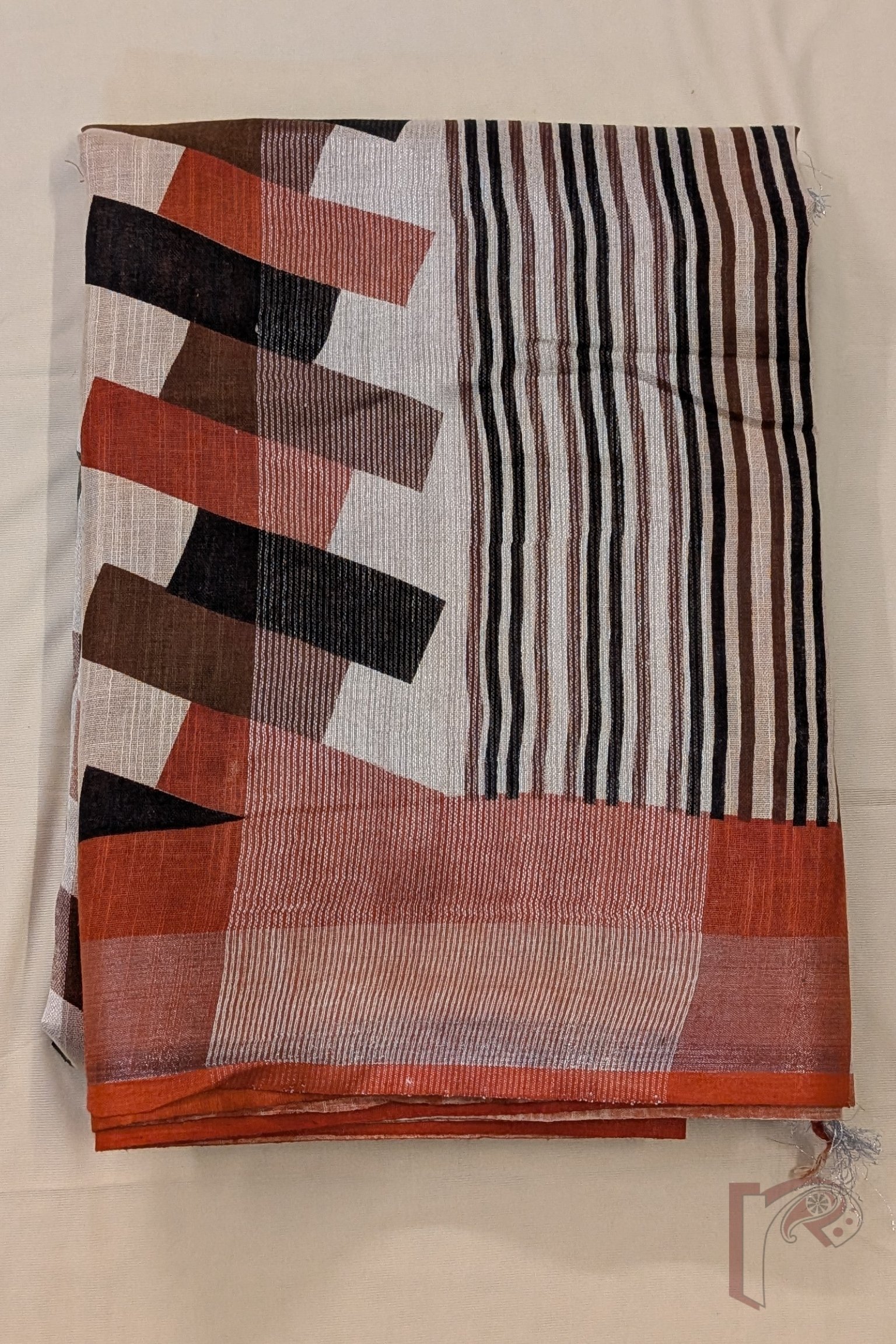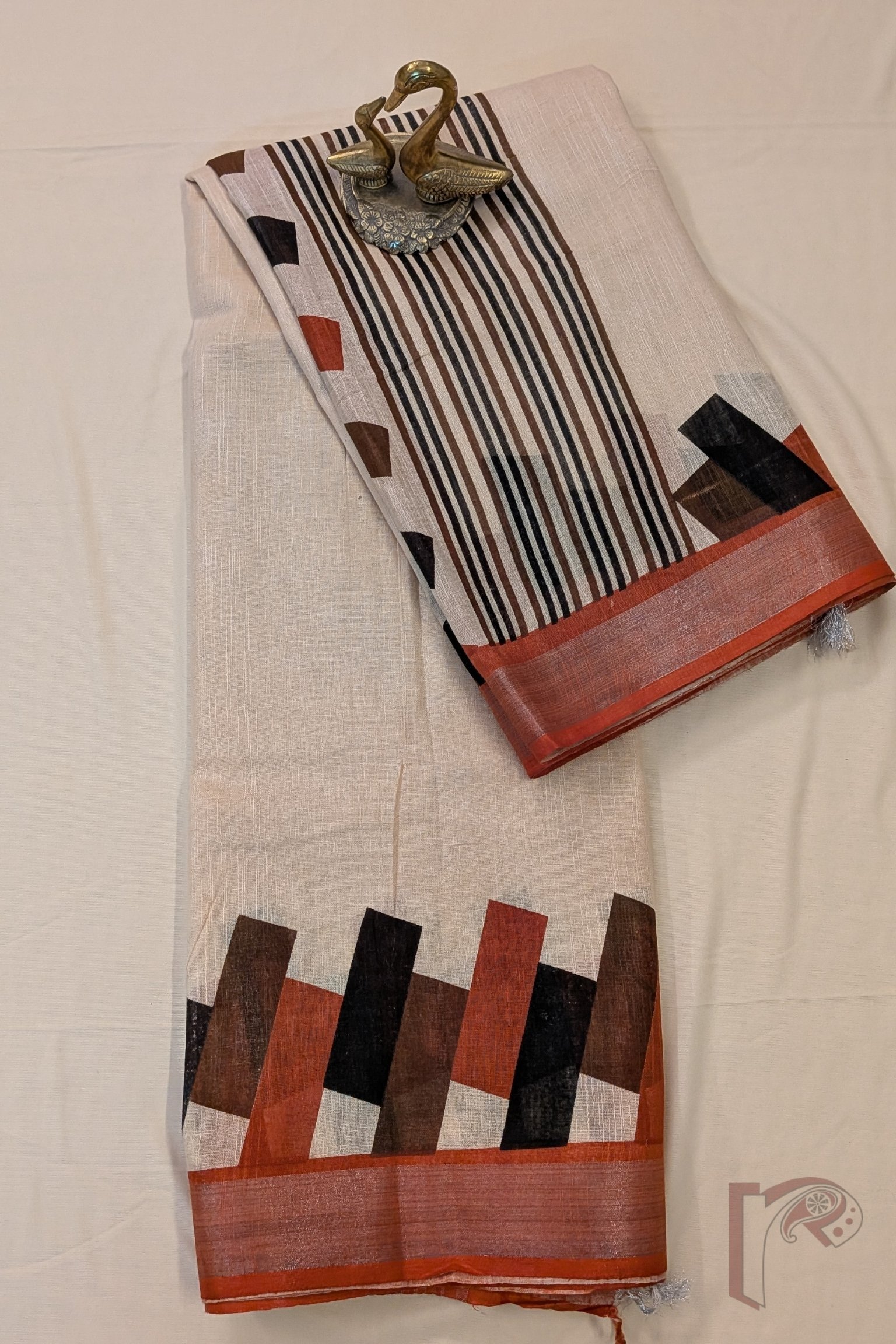 Linen Loom – Cream Cotton Linen Saree with Burnt Orange & Silver Zari Border and Abstract Rectangular Pallu
