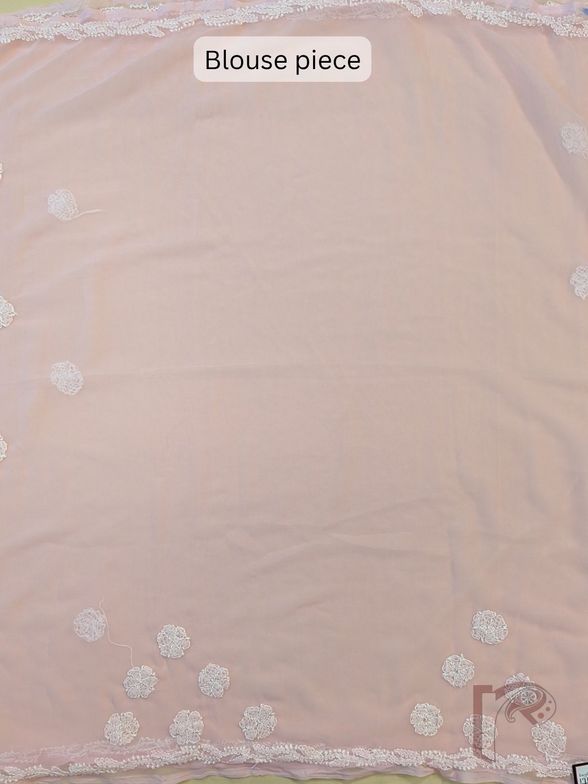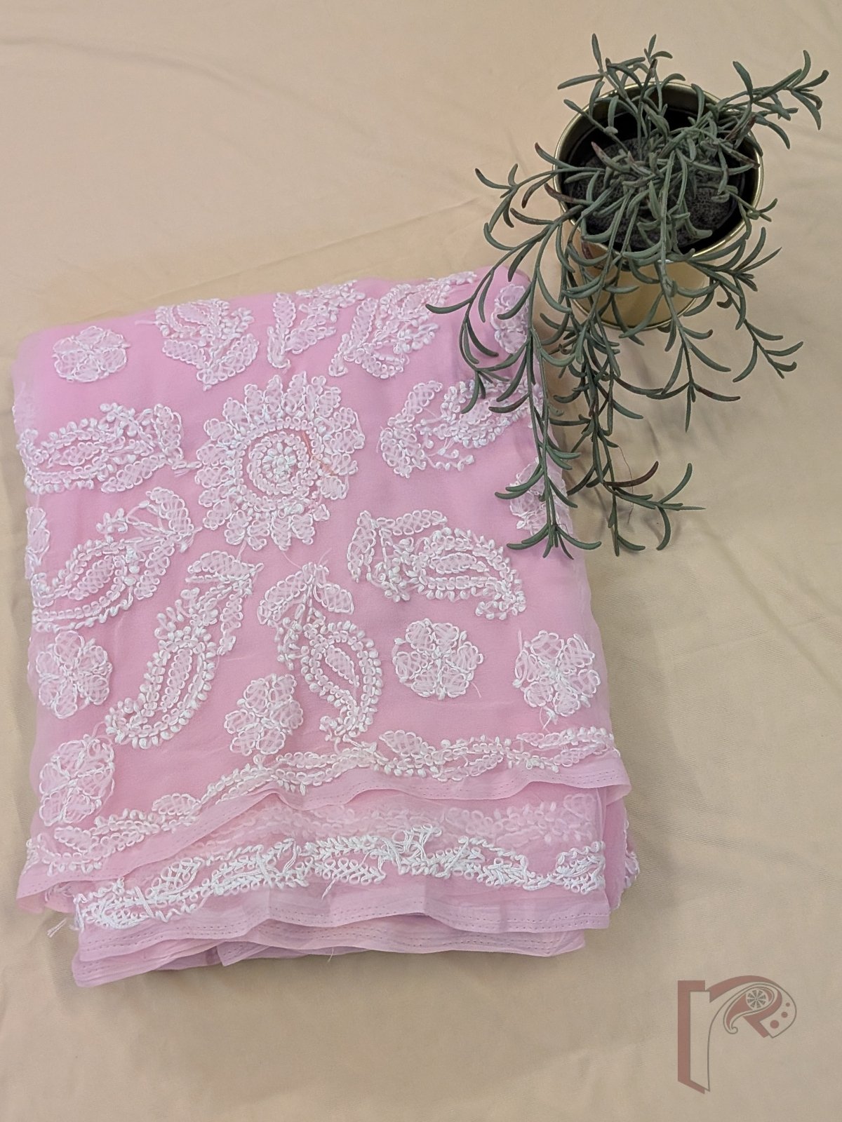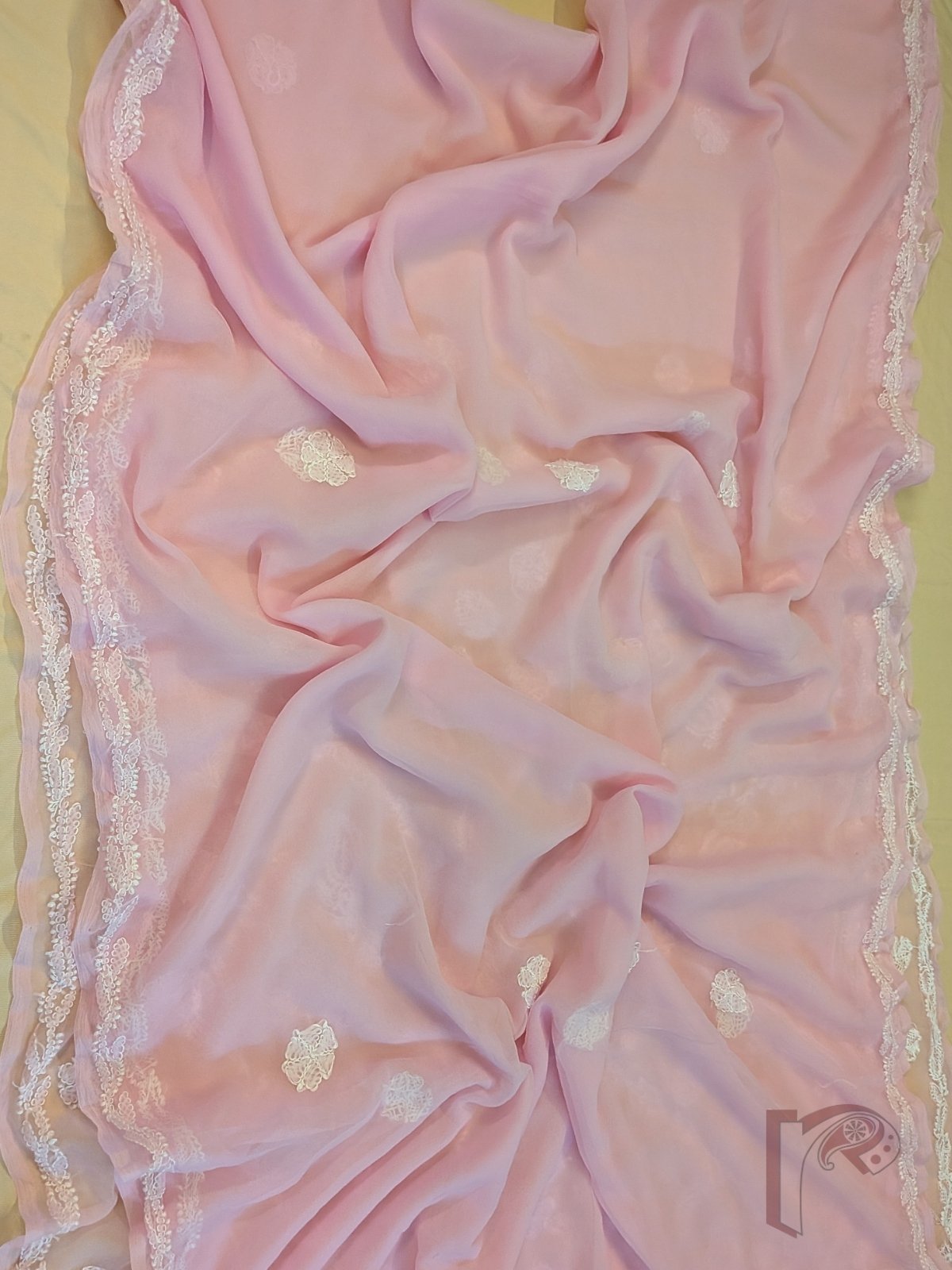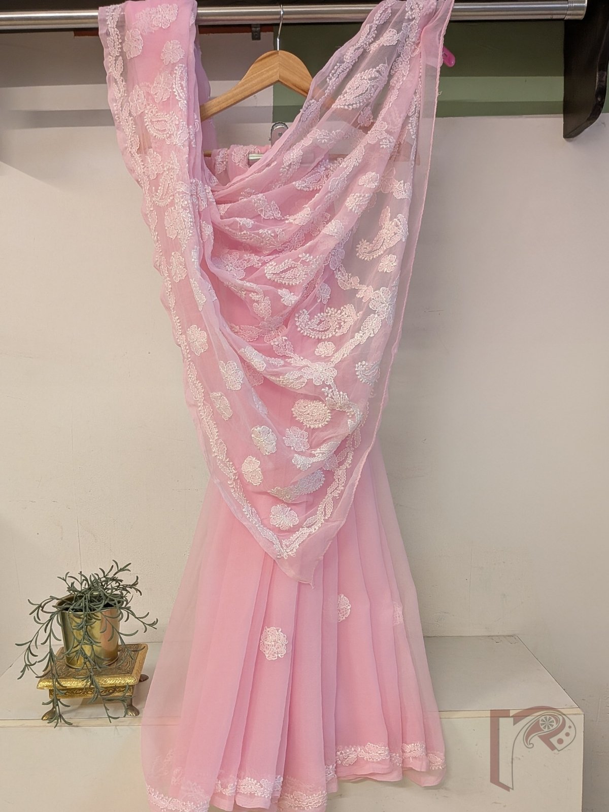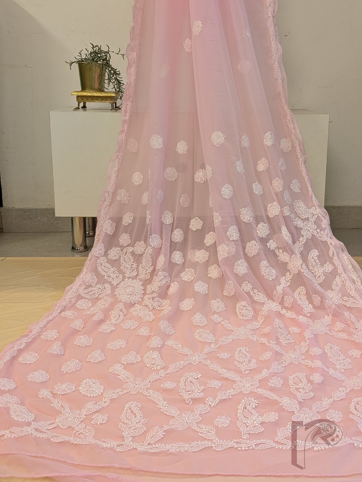 Soft and feminine, this baby pink Lucknowi chiffon saree features delicate chikankari shadow embroidery in white thread that enhances its airy elegance. The pallu is richly decorated with full jal embroidery of mango leaf and floral motifs, creating a beautifully textured handcrafted finish. The body of the saree remains light with subtle scattered floral motifs, adding charm without overwhelming the soft pastel tone. The fluid chiffon fabric gives a graceful fall, lightweight comfort and effortless drape. Paired with a running blouse in matching pink, the sleeves are adorned with triangular shadow embroidery featuring floral motifs, adding coordinated detail. Ideal for day events, festive brunches and elegant celebrations, this saree radiates gentle sophistication.