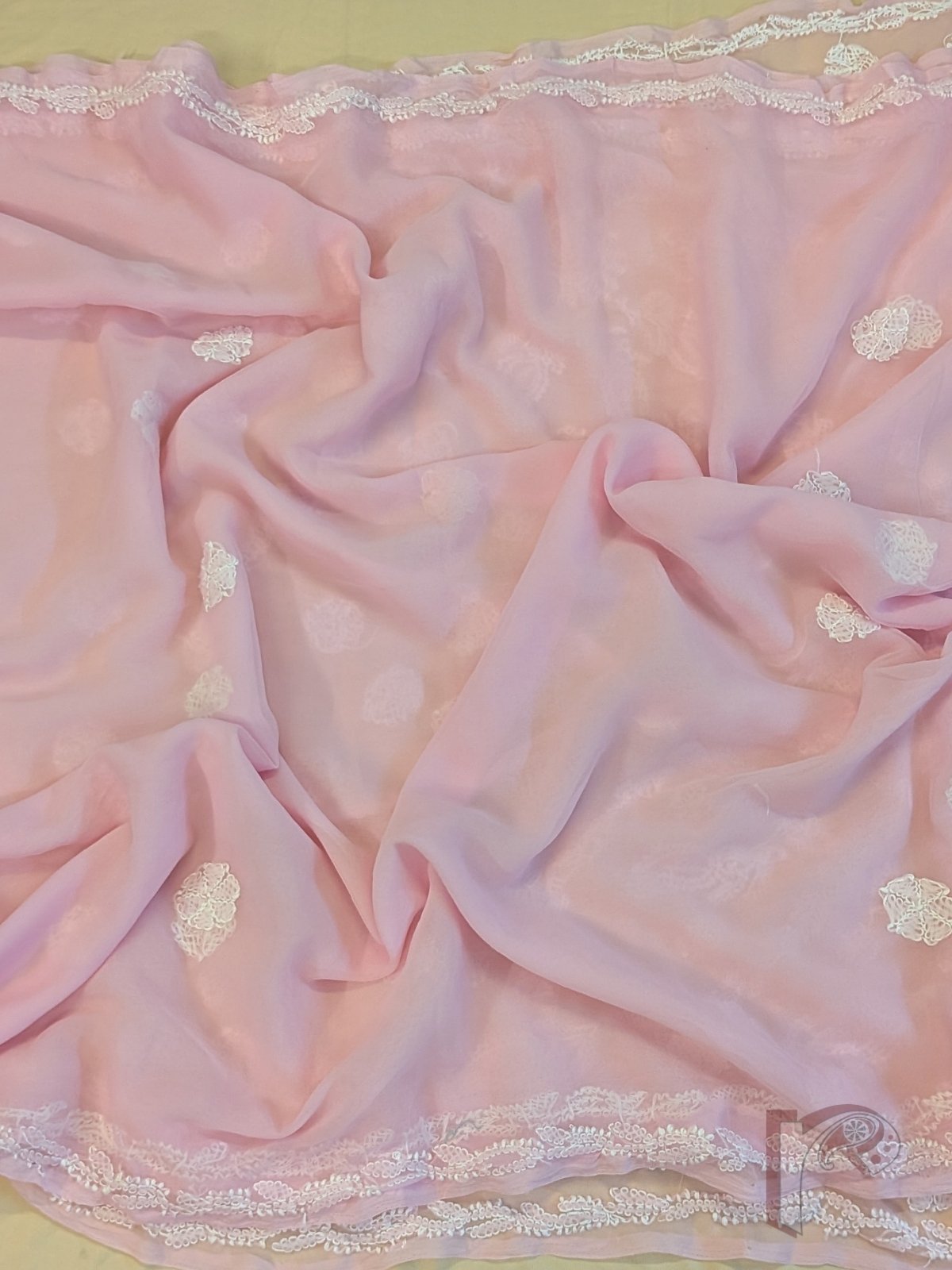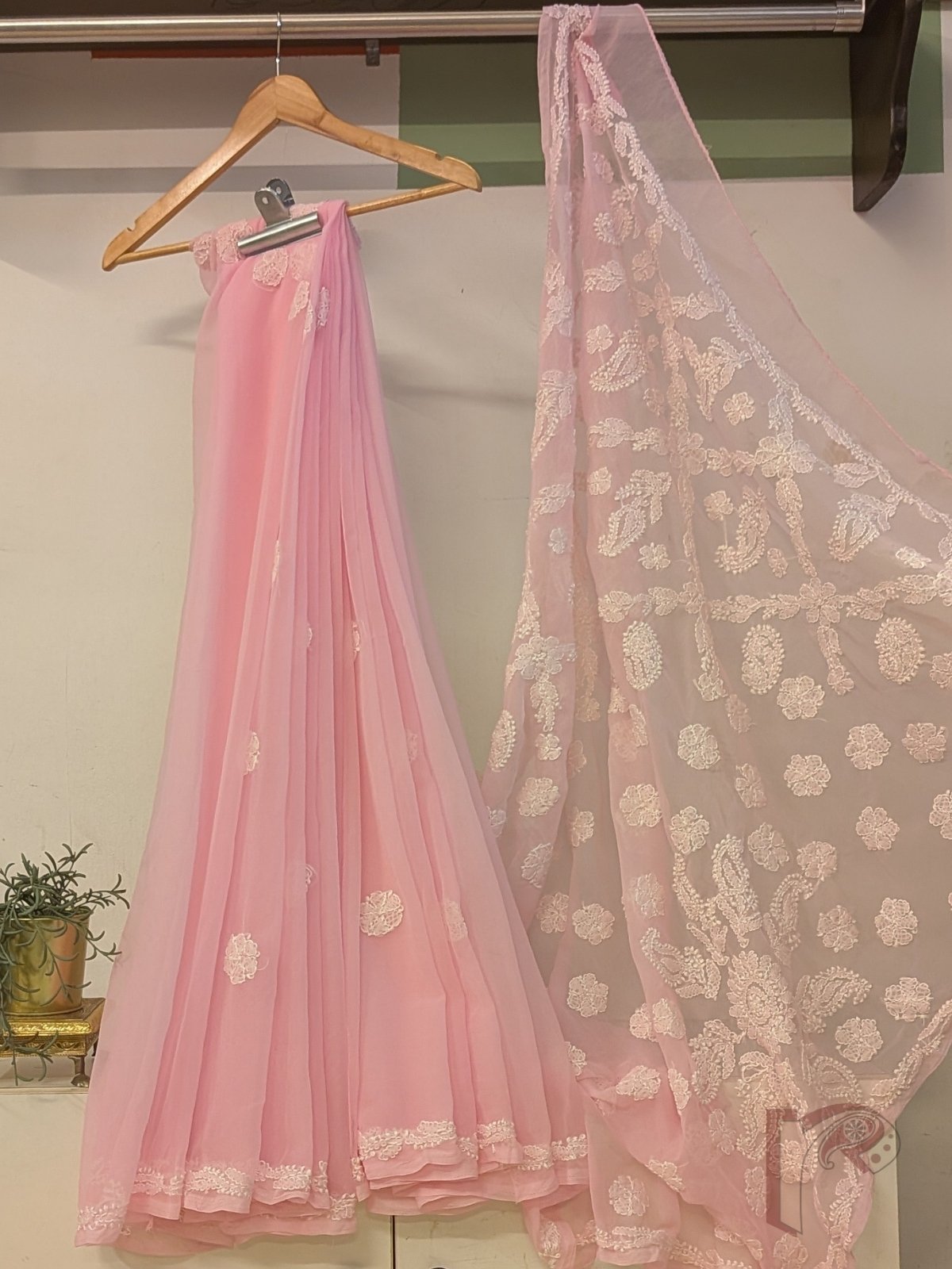 Lucknowi Leher: Baby Pink Lucknowi Chiffon Saree with White Chikankari Shadow Embroidery Mango Leaf Floral Jal Pallu and Minimal Body Motifs