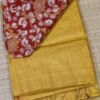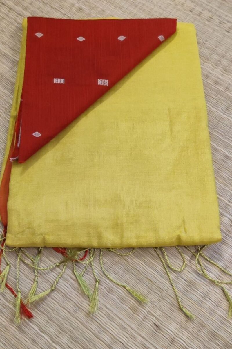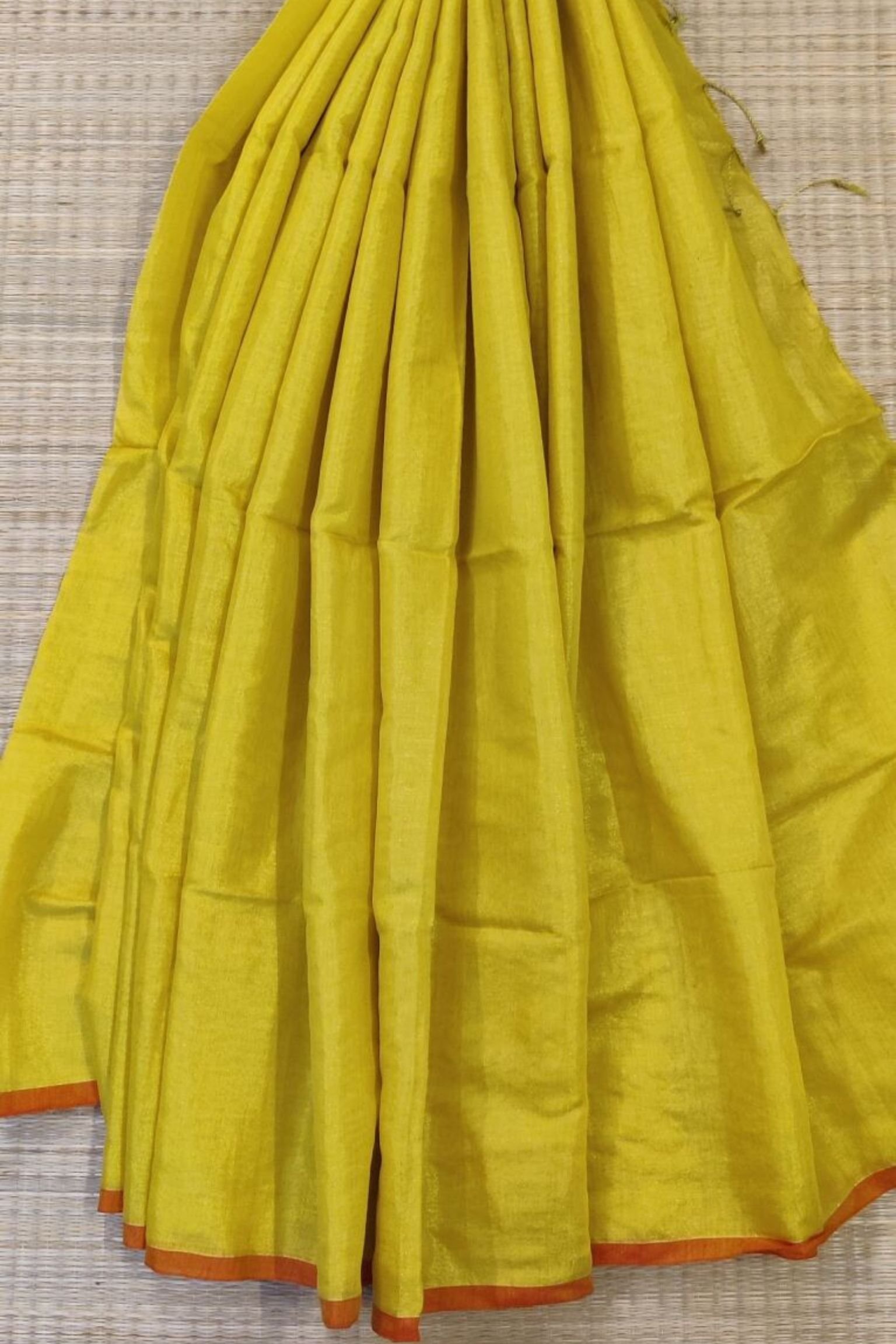 Cheerful and radiant, this bright yellow khadi tissue saree is a celebration of light, joy, and effortless elegance. The 1″ red border adds a vibrant touch that frames the saree beautifully, while the tissue thread woven throughout creates a gentle shimmer that catches the light with every move. This saree is perfect for daytime celebrations or festive occasions, offering both comfort and charm. Its plain body makes it a versatile base for playful or classic blouse pairings. Light on the body yet rich in effect, this saree brings sunshine into every occasion.