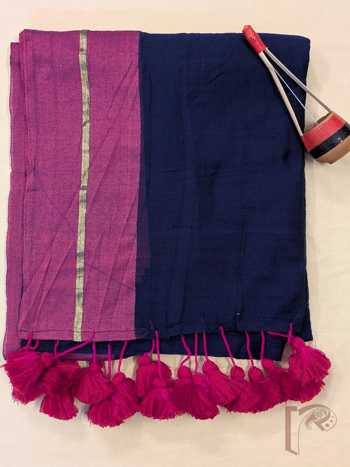 Classic and graceful, this navy blue khadi cotton saree blends deep tones with subtle highlights. The plain navy body is paired with a pink border detailed with a thin gold line, creating a refined and elegant contrast. The hot pink tassels on the pallu add a playful handcrafted finish. Woven in very soft khadi cotton, this saree offers a fluid drape and breathable comfort. The absence of a blouse piece allows you to experiment with statement blouses, making it suitable for both everyday wear and relaxed festive styling.