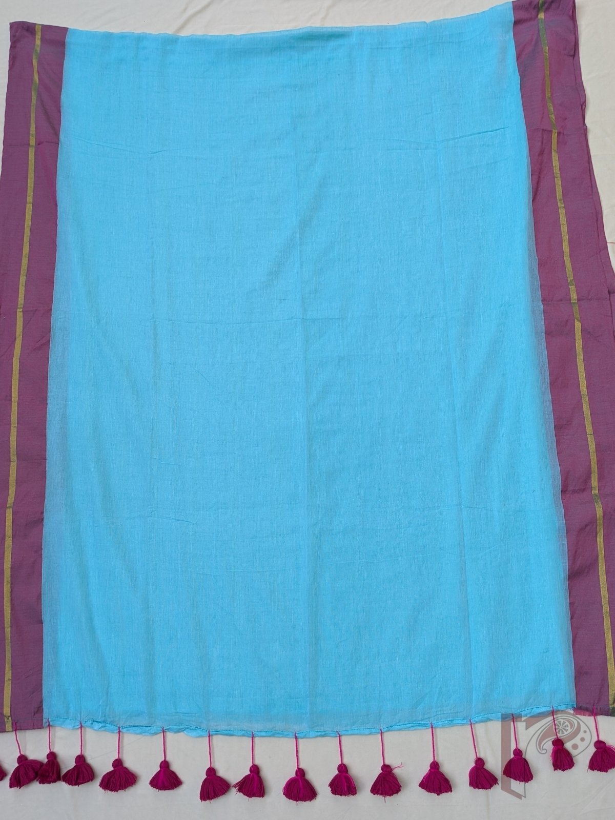 These sarees celebrate minimalism with thoughtful detailing. Each piece features subtle contrast borders with delicate metallic lines, adding a refined highlight to the plain body. The addition of hand-tied tassels on the pallu enhances the artisanal charm while keeping the overall look understated yet distinctive. The simplicity of the body allows the texture of khadi to shine, making these sarees a versatile wardrobe essential for both everyday elegance and casual festive styling.