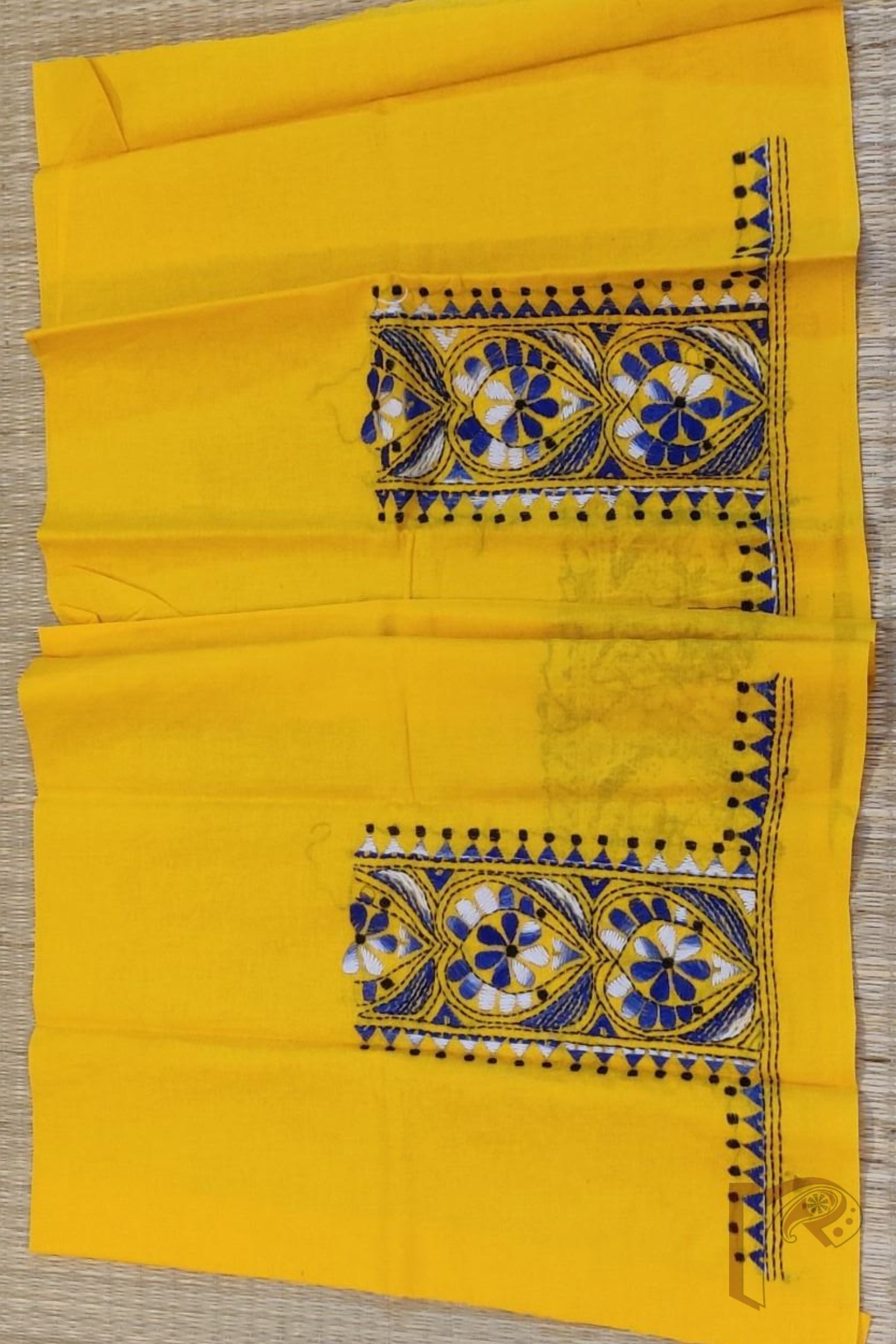Mango Yellow Cotton Blouse with Black Heart and Blue Temple Kantha Embroidery – Unstitched Fabric