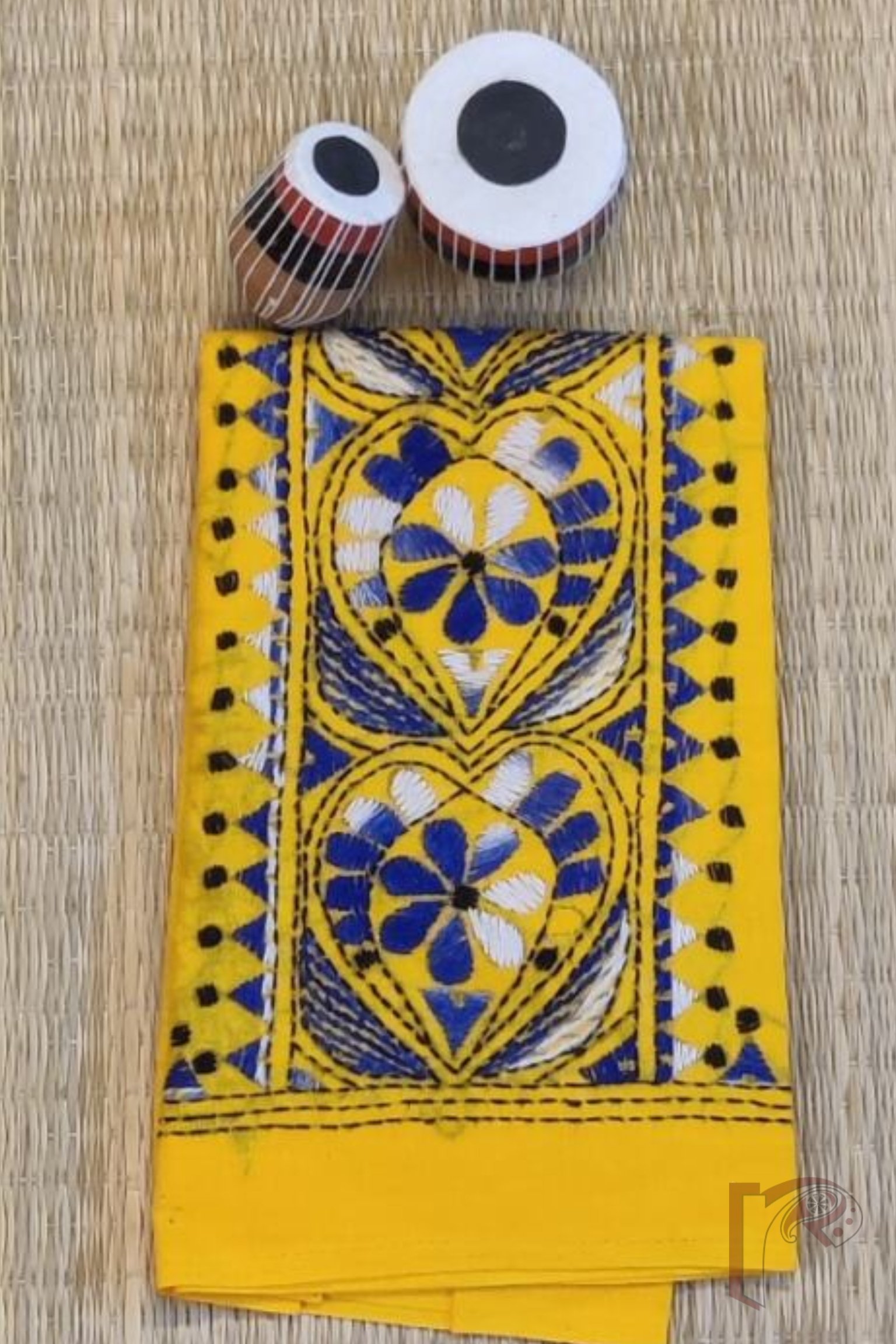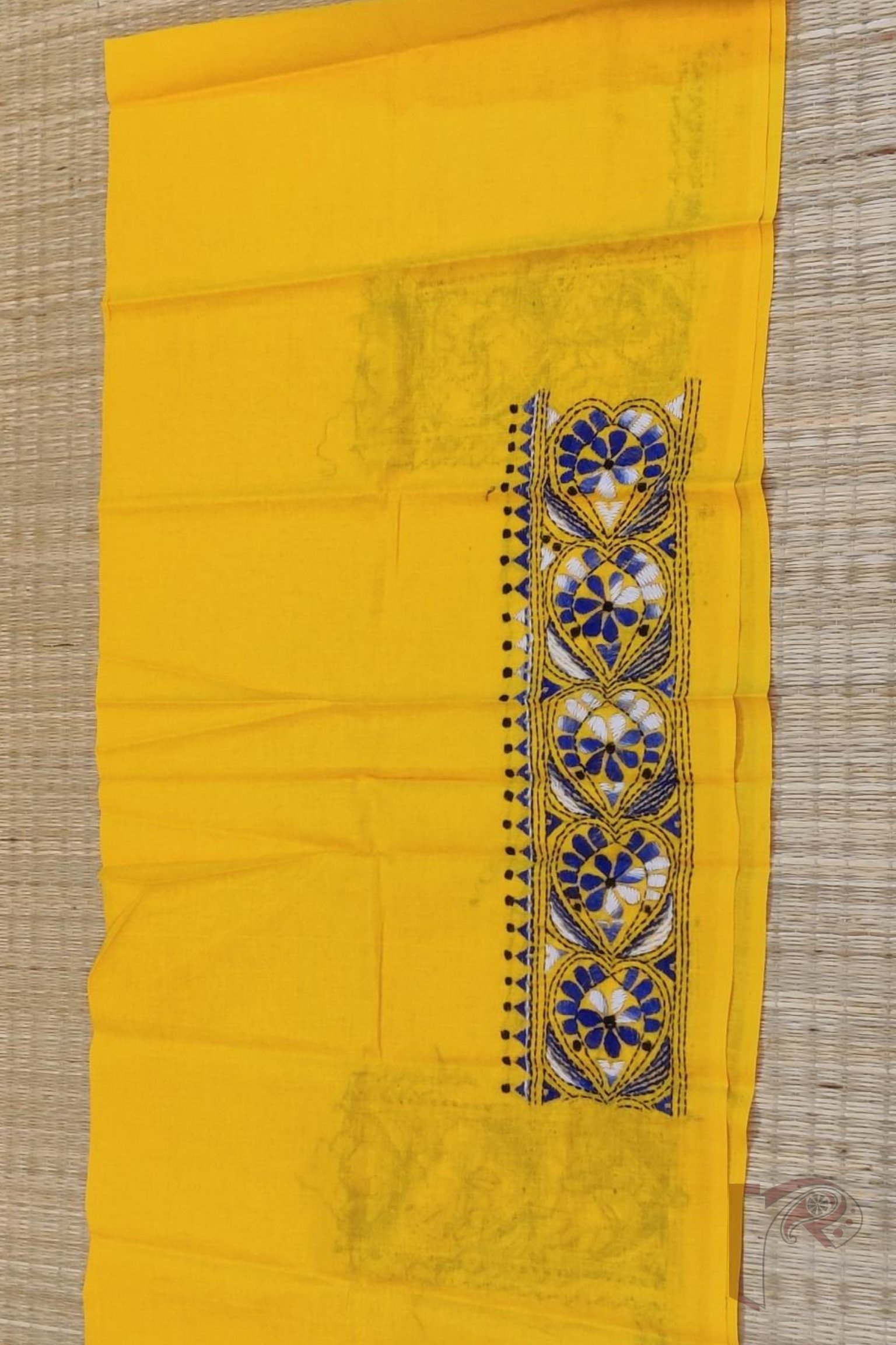 A lively mango yellow cotton blouse piece intricately embroidered with a heart-shaped black floral motif at its center, alongside a temple-inspired kantha embroidery in shaded blue thread, offering a beautiful blend of folk spirituality and floral grace. The play of color and symbolism makes this a stunning piece for festive wear. The contrast threads stand out against the yellow backdrop, while the traditional composition gives it an old-world charm with a fresh twist.