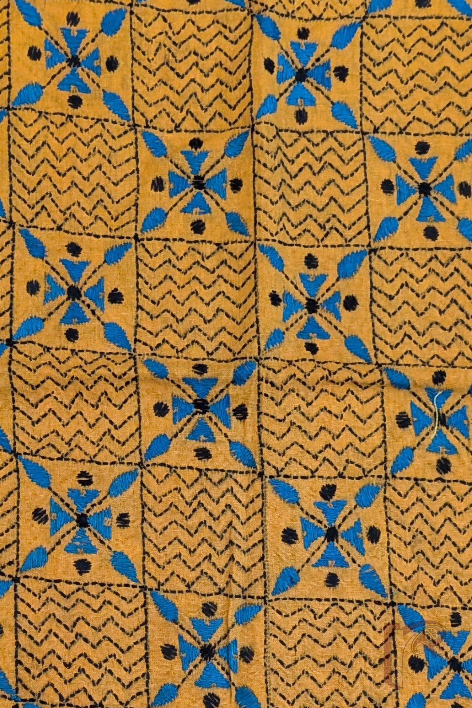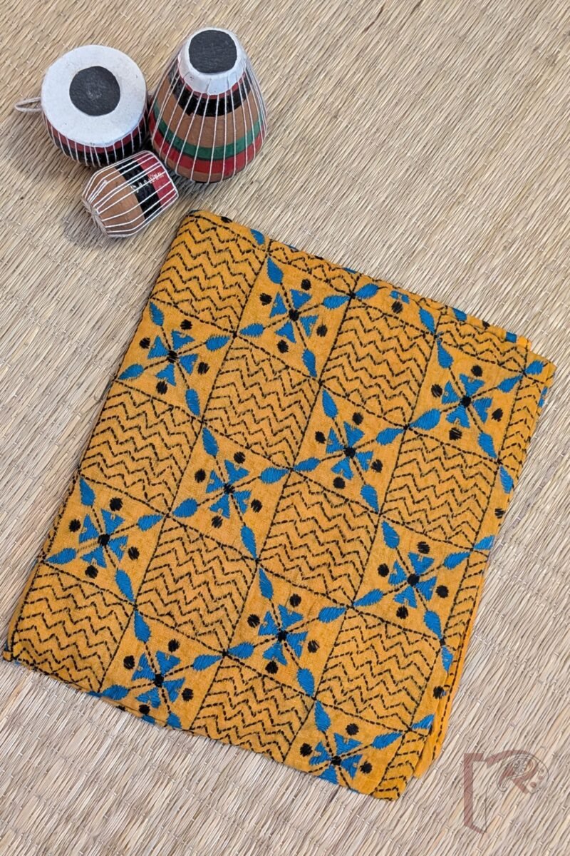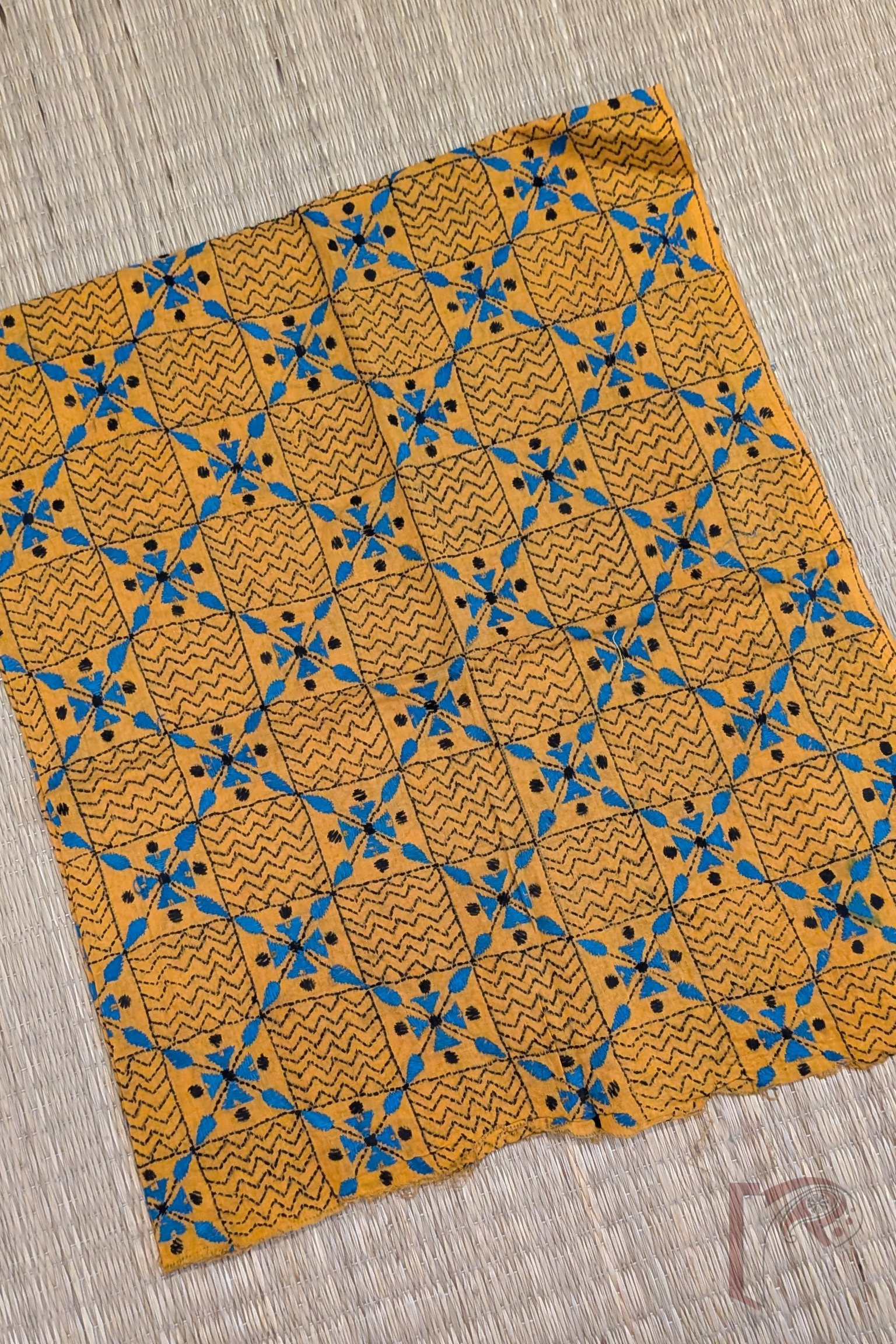 A striking mango yellow cotton blouse piece adorned with all-over Kantha embroidery, this design features geometric zigzag lines and delicate blue floral motifs enclosed within a box-style grid stitched in black thread. The structured grid contrasts beautifully with the fluid hand embroidery, creating a visually engaging pattern. Bright, breathable, and handcrafted, this blouse adds depth and vibrancy to handloom and cotton sarees, making it ideal for day festivities and artistic styling.