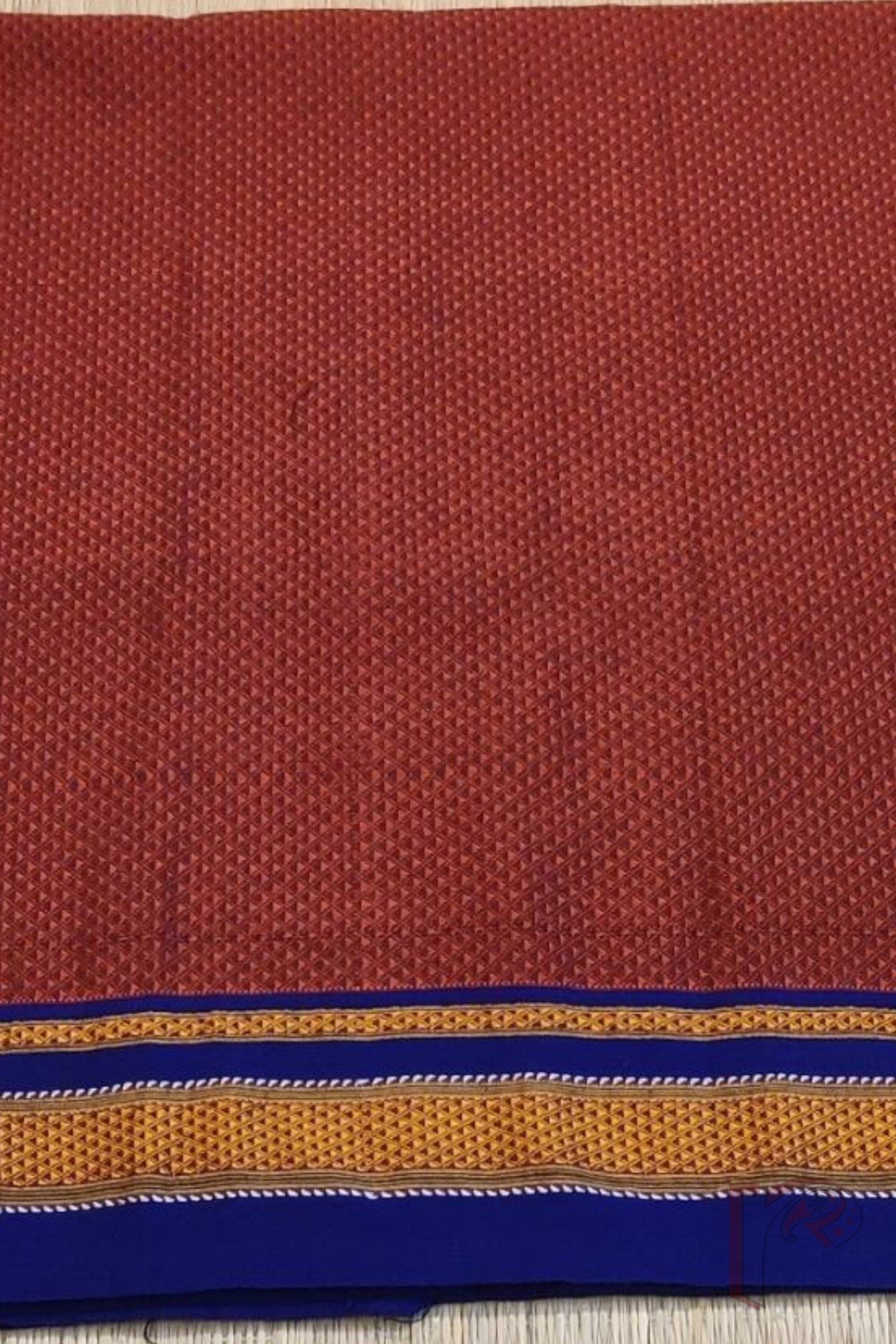 A deep maroon Khun weave blouse piece elevated with a stunning blue border intricately woven with gold and white threads. The regal palette paired with the softness of cotton silk makes this a versatile choice for weddings or celebratory occasions. The contrast edge adds a pop of tradition with a bold modern twist.