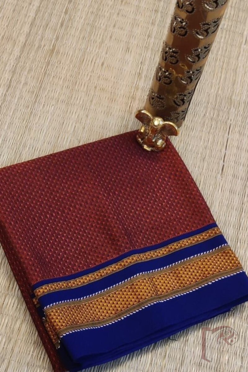 Maroon and Blue Khun Weave Ilkal Blouse Piece with Golden-White Thread