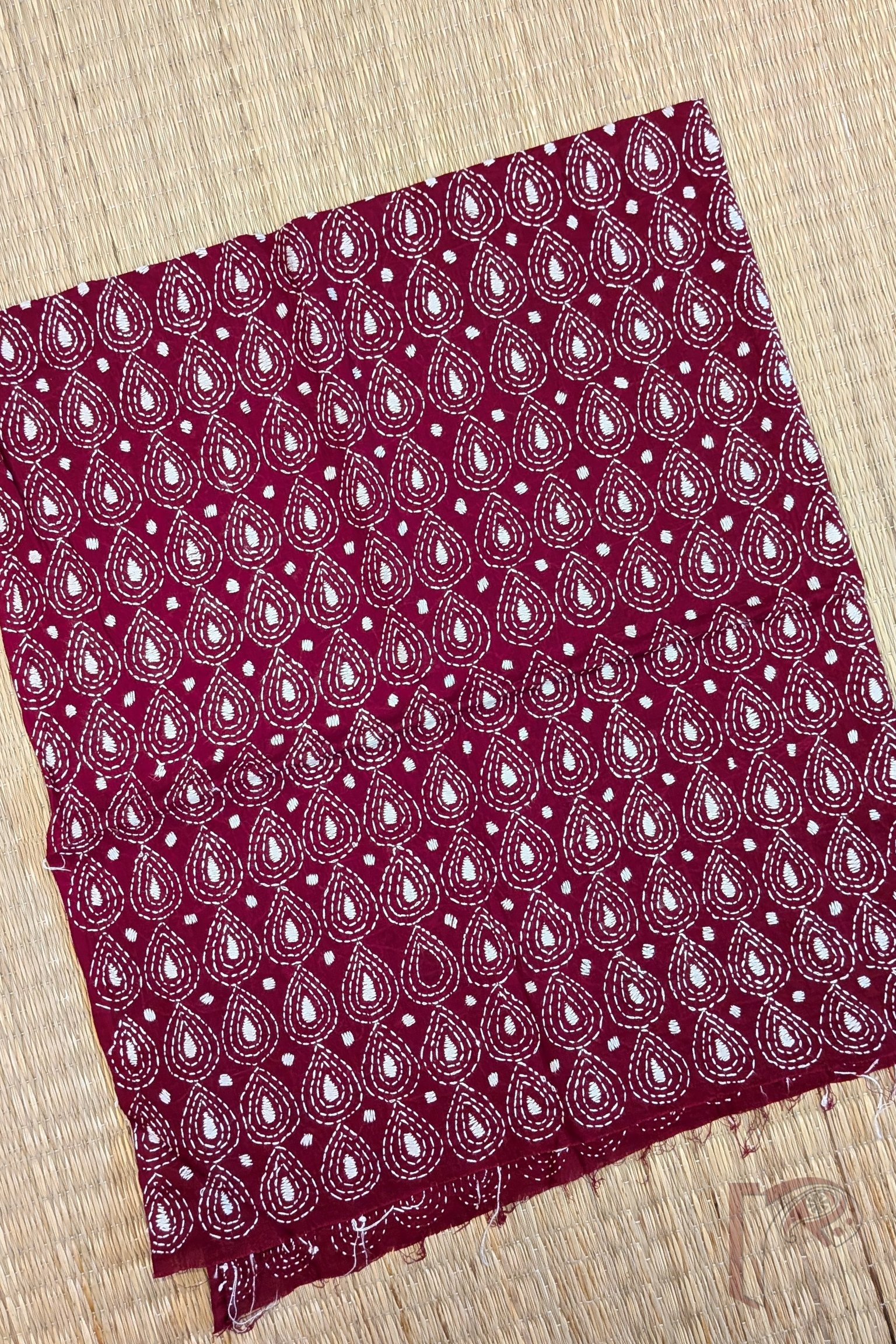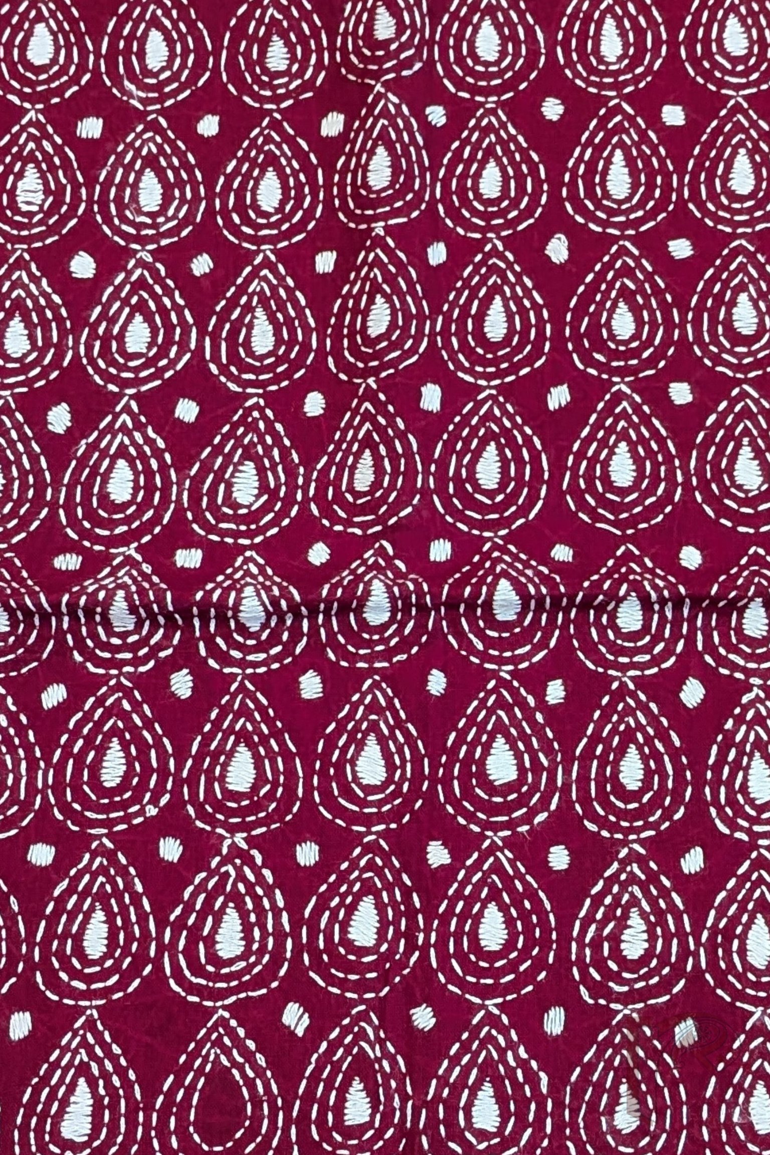 An elegant maroon cotton blouse embellished with all-over Kantha embroidery in white thread, this piece features graceful tear drop motifs formed in three concentric outlines, alongside fully filled tear drop patterns and circular accents. The rhythmic repetition of motifs creates a rich texture while maintaining visual balance. Classic colour contrast and detailed handwork make this blouse a timeless choice for festive sarees, embodying refined craftsmanship and heritage elegance.