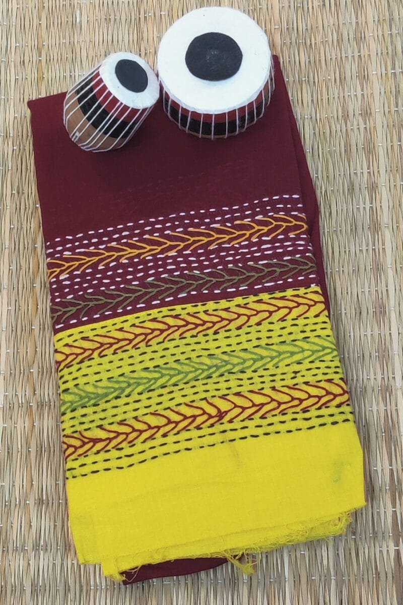 Rich and festive, this maroon cotton blouse is beautifully offset with a yellow cotton attached border, creating a warm and traditional colour combination. The blouse is embellished with multicolour hand embroidery, adding handcrafted detail and visual interest. Comfortable cotton fabric makes it easy to wear, while the vibrant embroidery ensures it pairs effortlessly with handloom sarees. This piece offers a bold yet elegant handcrafted look perfect for festive styling.