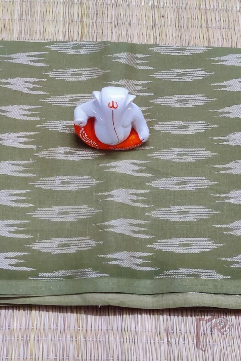 An earthy mehendi green cotton base is detailed with cream M-shaped abstract motifs, woven in silk threads. A rare and intriguing design, perfect for adding character to solid sarees.