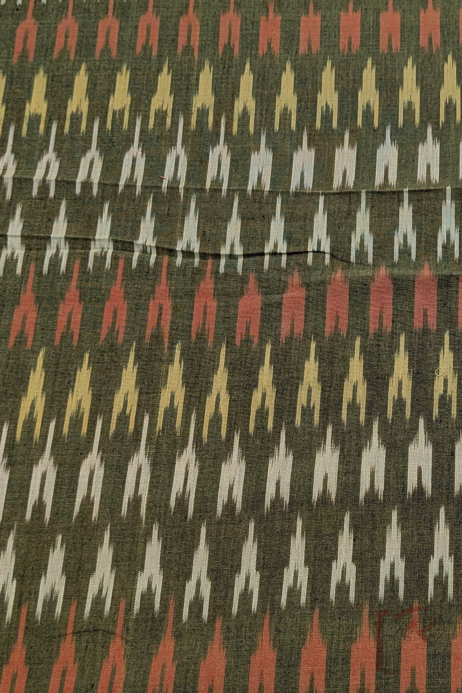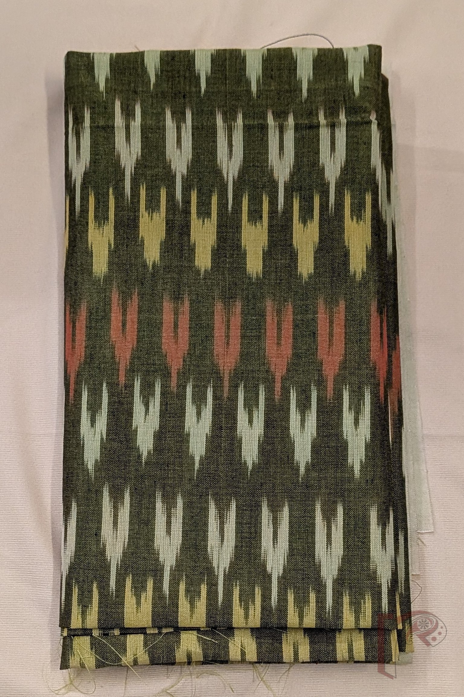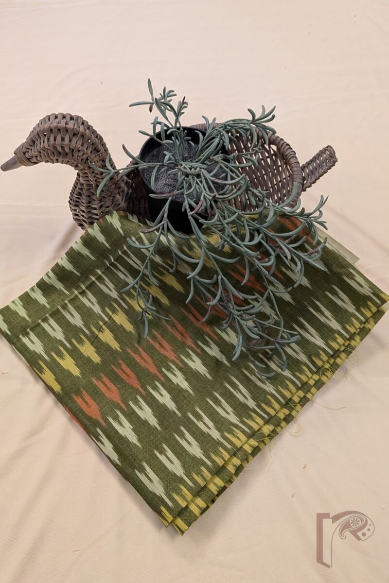Rich and festive, this mehndi green dual tone mercerized Ikkat blouse piece is beautifully adorned with traditional Ikkat weave motifs arranged alternately in shades of orange, yellow, and pista green. The deep mehndi base carries a subtle dual-tone effect that adds dimension and visual depth, while the alternating multicolor motifs create a rhythmic and celebratory pattern across the fabric. The precision of the resist-dyed technique enhances the soft-edged charm that defines authentic Ikkat craftsmanship. Made from high-quality mercerized cotton with a smooth, silk-like sheen, this blouse piece offers enhanced color vibrancy, superior strength, and breathable comfort. Its luminous finish and intricate traditional detailing make it a perfect choice for festive sarees and grand ethnic styling.