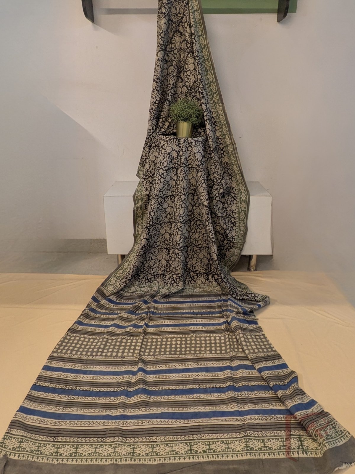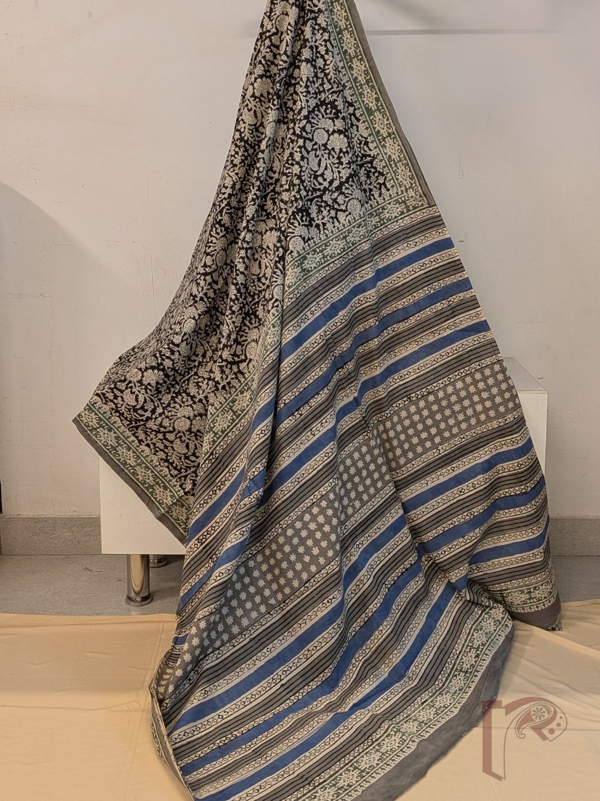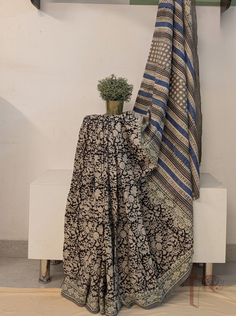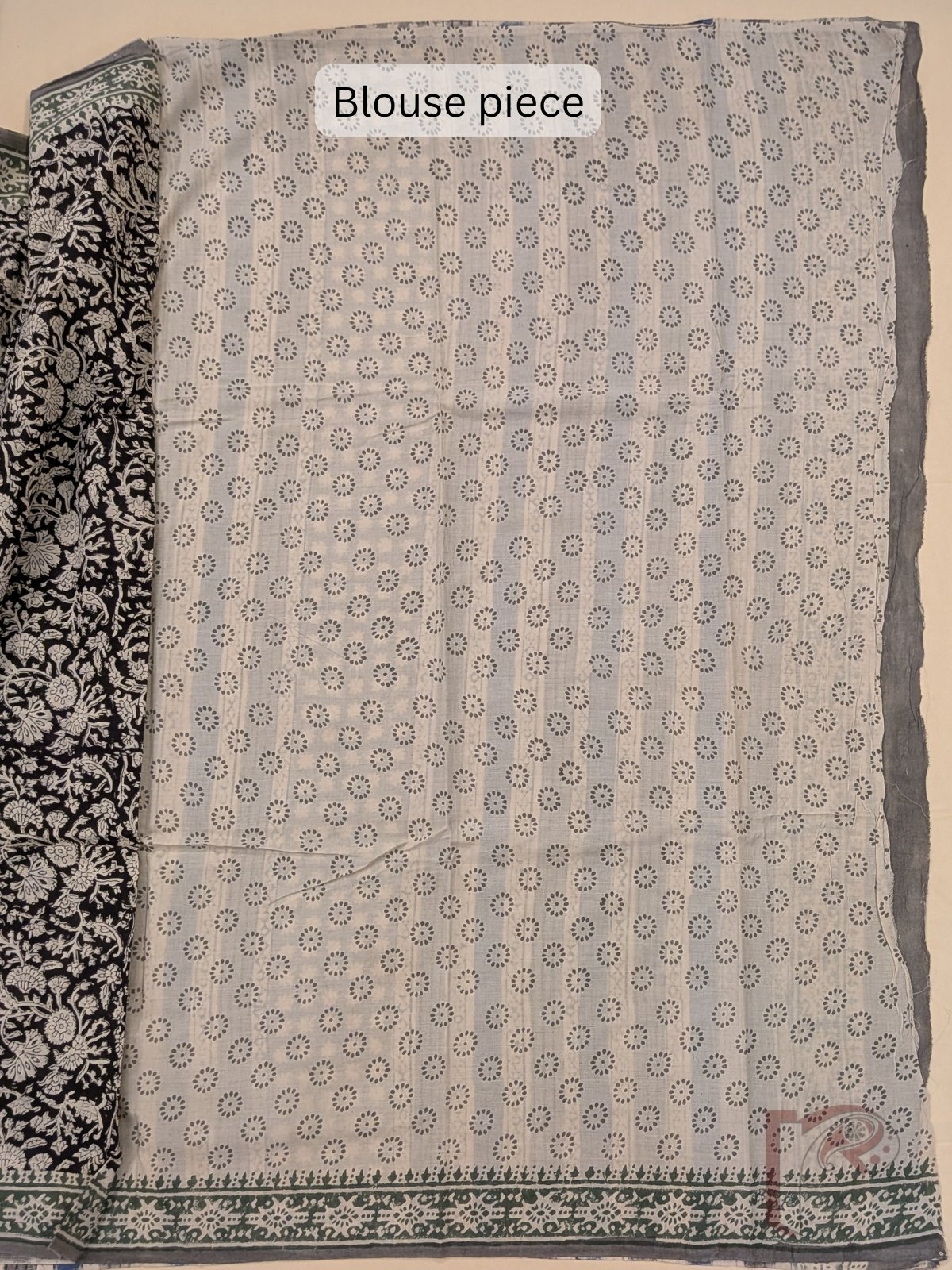 Artful and distinctive, this black and cream mul cotton saree features a vanaspati hand printed Kalamkari-style design across the body, blending traditional storytelling with contemporary balance. The saree is finished with a subtle 2-inch sage green border, adding a soft earthy contrast to the monochrome palette. The pallu showcases a combination of stripes, small diamonds, and cloud-like motifs, rendered in black outlines and cream, with grey and blue accents interspersed for a refined layered effect. Crafted in soft, breathable mul cotton, this saree drapes effortlessly for all-day comfort. The ensemble is completed with a cream blouse printed with small rounded grey floral motifs, enhancing the understated elegance.