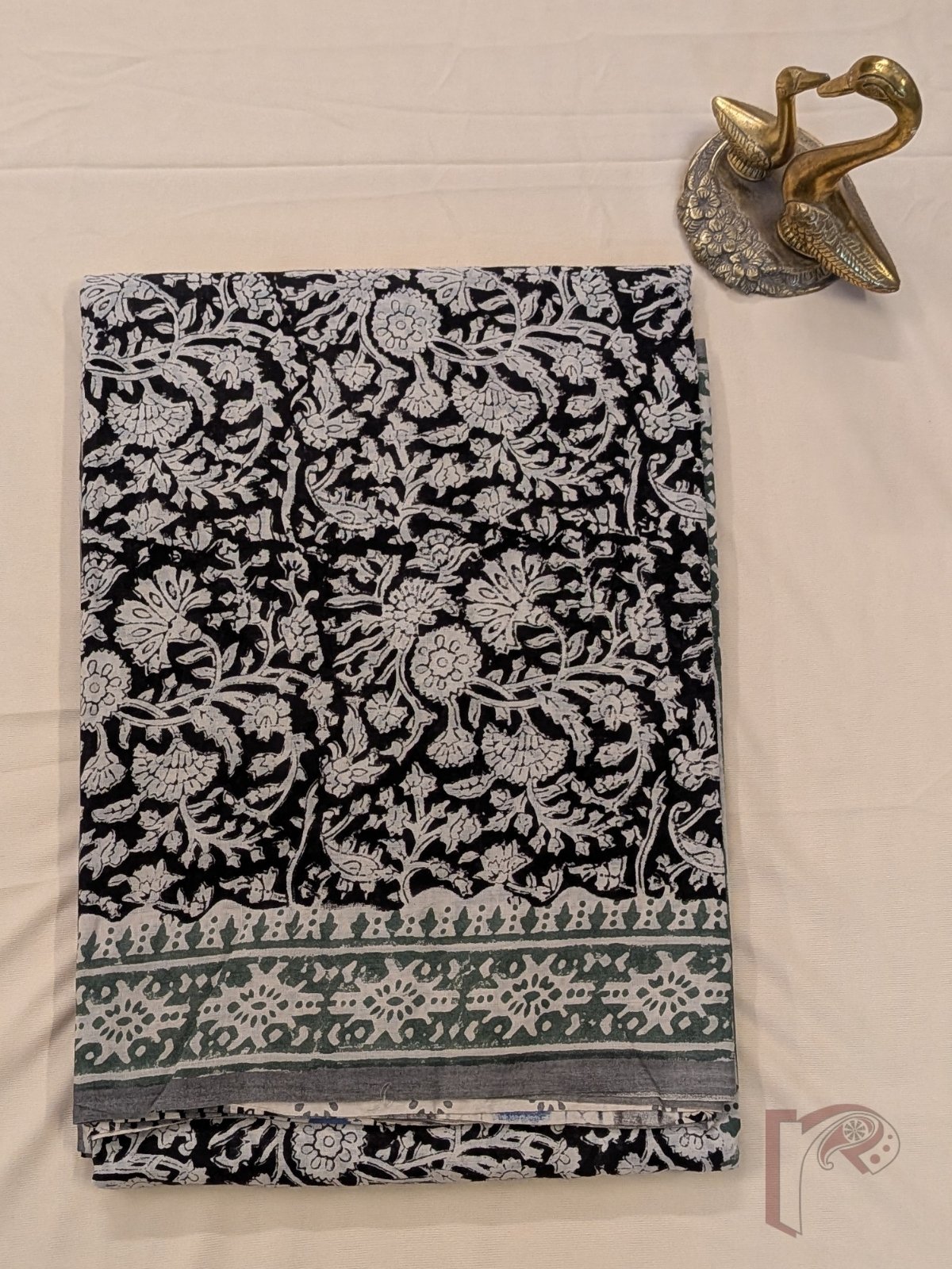 Mulmul Muse – Black and Cream Mul Cotton Saree with Kalamkari Vanaspati Print and Sage Green Border
