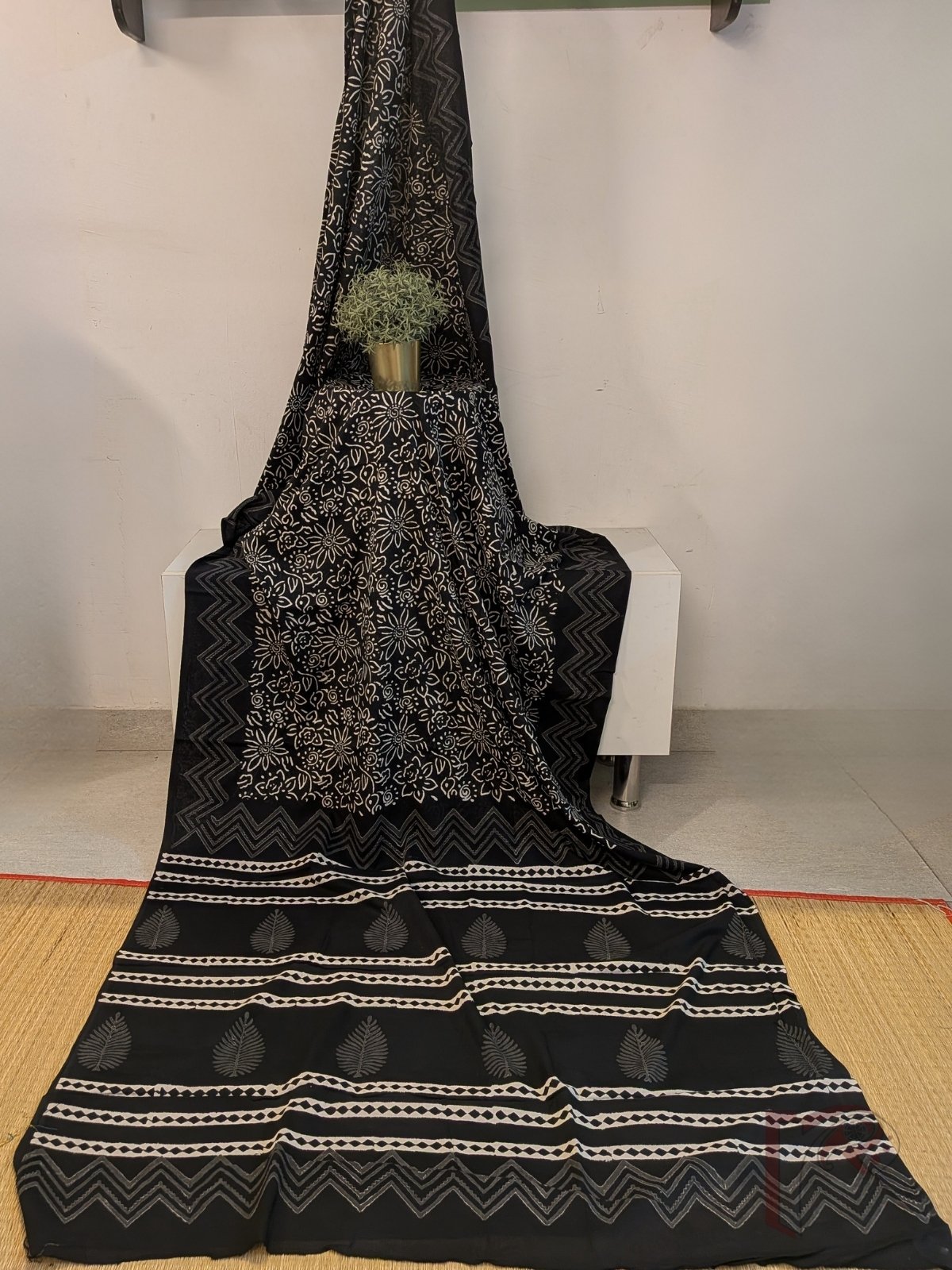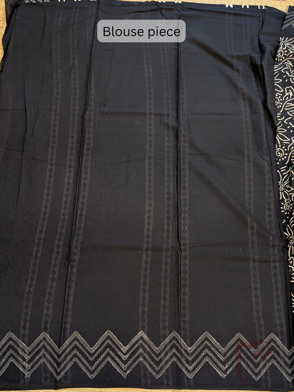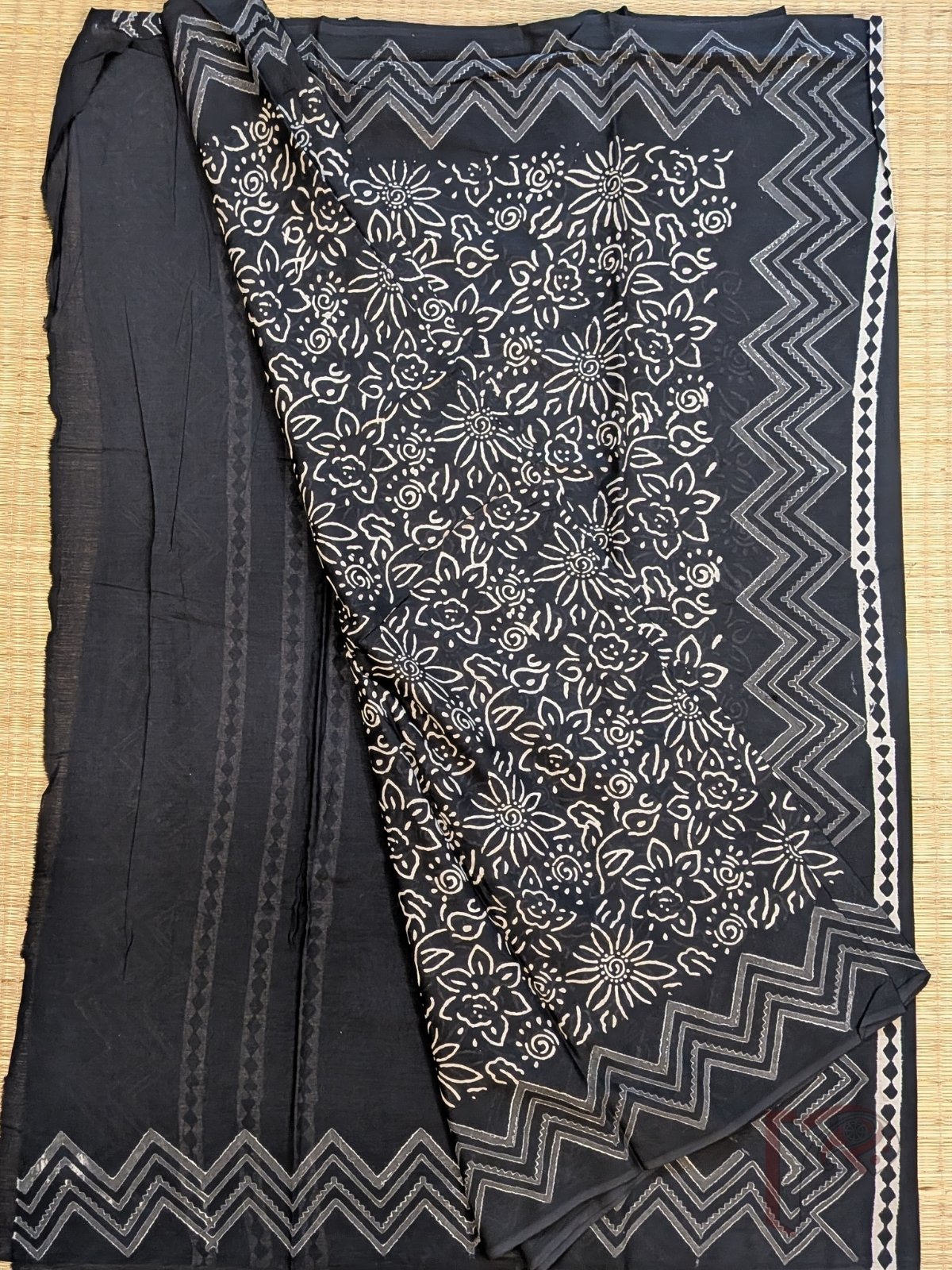 Graceful and contemporary, this black mulmul cotton saree features delicate white floral outline prints across the body, creating a soft contrast. The saree is framed with grey zigzag borders, forming a geometric rhythm that continues into the pallu with layered zigzag, white stripe, diamond, and leaf motifs. Crafted in fine soft mulmul cotton, the saree offers a light airy feel and elegant drape. The running blouse with grey zigzag border enhances the coordinated aesthetic, making this piece both refined and versatile.
