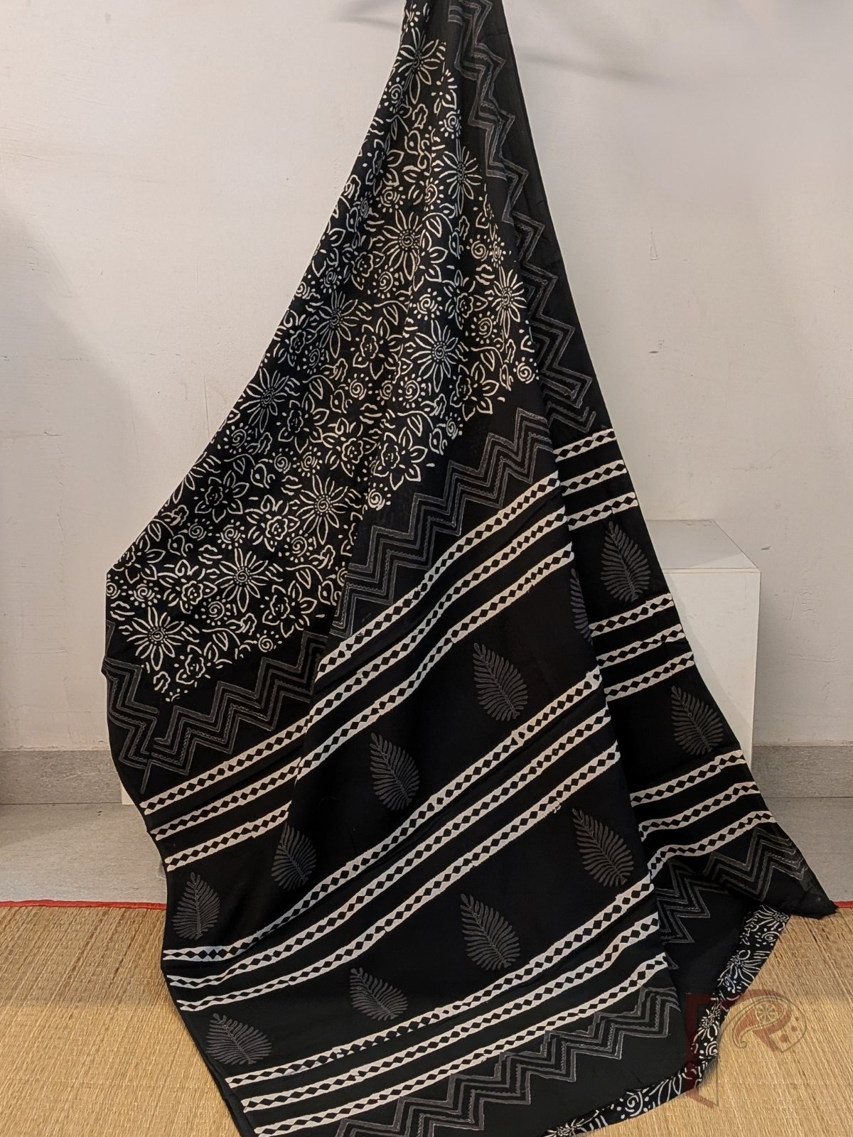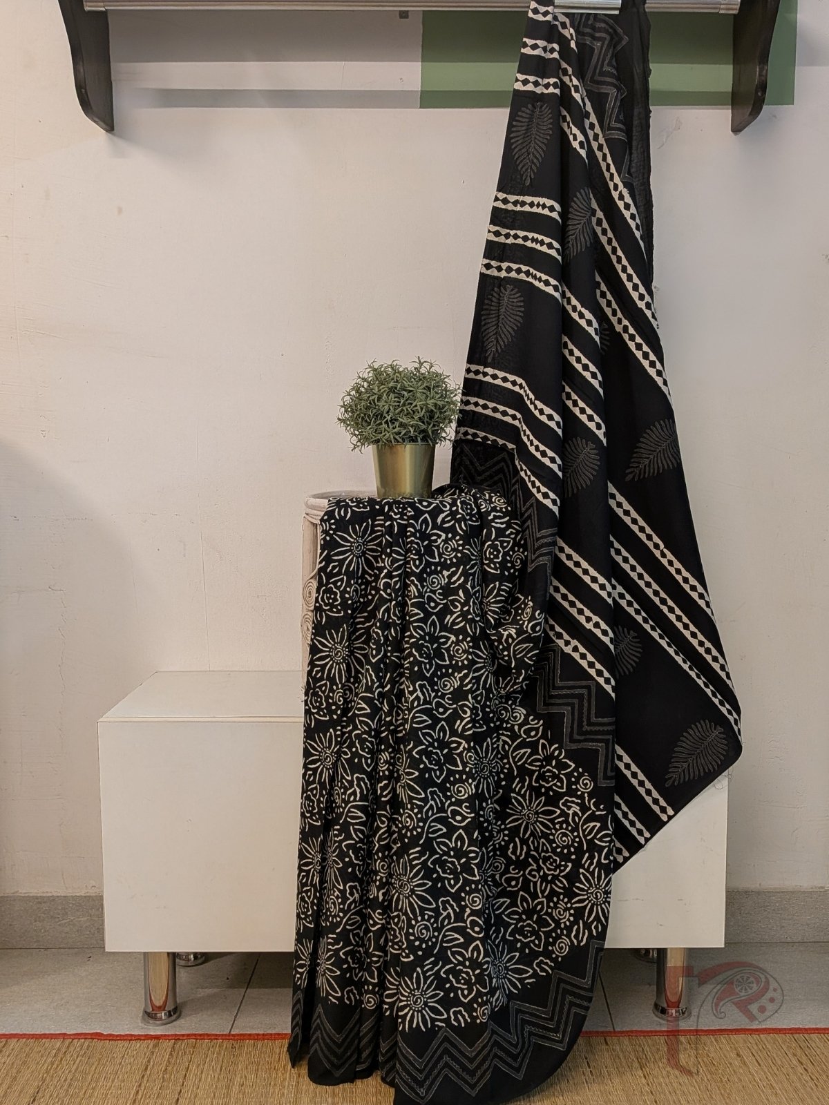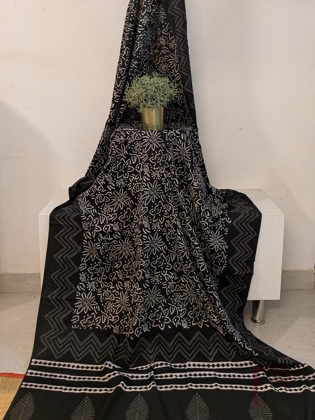 Graceful and contemporary, this black mulmul cotton saree features delicate white floral outline prints across the body, creating a soft contrast. The saree is framed with grey zigzag borders, forming a geometric rhythm that continues into the pallu with layered zigzag, white stripe, diamond, and leaf motifs. Crafted in fine soft mulmul cotton, the saree offers a light airy feel and elegant drape. The running blouse with grey zigzag border enhances the coordinated aesthetic, making this piece both refined and versatile.
