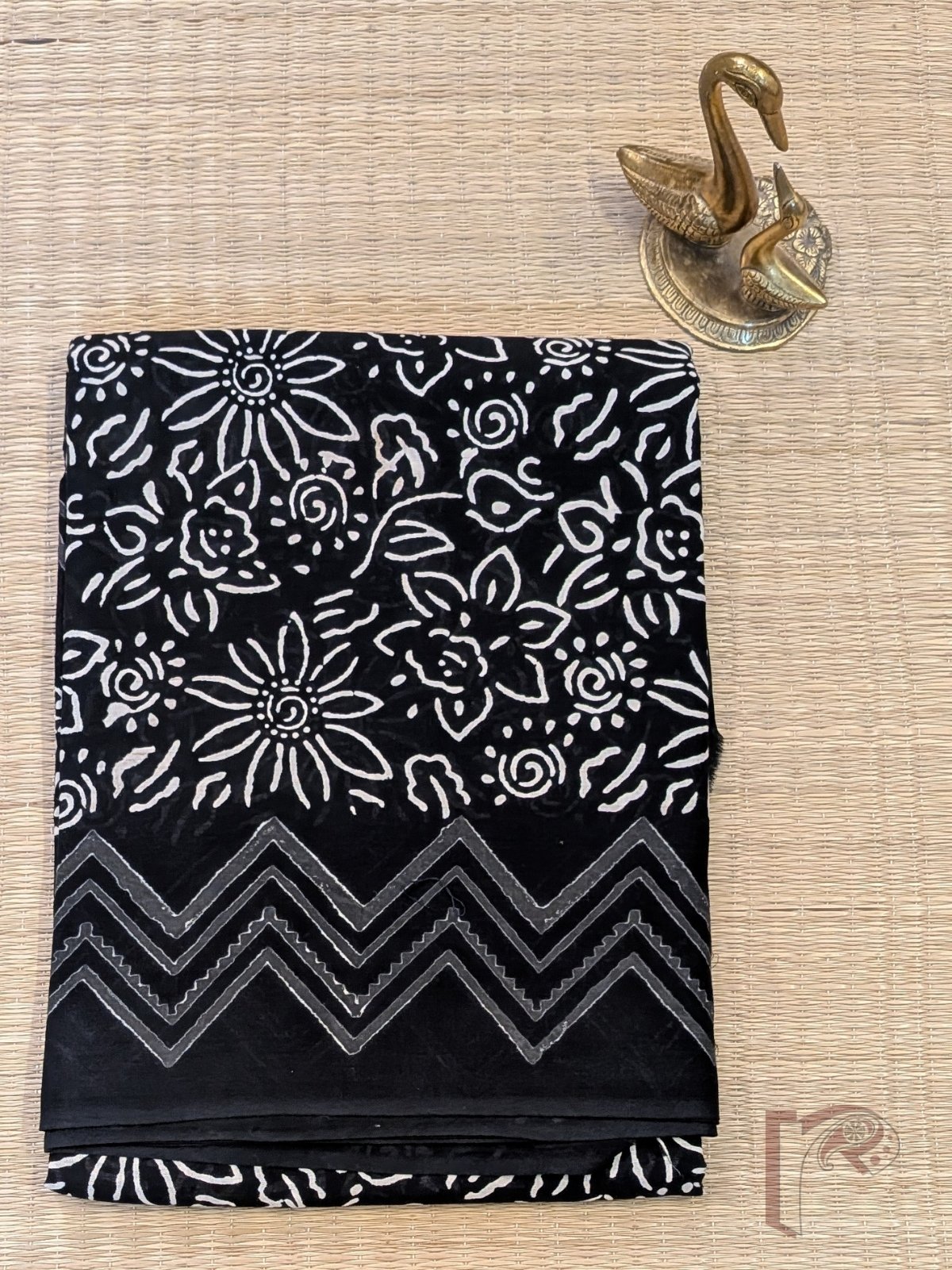 Mulmul Muse – Black Mulmul Cotton Saree with White Floral Outline and Grey Zigzag Border
