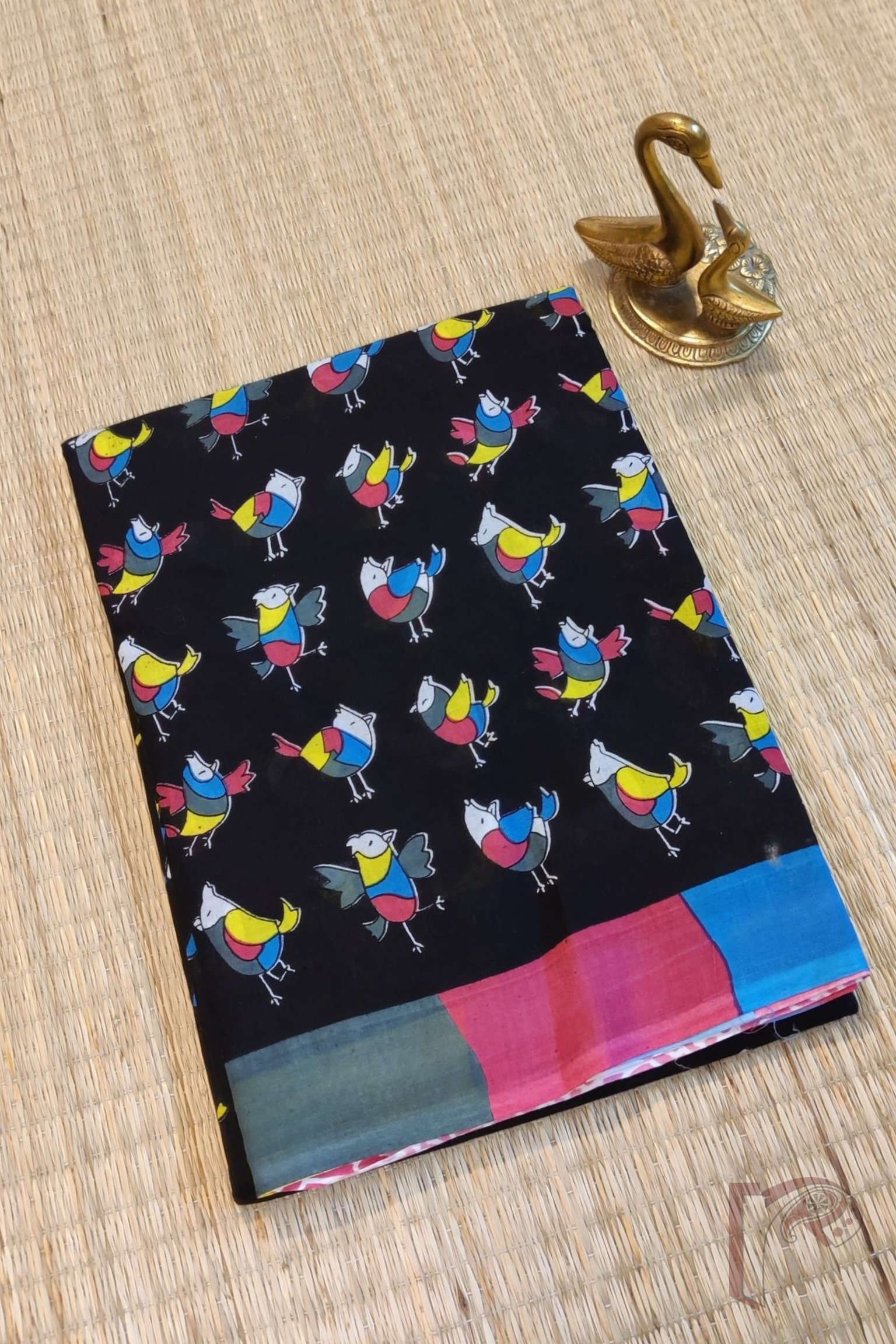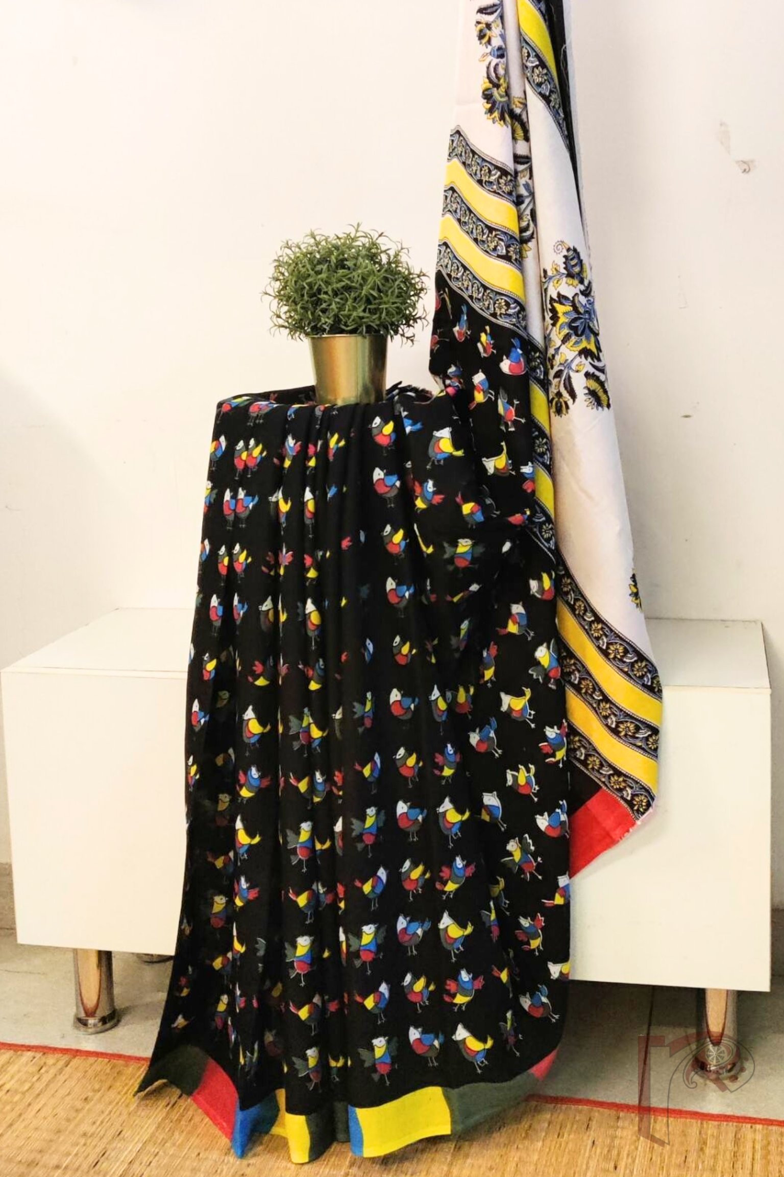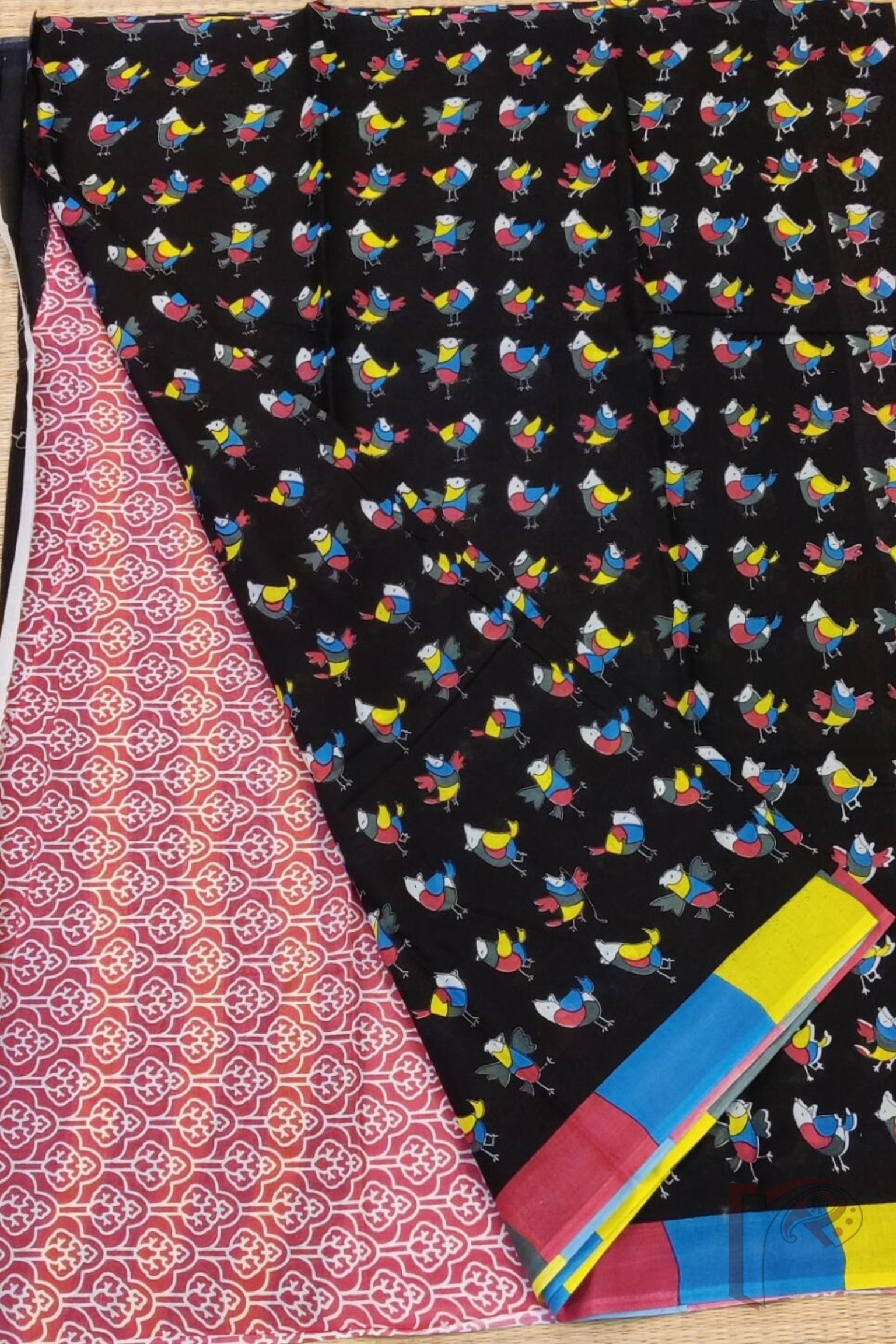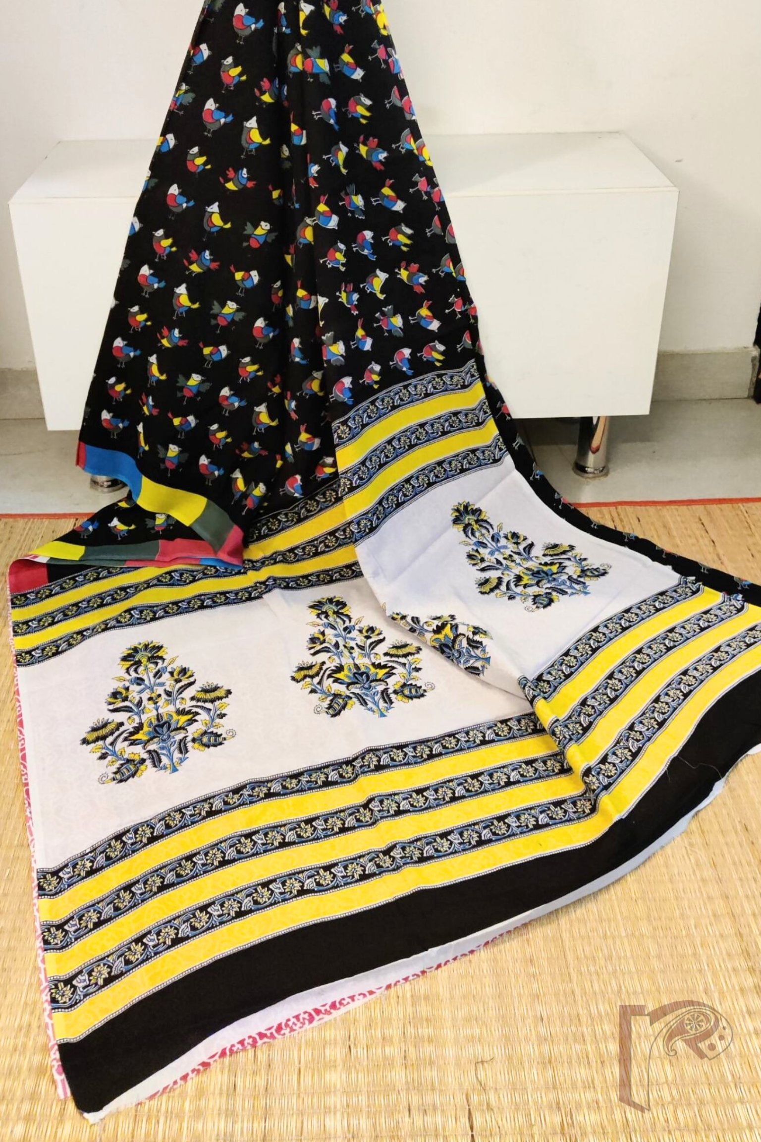 Mulmul Muse – Black Soft Cotton Mul Saree with Multicolour Bird Motifs and White Pallu with Bold Floral Prints