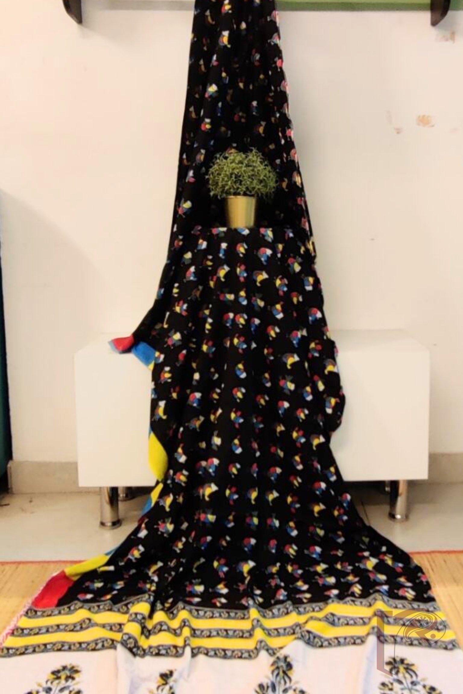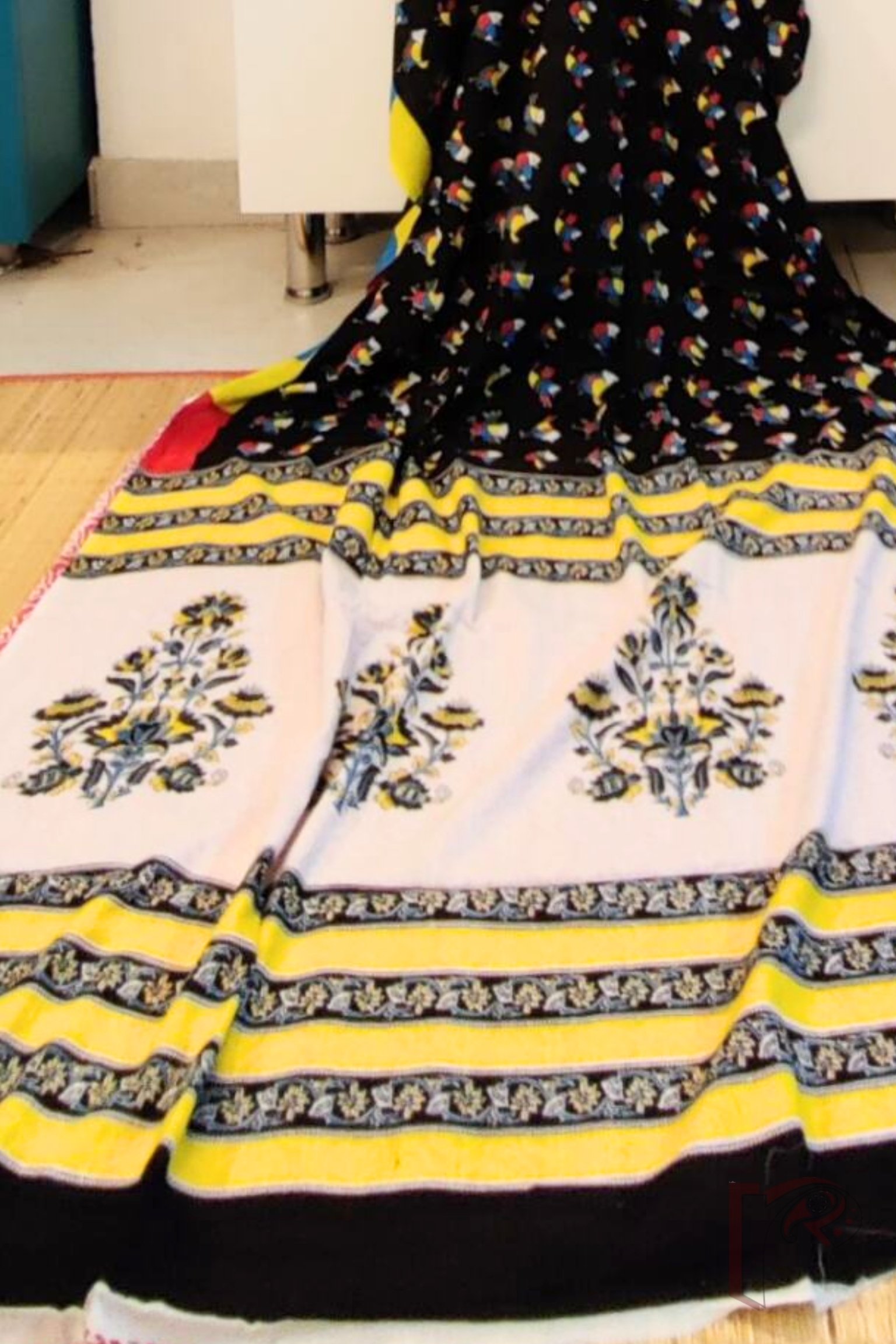 This black soft cotton mul saree brings a whimsical twist to everyday elegance with its trendy bird motifs printed across the body in shades of pink, blue, and yellow, giving it a refreshing and youthful vibe. The vibrant tri-colour border enhances its playful charm, while the contrasting white pallu features four large floral motifs and bold black and yellow stripes, making a striking statement. The saree is paired with a pink blouse printed in white, tying the look together with a soft yet lively finish. Lightweight, breathable, and artfully designed, this saree is perfect for those who love artistic details with a hint of drama.