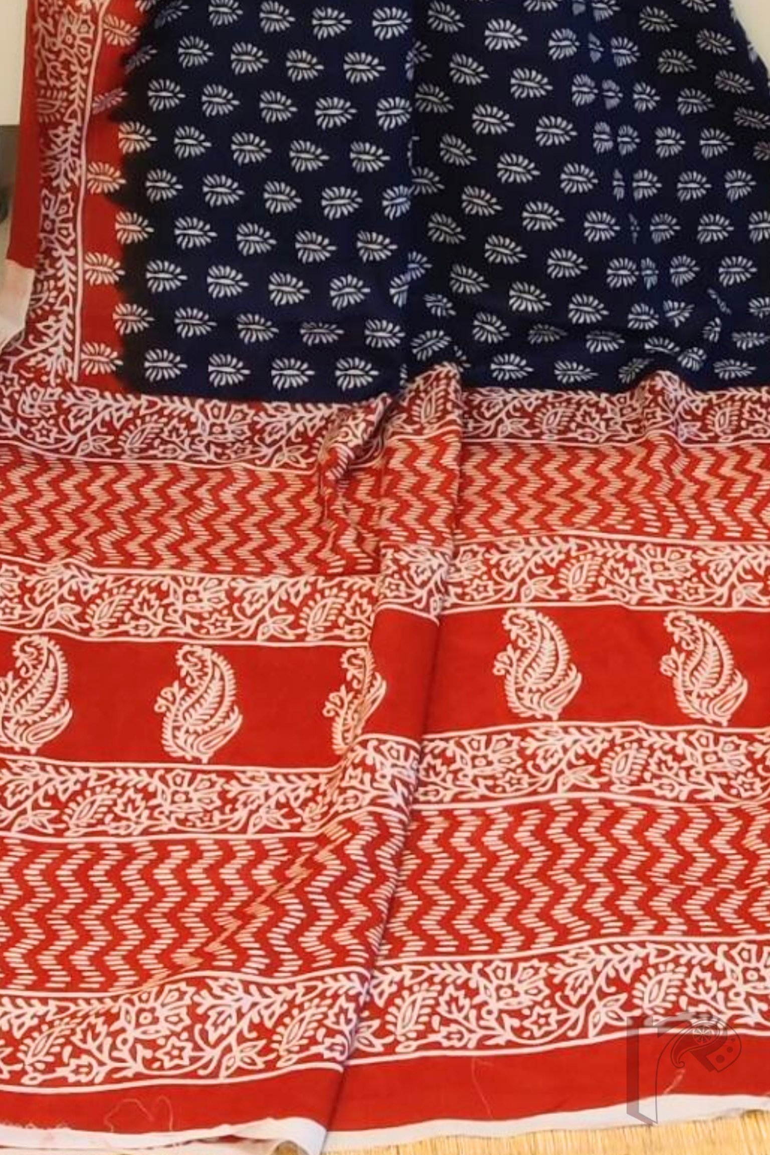 This charming blue Mulmul cotton saree is a soft and breathable statement in bold contrast and heritage printwork. The saree features small white block-printed leaves scattered across the body, along with a traditional floral and leaf motif that adds a touch of ethnic elegance. The vibrant red borders on both sides frame the design beautifully, while the red pallu creates a striking visual break enriched with block-printed details. The look is completed with a matching red blouse piece, also adorned with subtle block prints to tie the ensemble together. Ideal for festive mornings, casual evenings, or culturally rooted events, this saree blends vibrancy with tradition in a timeless drape.