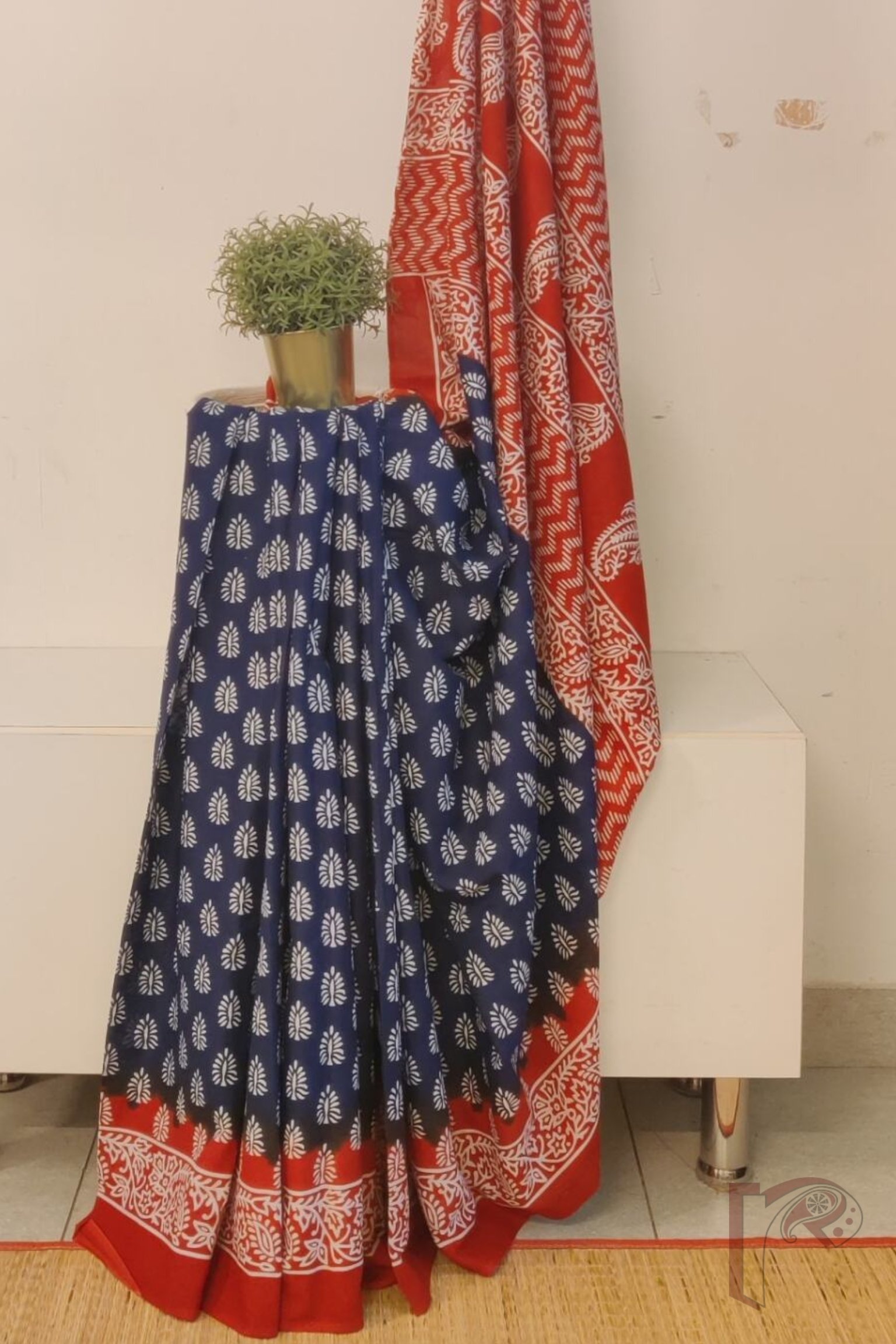 Mulmul Muse – Blue Mulmul Cotton Saree with White Floral Block Print, Red Border, and Traditional Red Pallu
