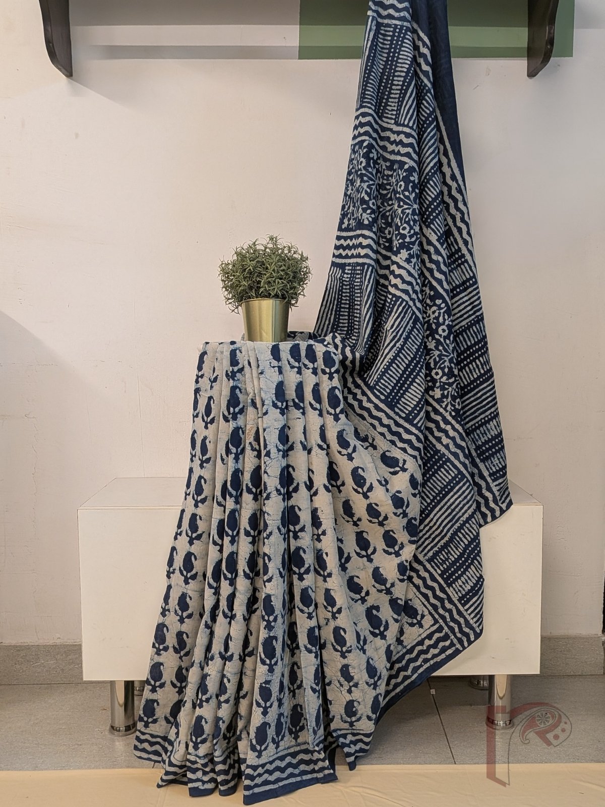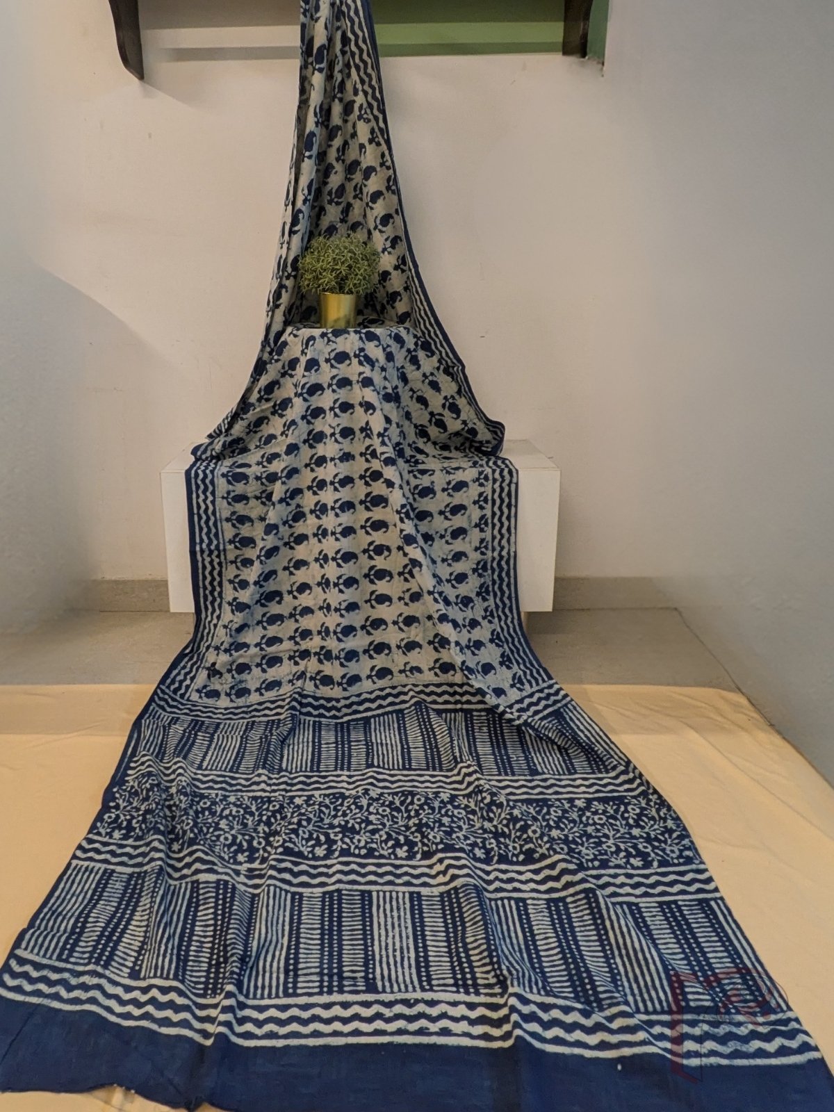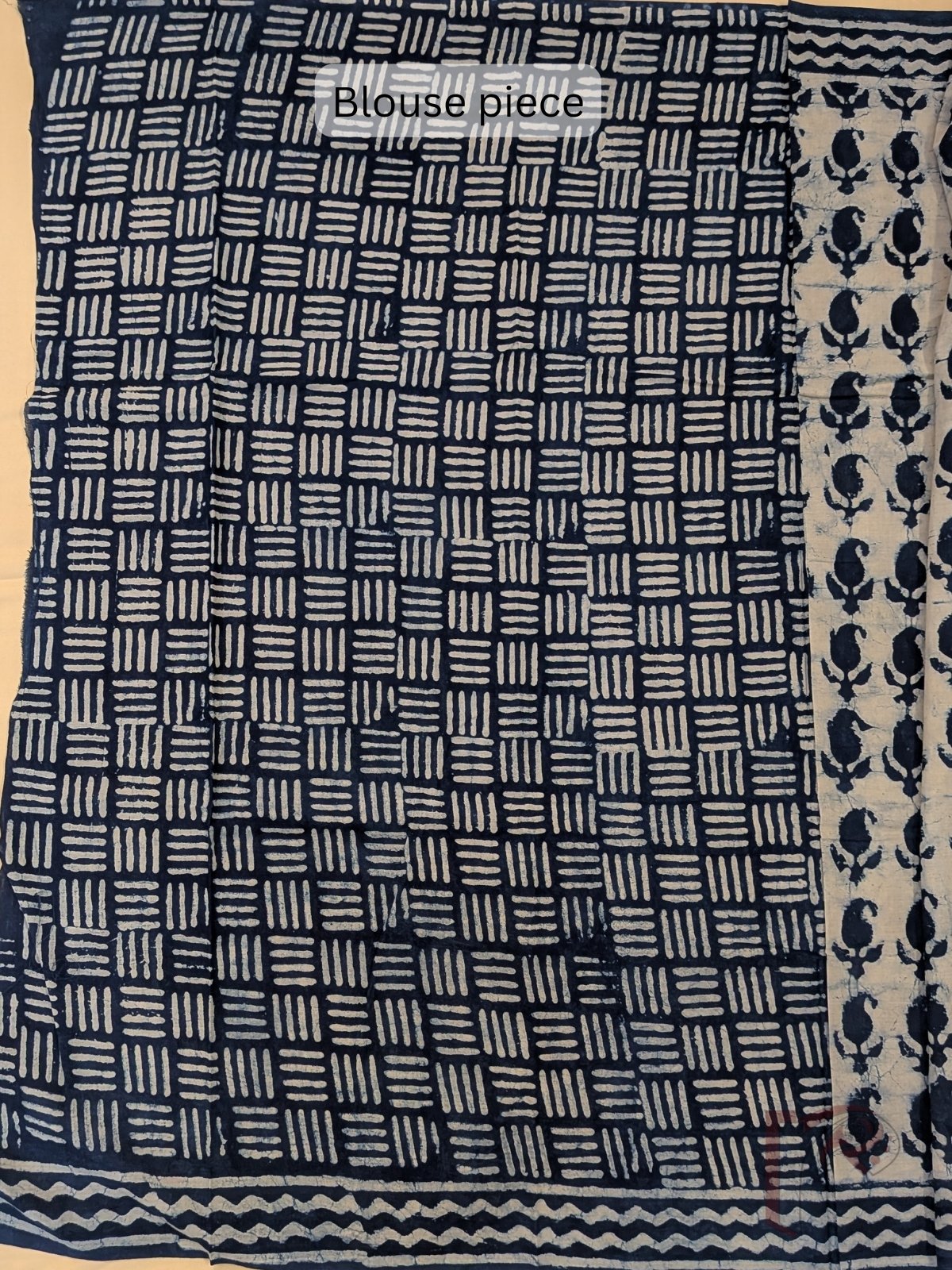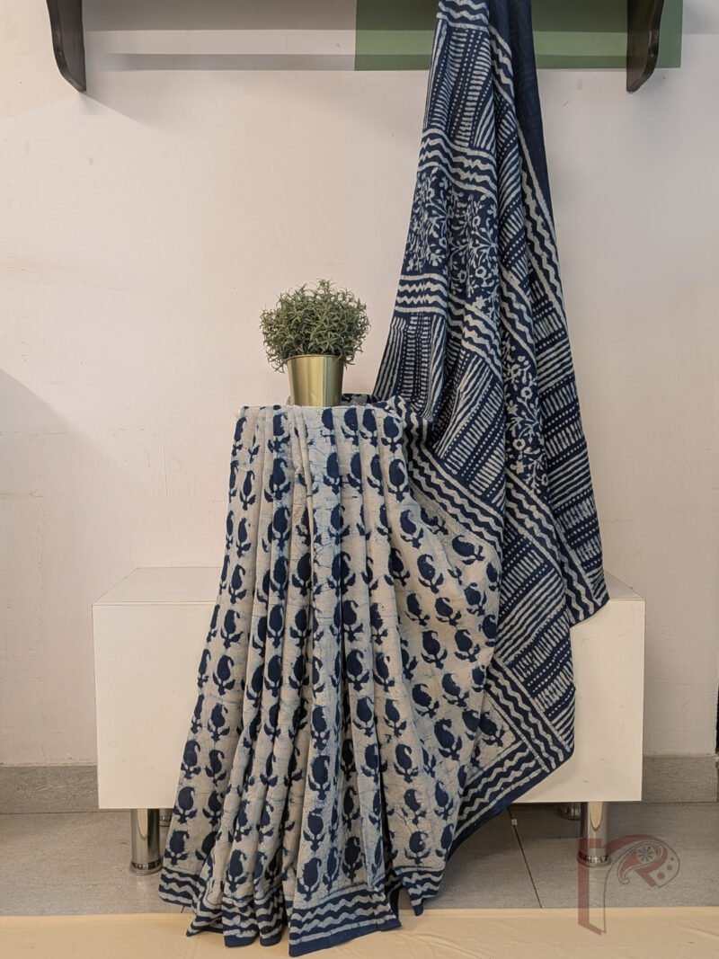 Elegant and rooted in tradition, this cream and indigo blue mul cotton saree features a soothing cream body adorned with equidistant kairi (mango) leaf motifs, creating a balanced and graceful visual rhythm. The saree is framed with a 3-inch indigo blue border enhanced with cream wave lines, adding subtle movement and contrast. The pallu in deep indigo blue is beautifully detailed with cream block prints in a mix of floral and linear patterns, giving it a striking handcrafted appeal. Crafted from soft, breathable mul cotton, this saree offers effortless drape and all-day comfort. The ensemble is completed with a blue blouse featuring cream dash lines arranged in a box-like grid, tying the design together with understated sophistication.