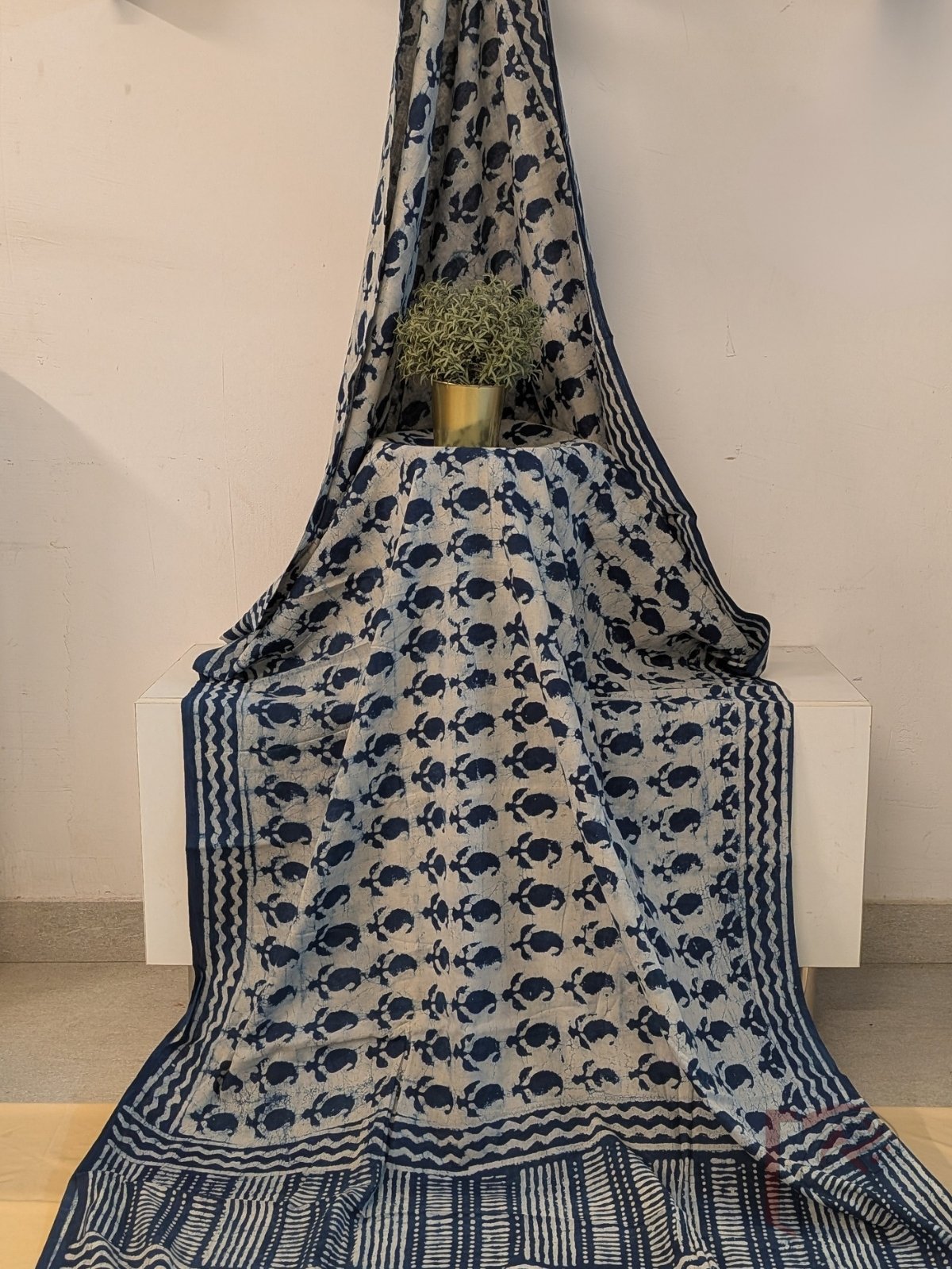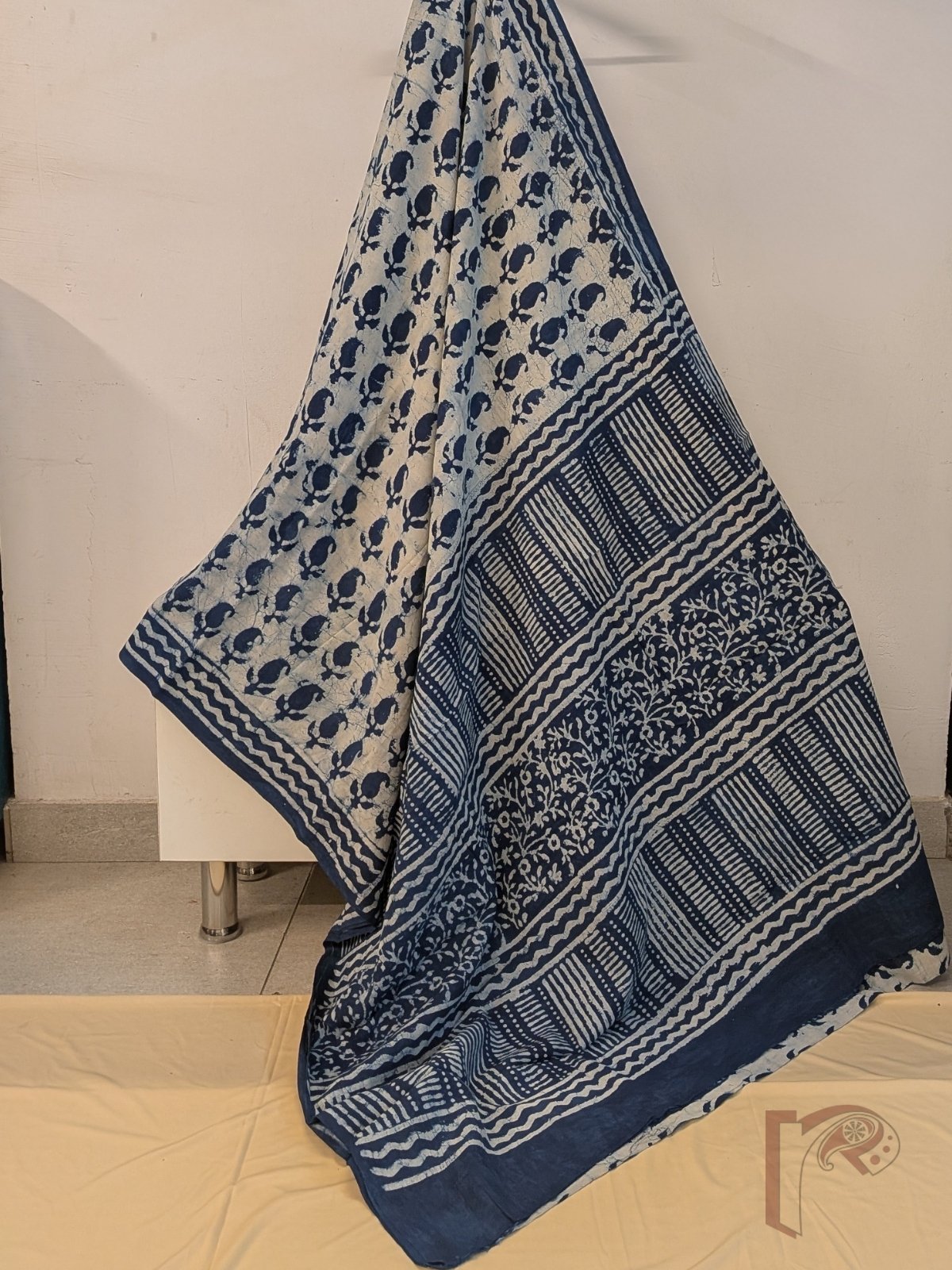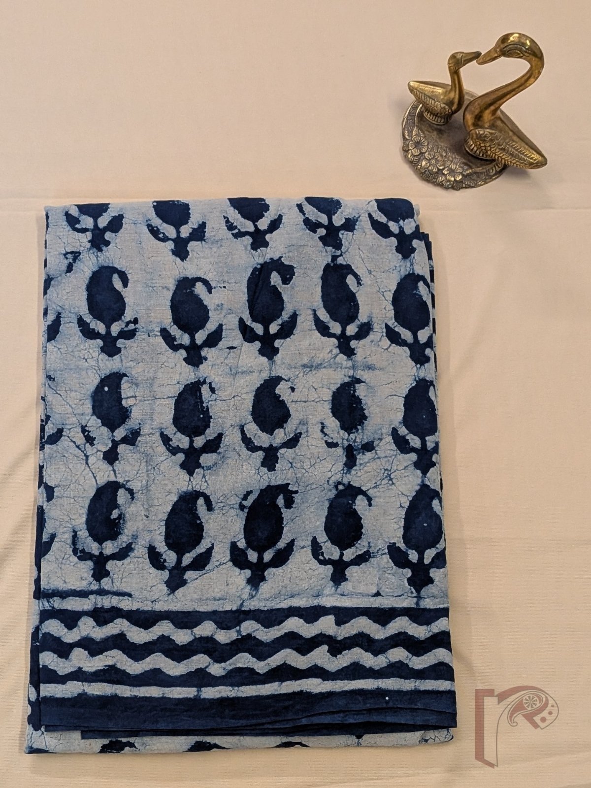 Mulmul Muse – Cream and Indigo Blue Mul Cotton Saree with Kairi Motifs and Wave Border